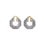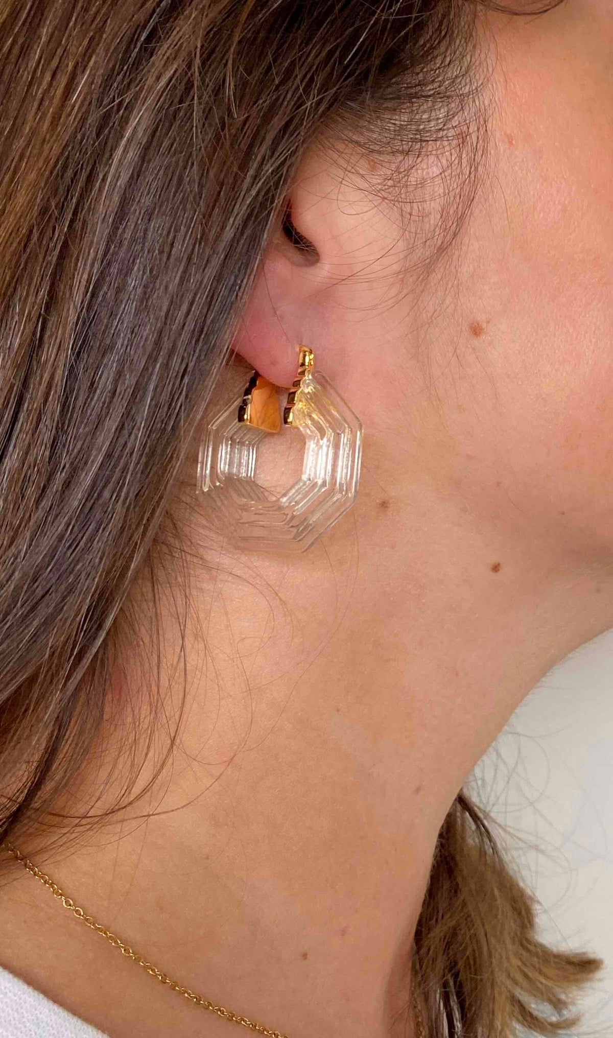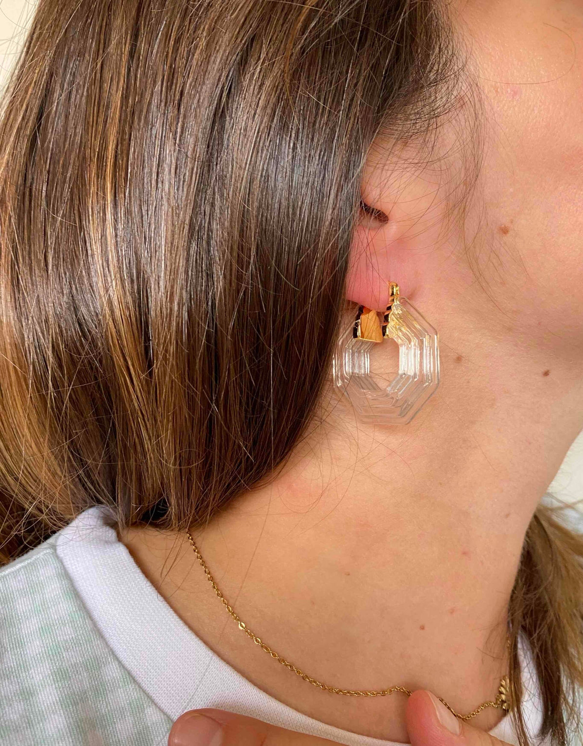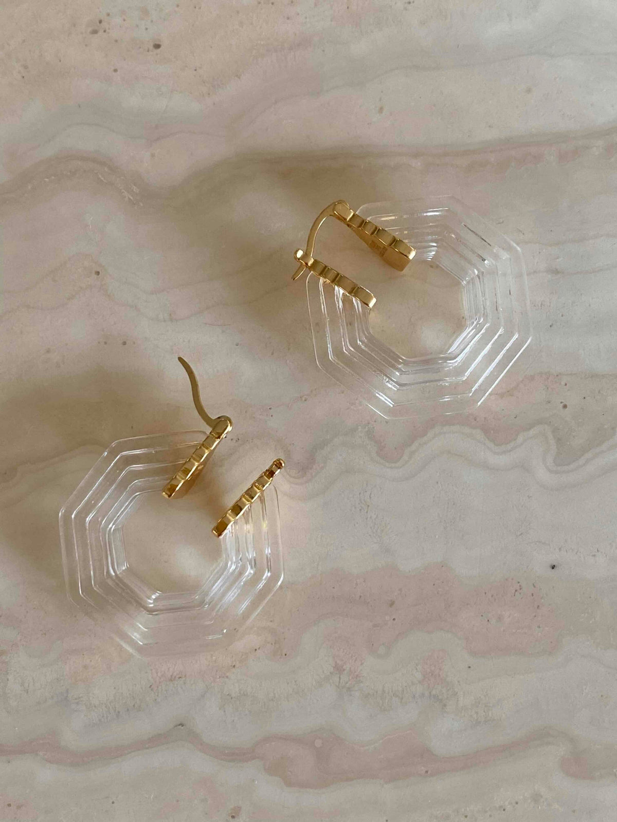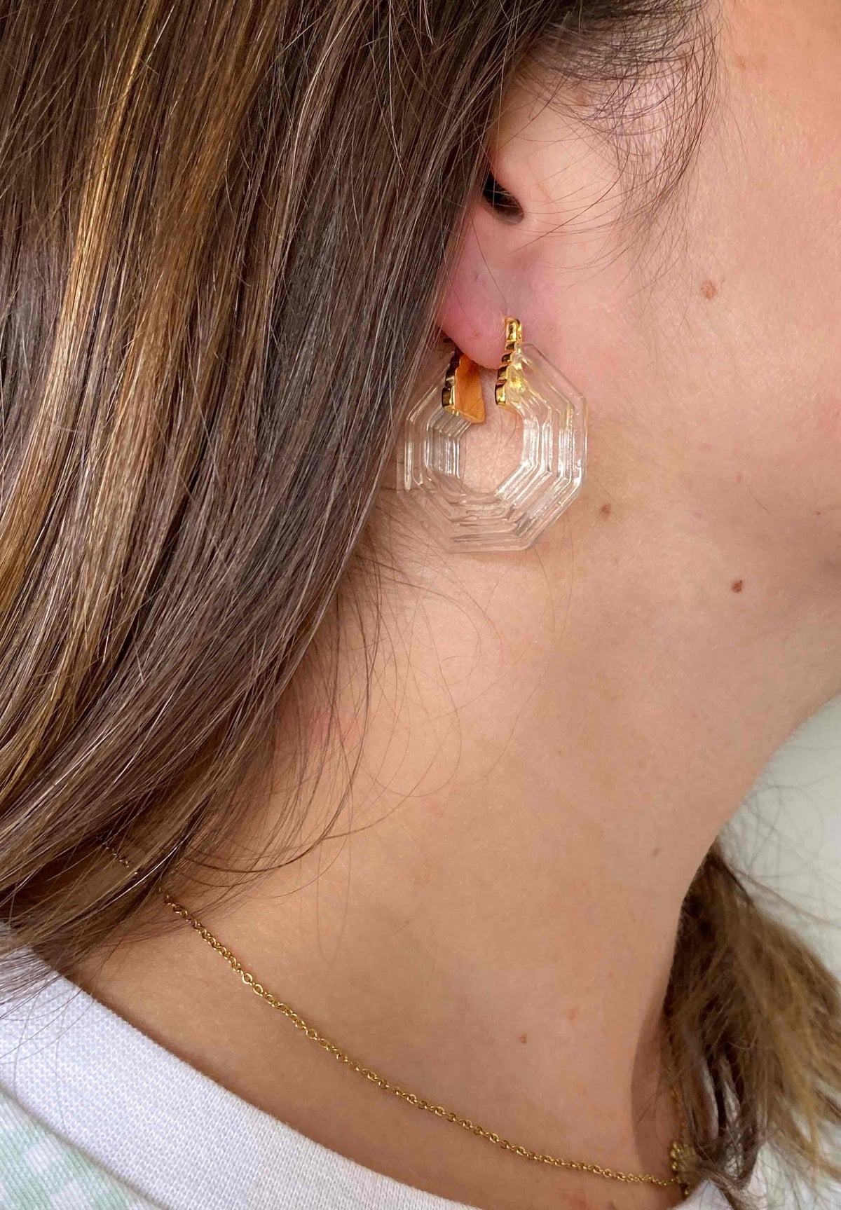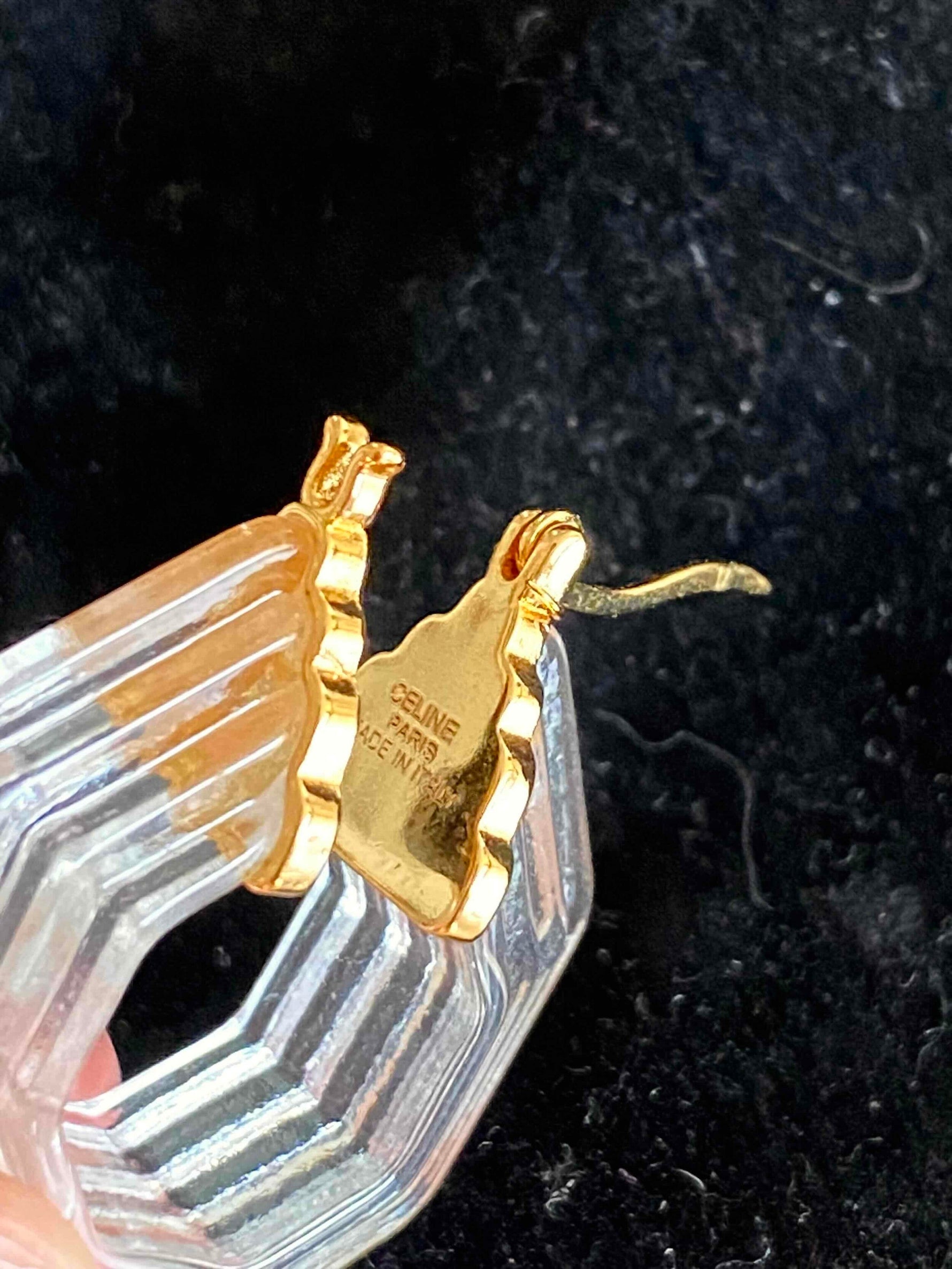 Unit price perCeline Hoop earrings, in gold-plated and transparent acetate resin, geometric striped hexagonal shape, notched stem, made in Italy, rare vintage piece from the 80s, 3.8cm x 3.8cm.
