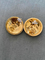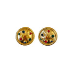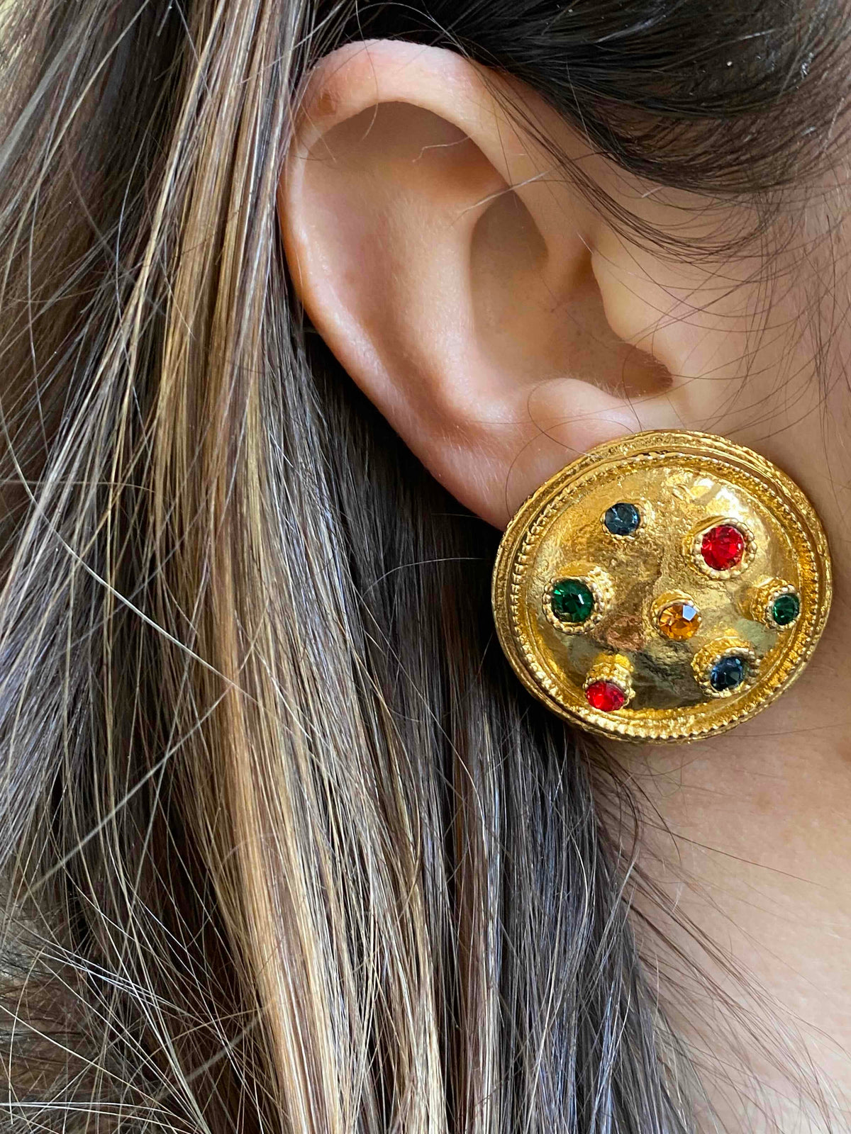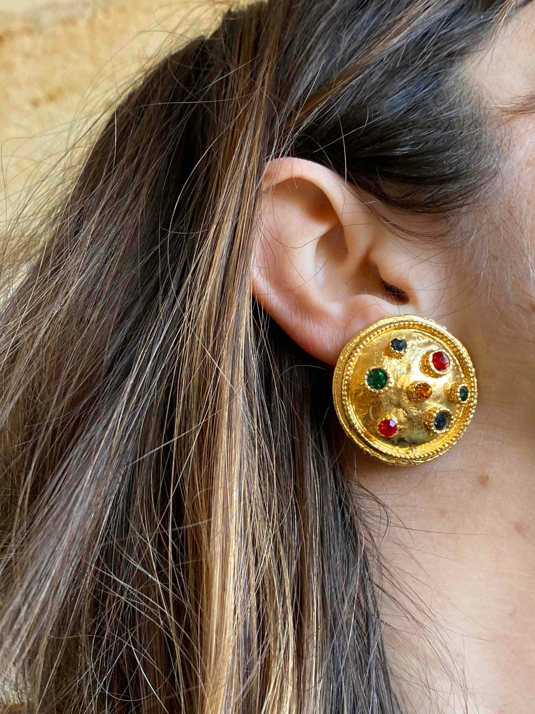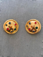 Unit price per80's clip-on earrings in gold-plated brass and multicolored rhinestones in red, green, orange and blue, 80's style, 3.5cm diameter.
