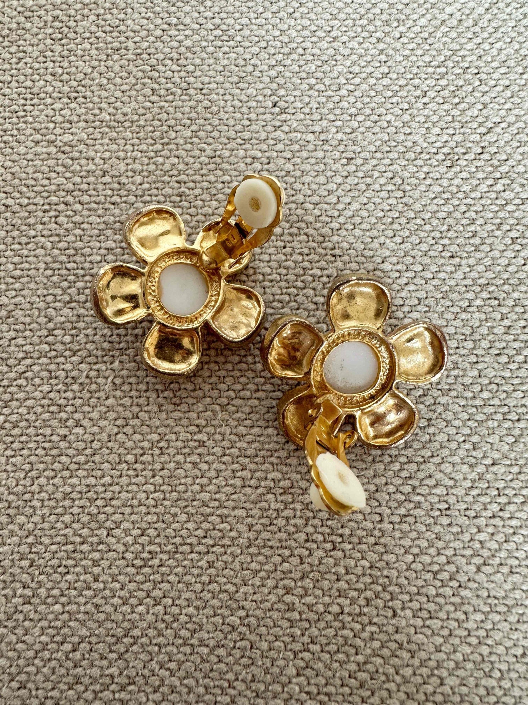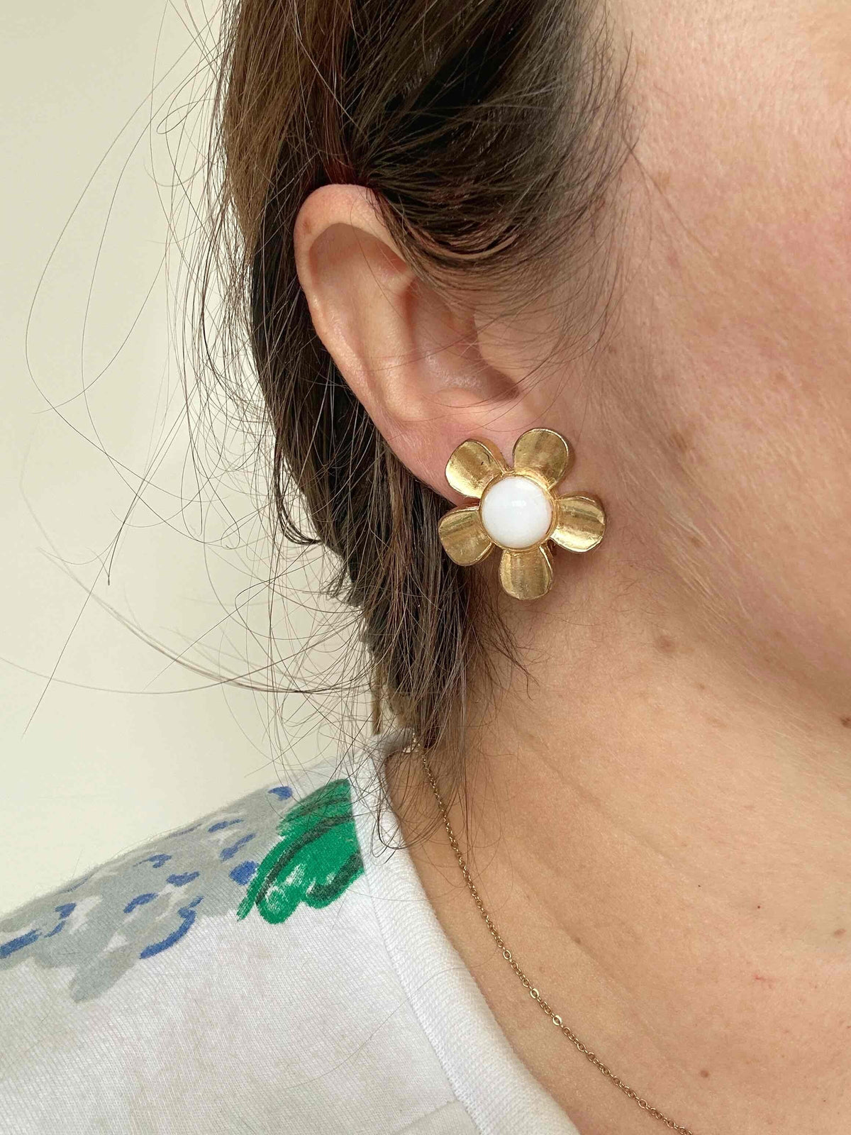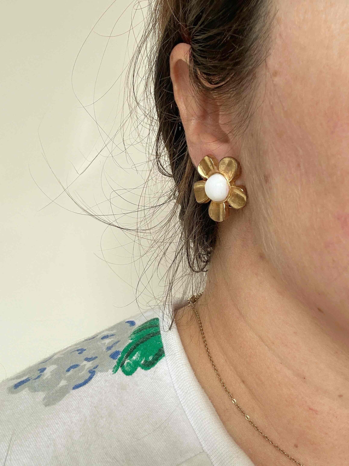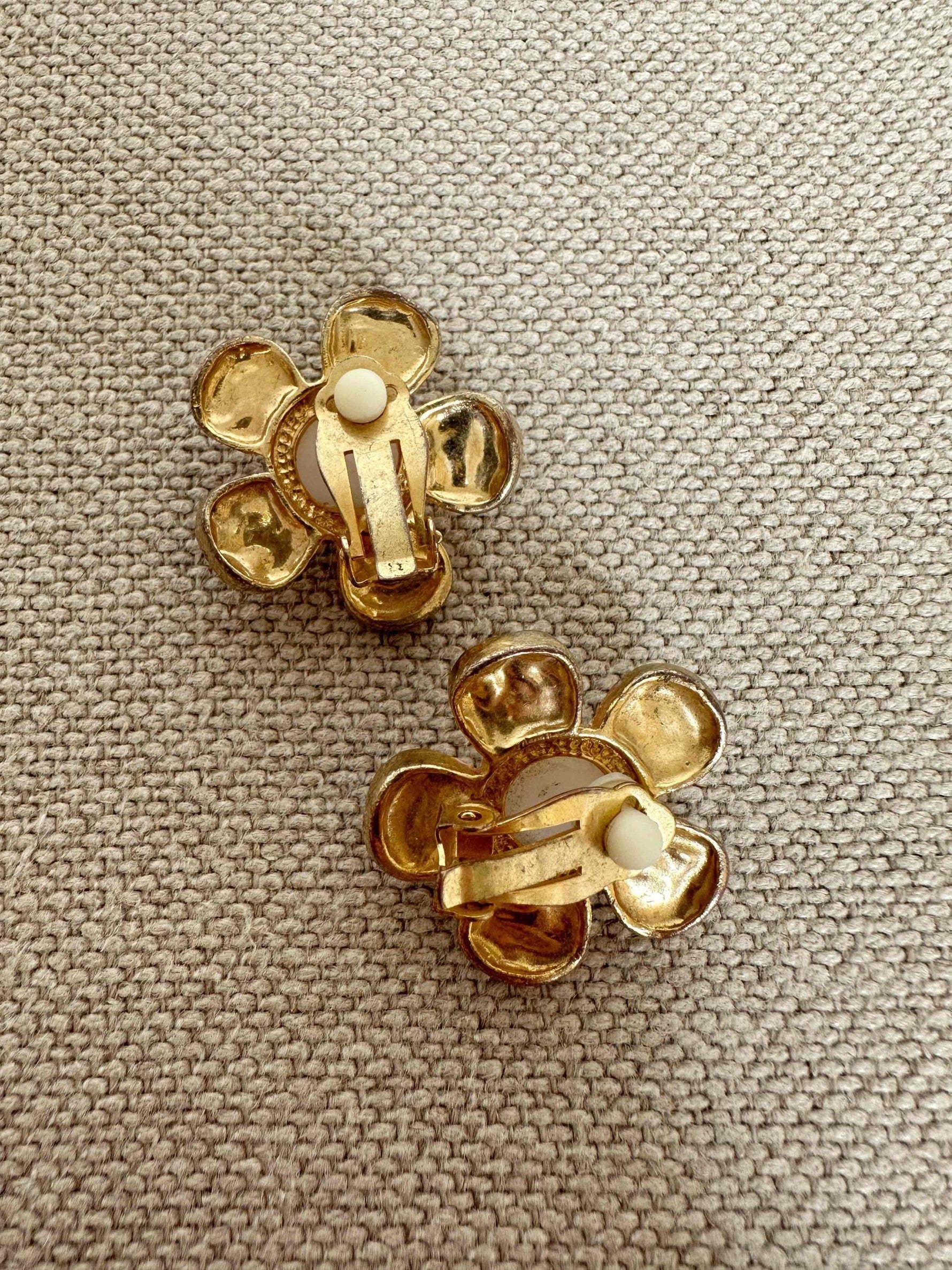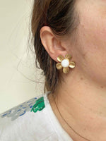 Unit price perClip-on flower earrings, gold-plated brass, flower-shaped, white pearl heart, 80s style.