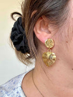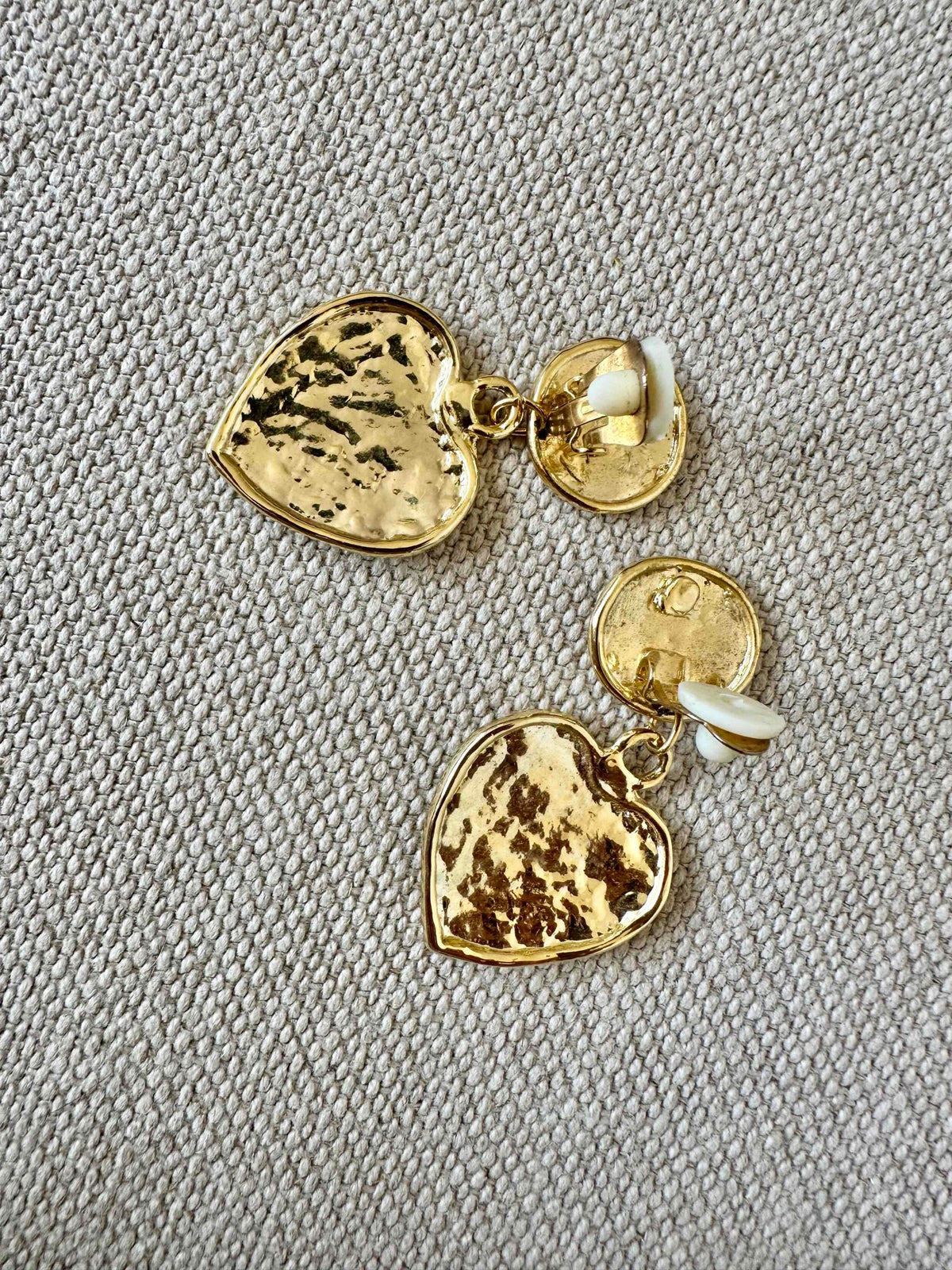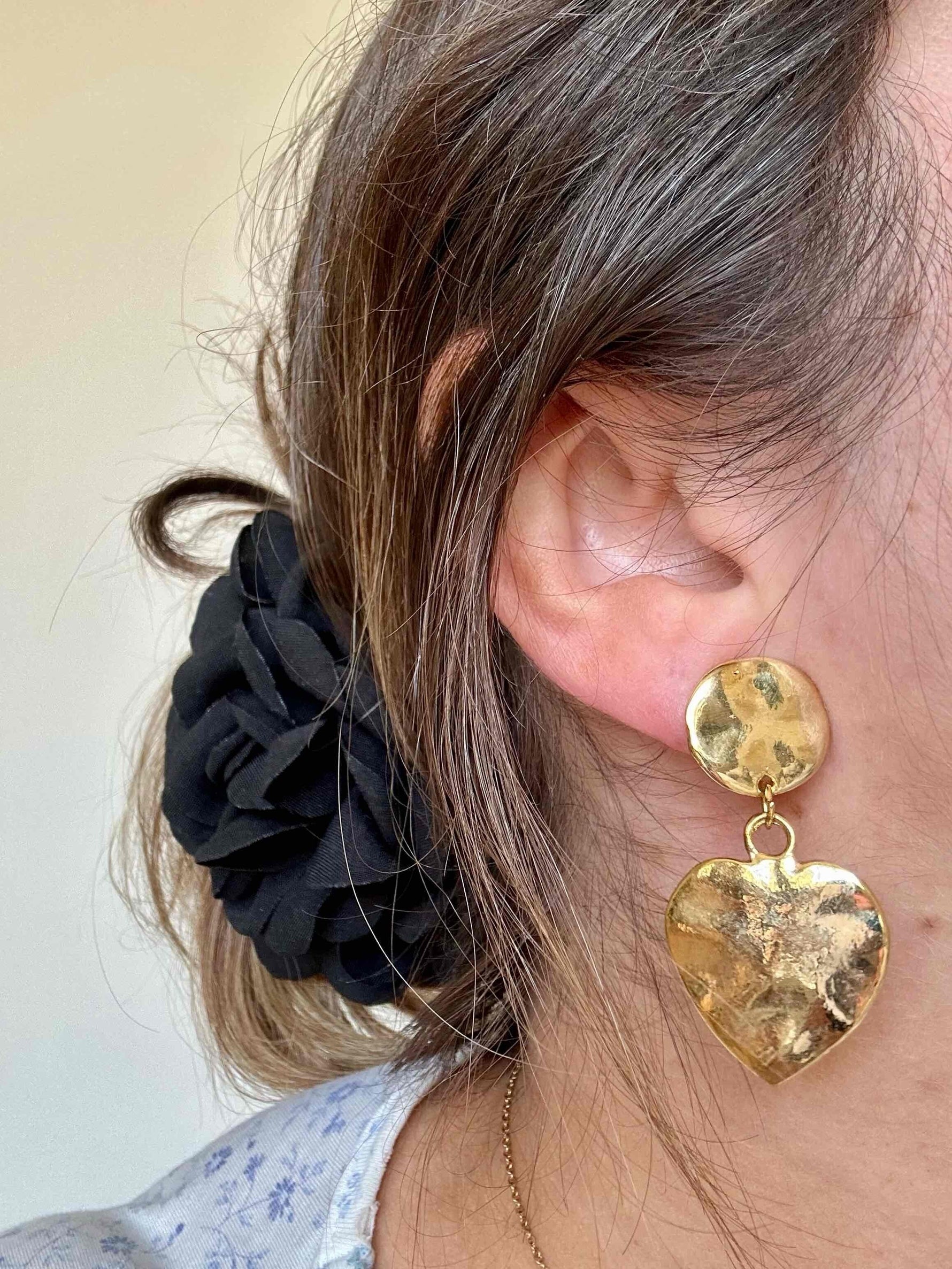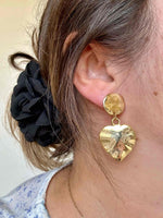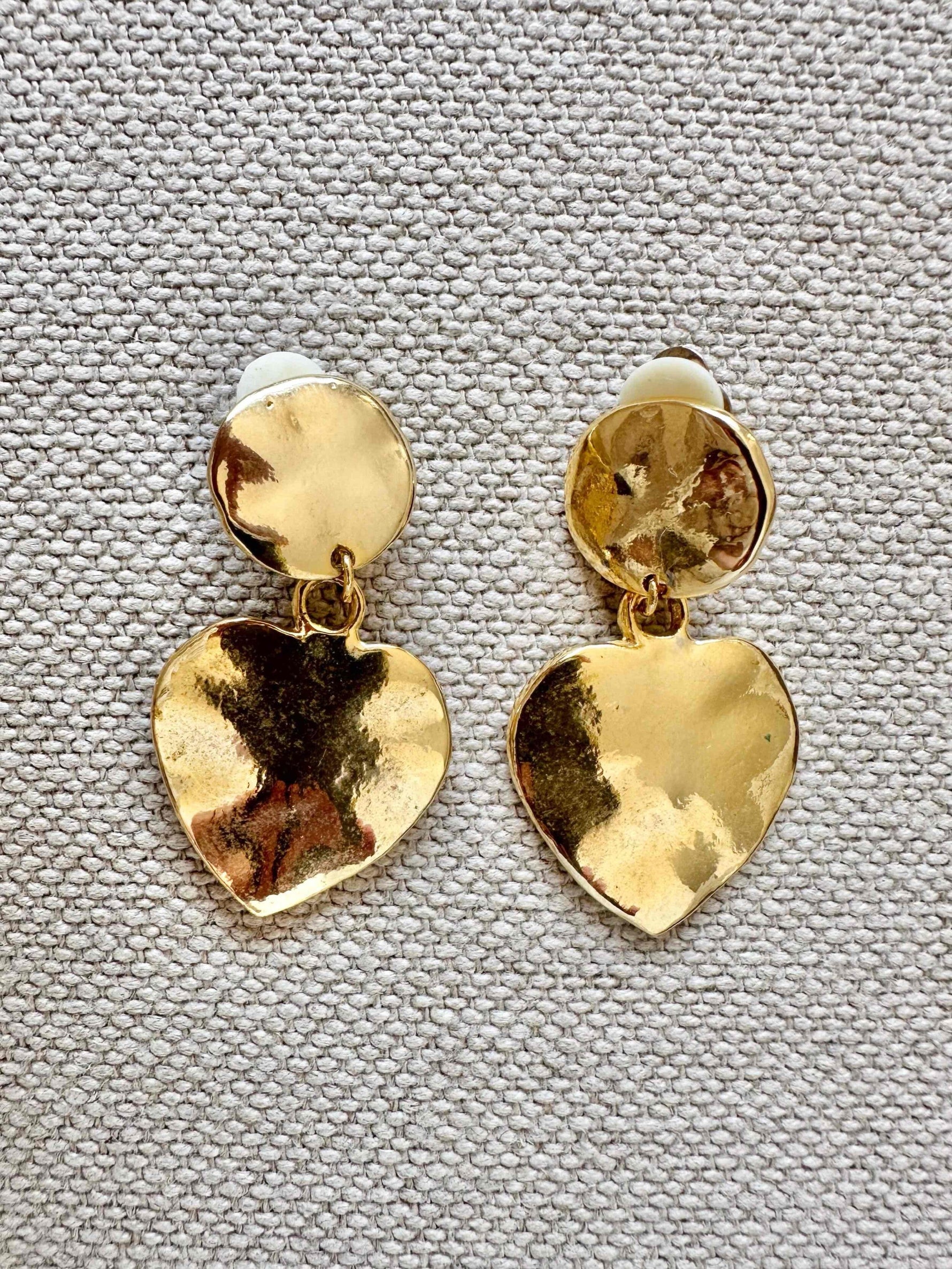 Unit price perHeart clip-on earrings, in gold-plated brass, with a hammered disc and heart pendant, 5cm long, 3cm wide.