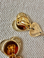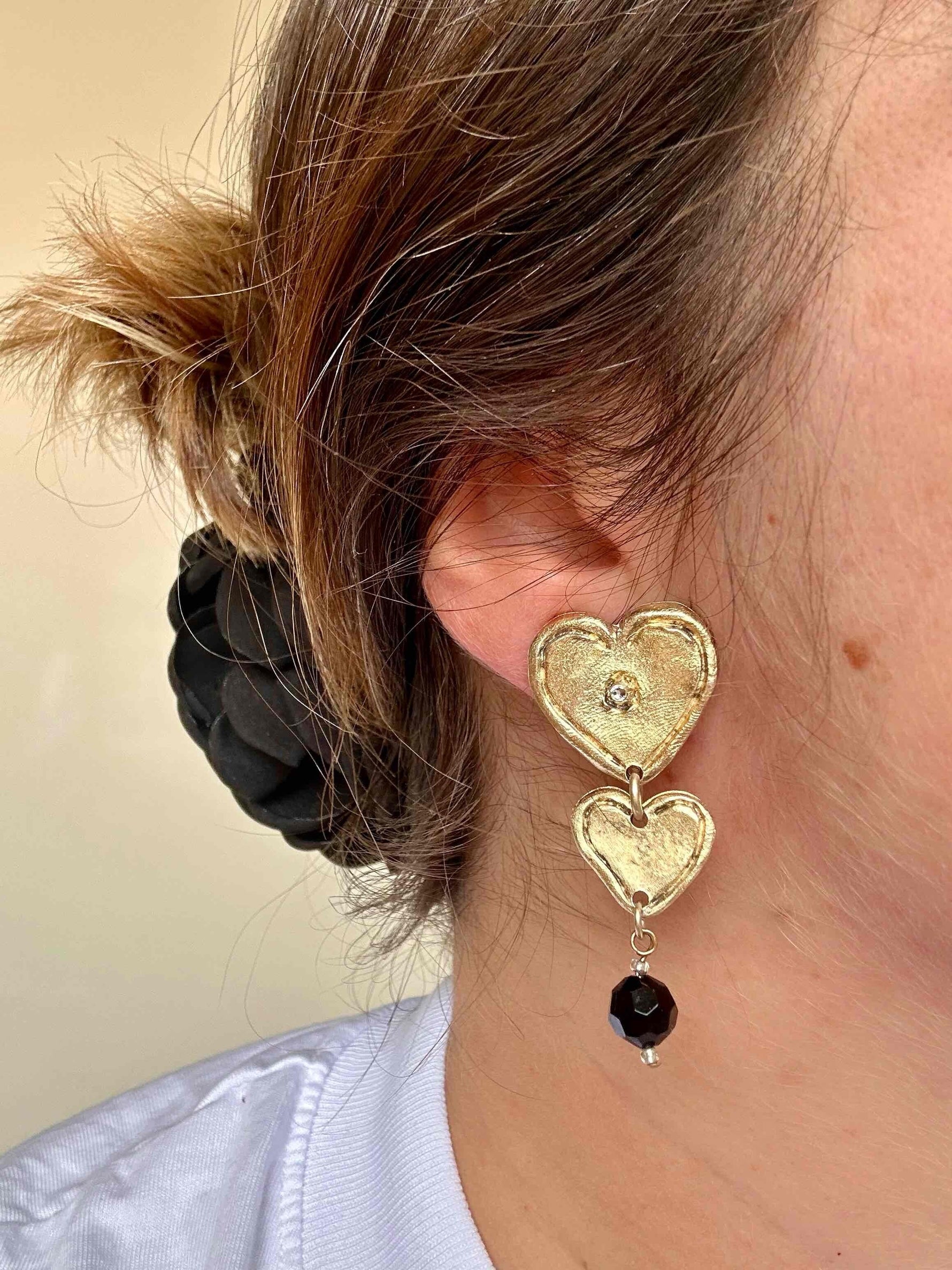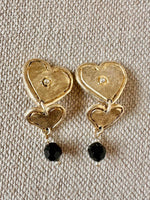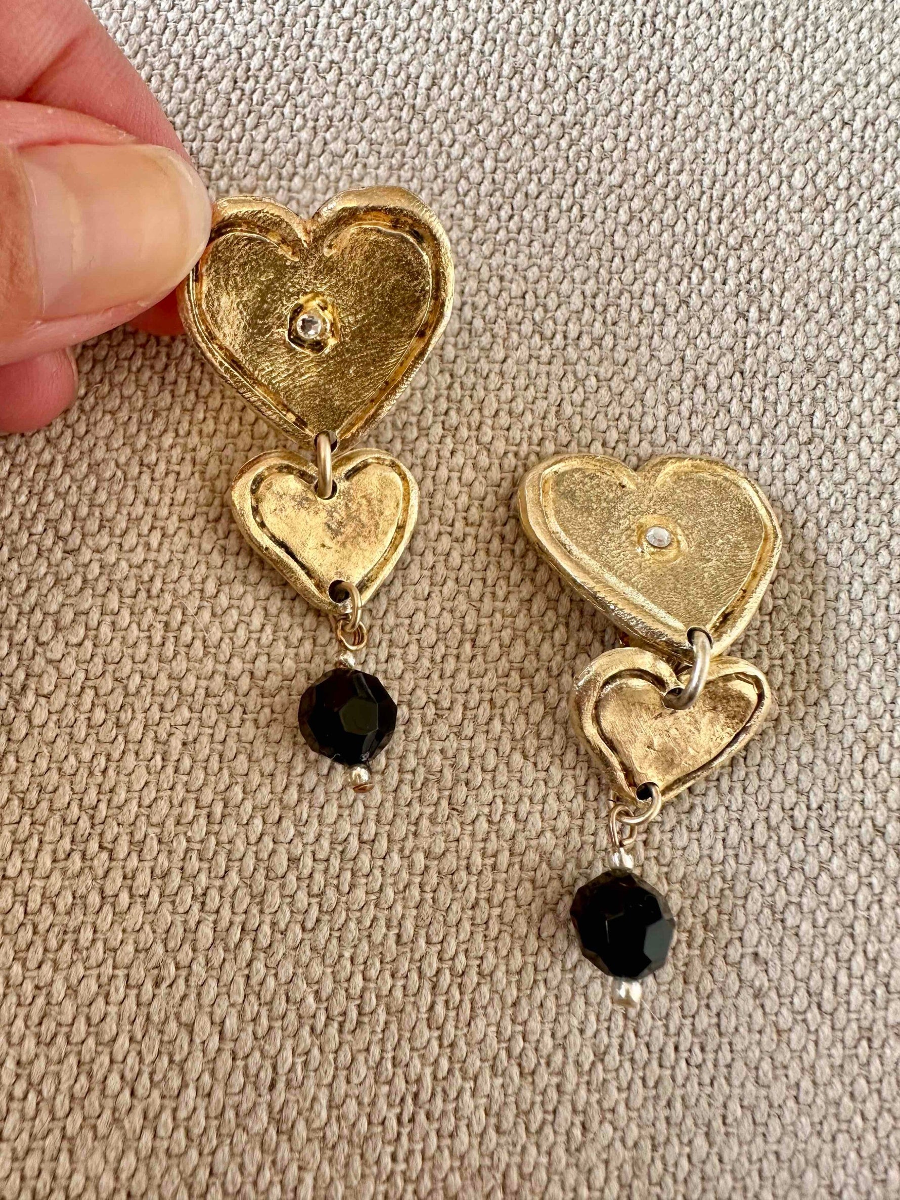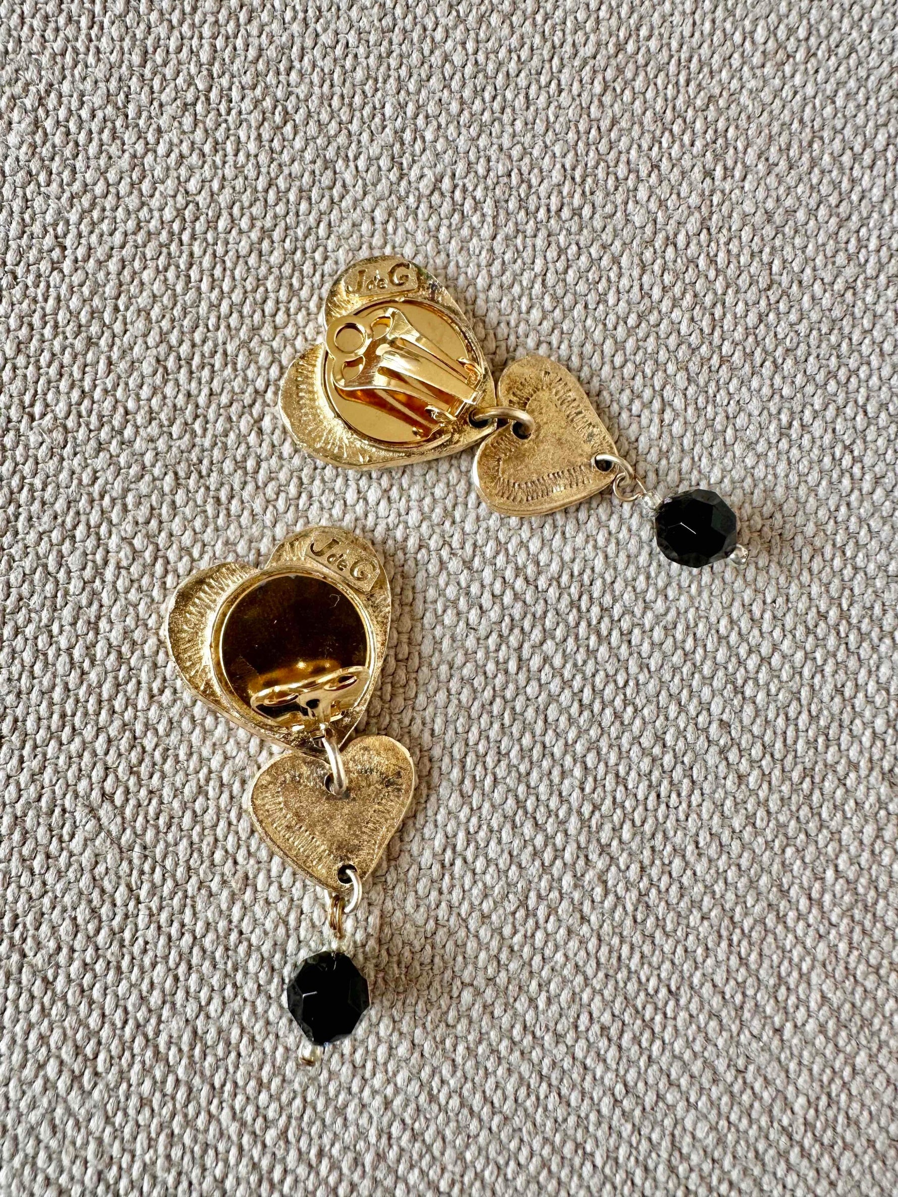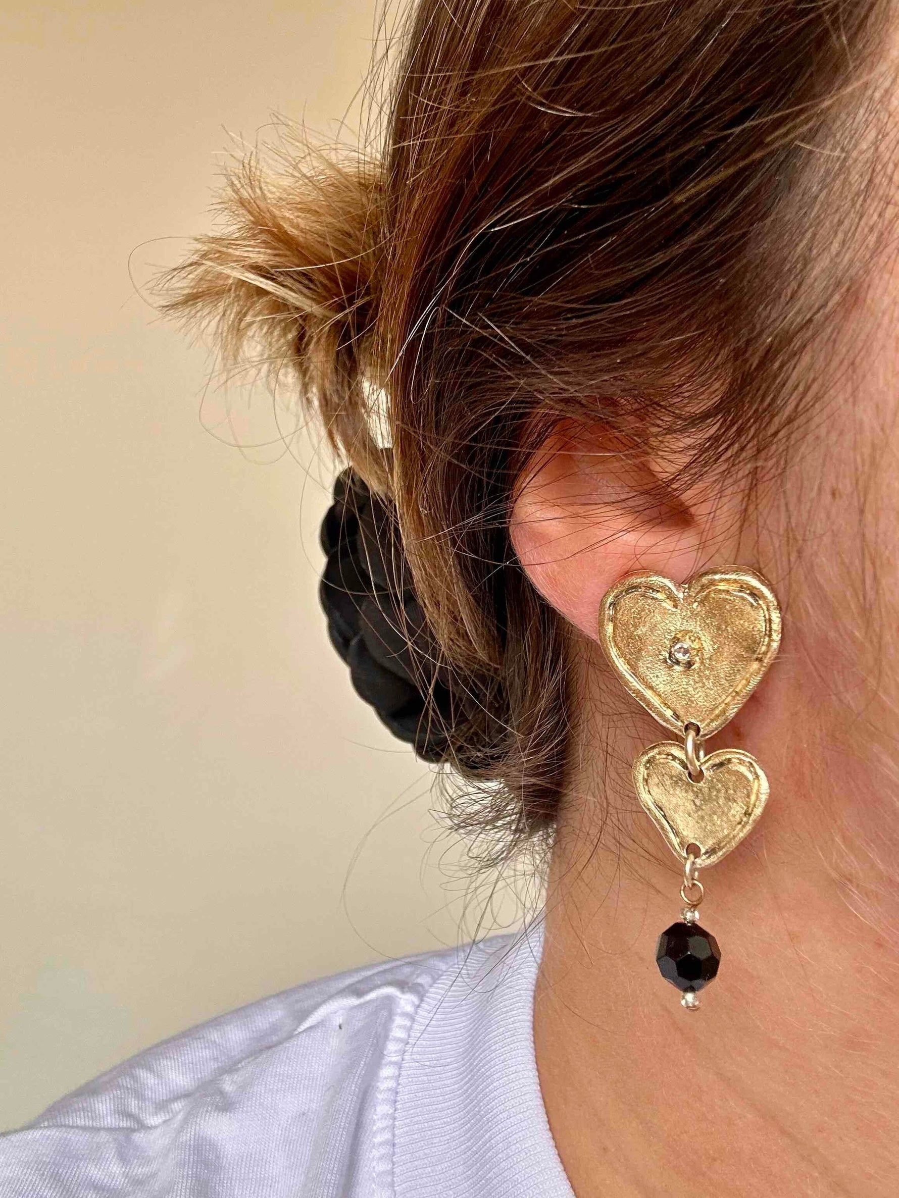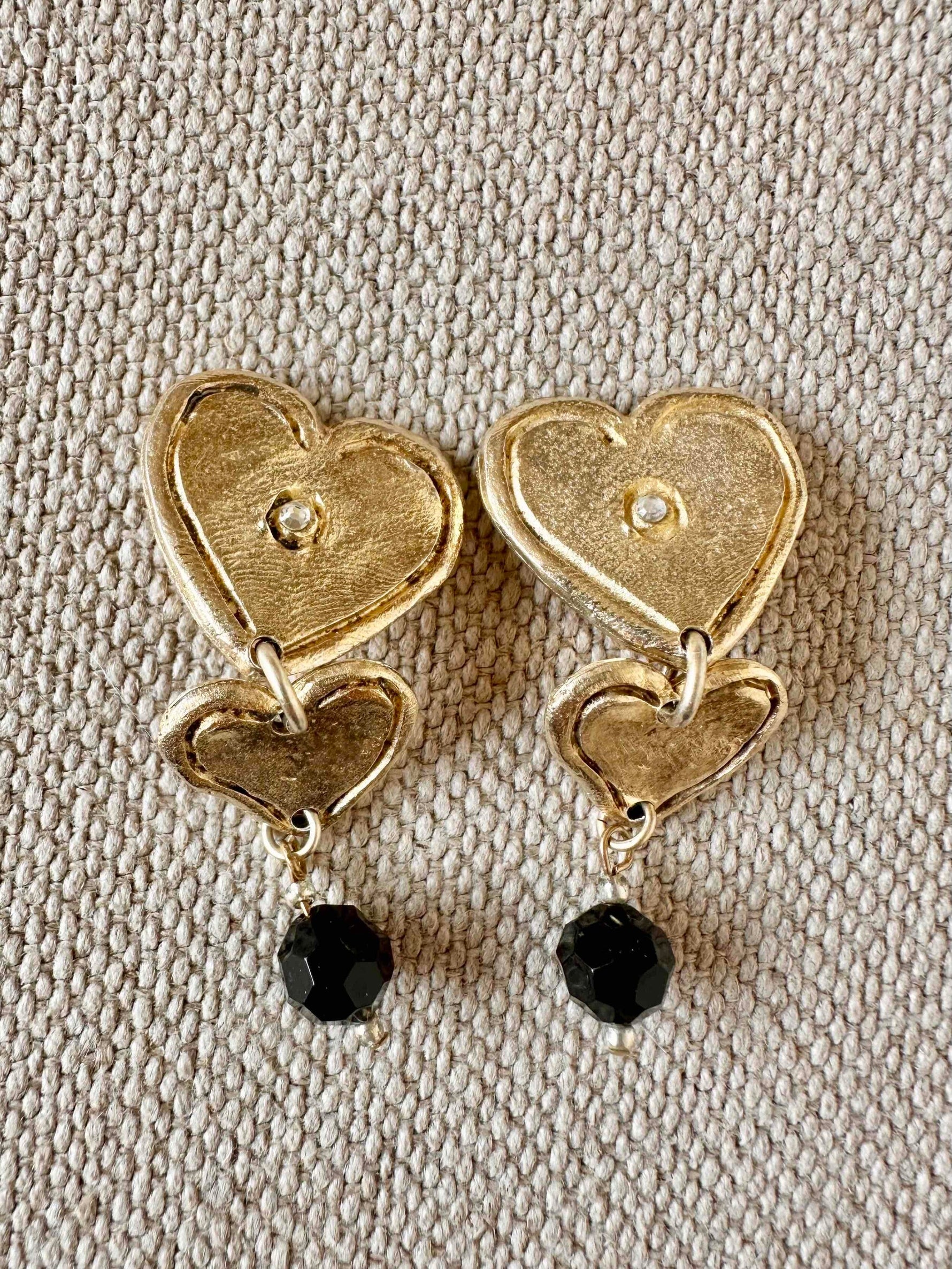 Unit price perHeart-shaped clip-on earrings, Jacky de G, in gold-plated brass, in the shape of hammered hearts, with a small inlaid rhinestone and a black glass pearl, made in France, 1980s, 5cm long x 2.5cm wide.