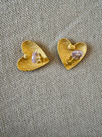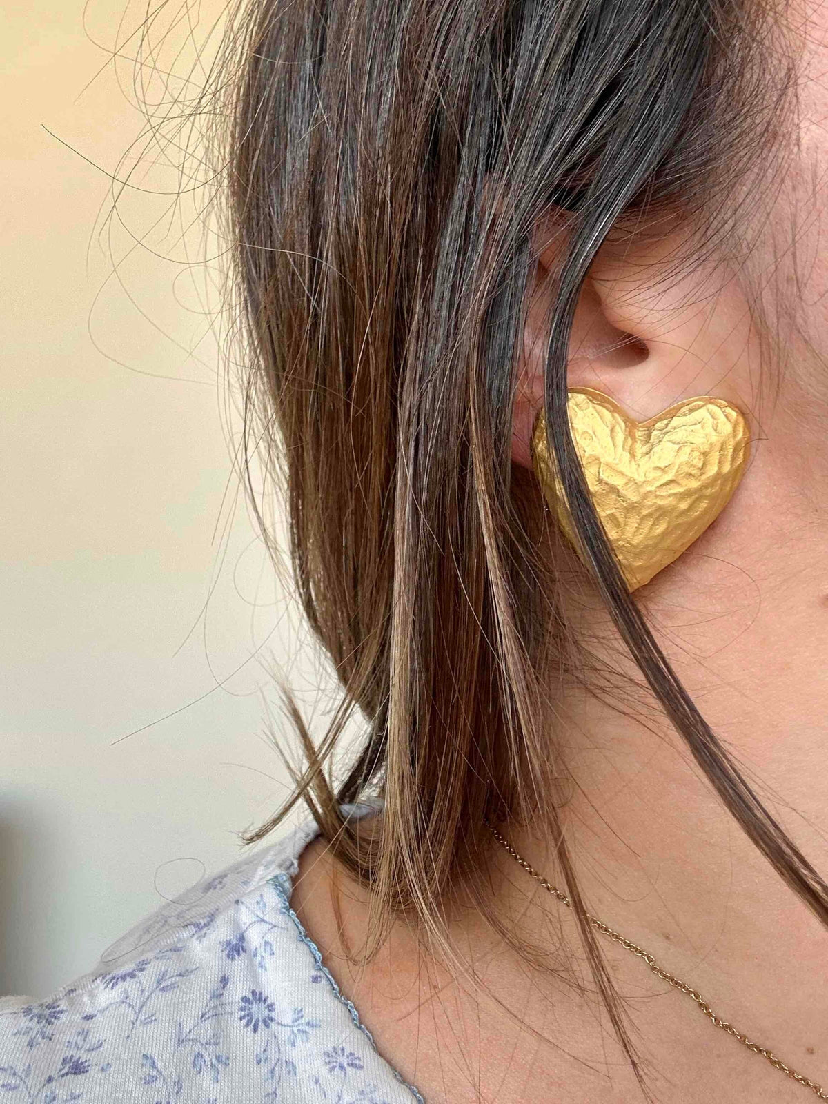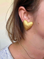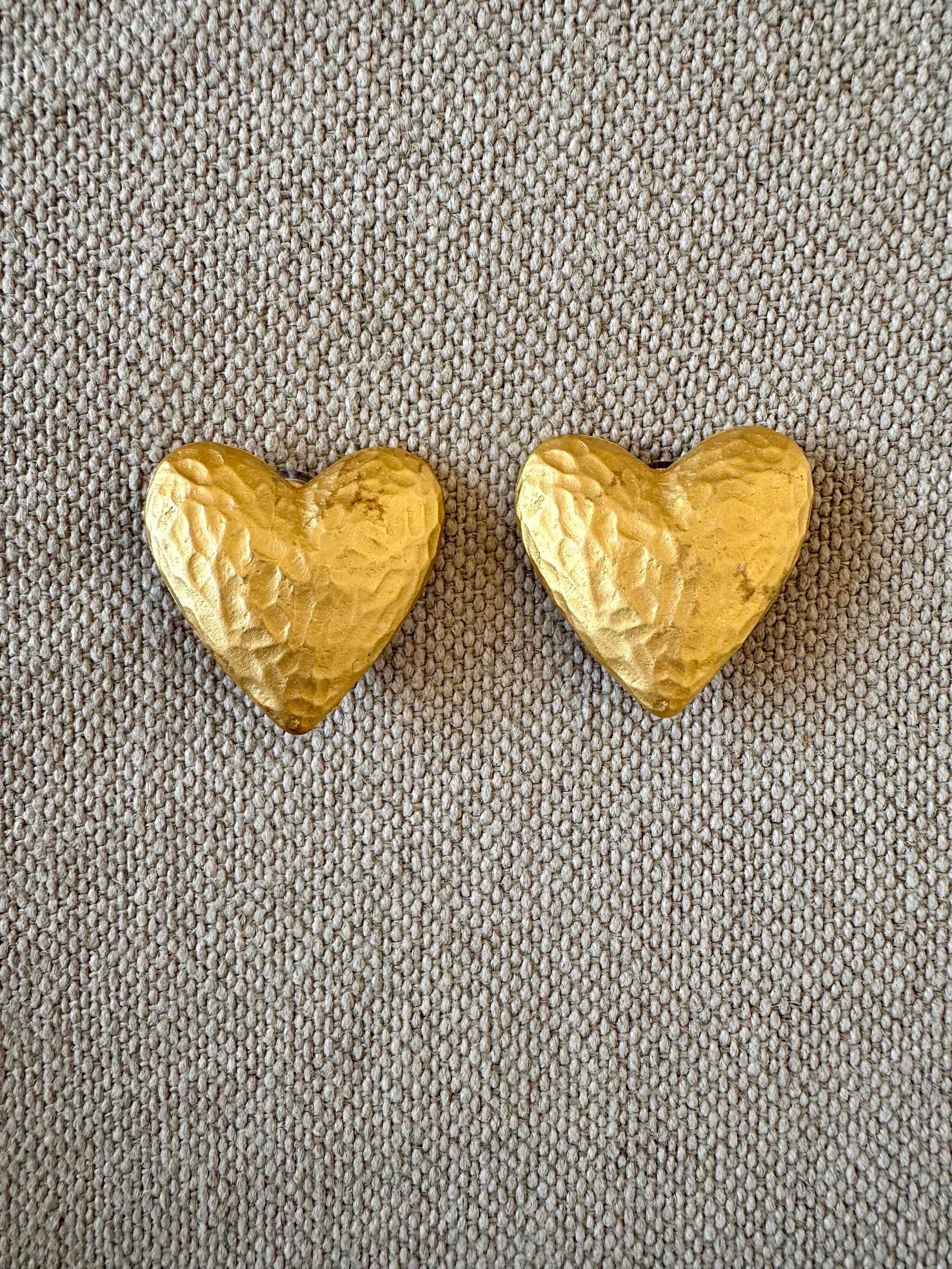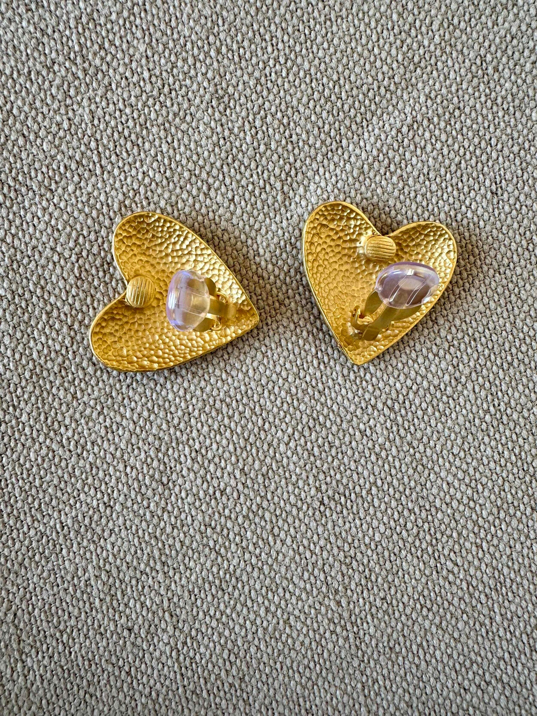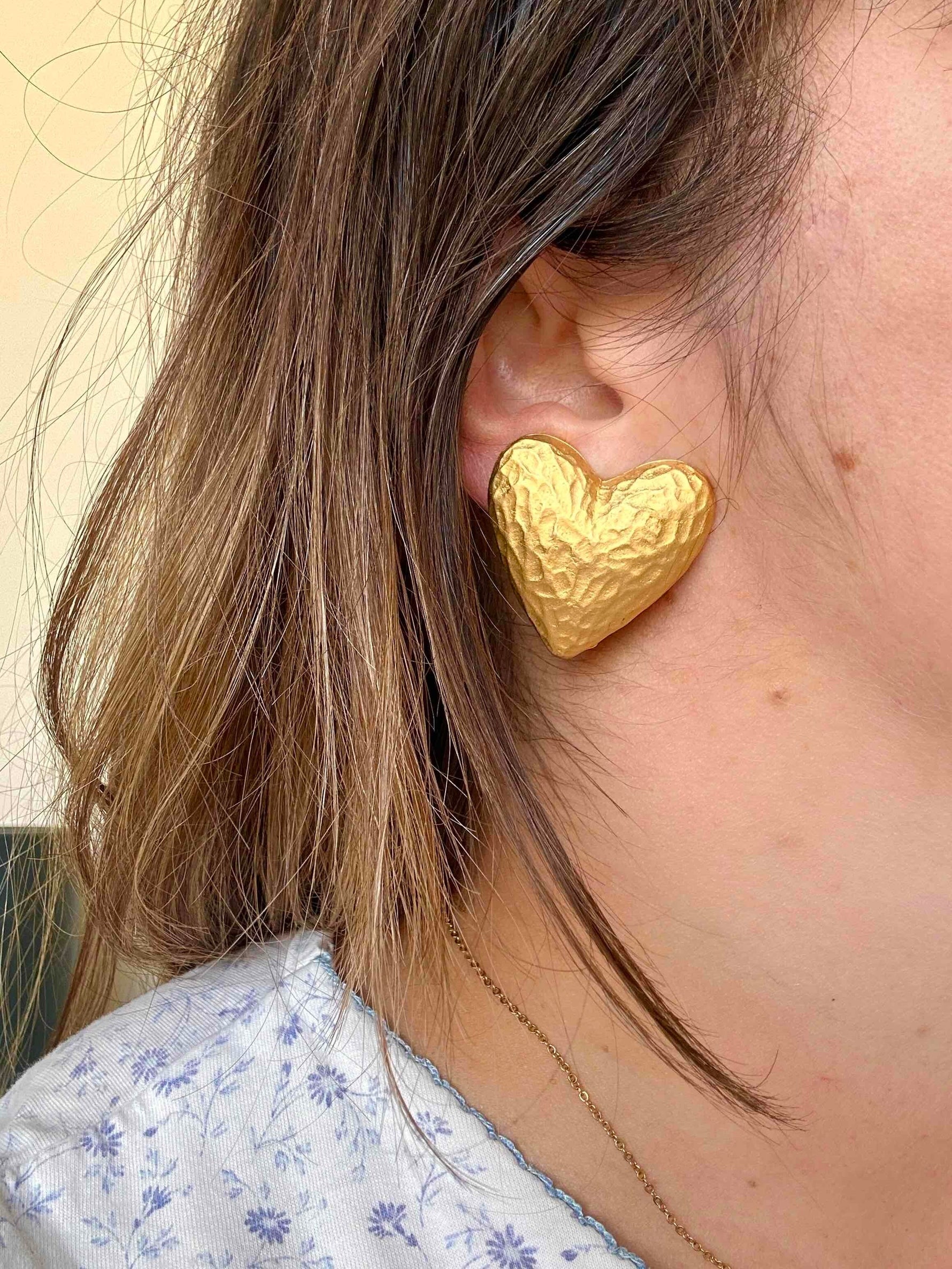 Unit price perClip-on heart earrings, in matte gold-plated brass, hammered texture, 80s style, 3.5cm x 3.5cm.