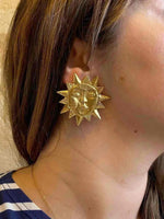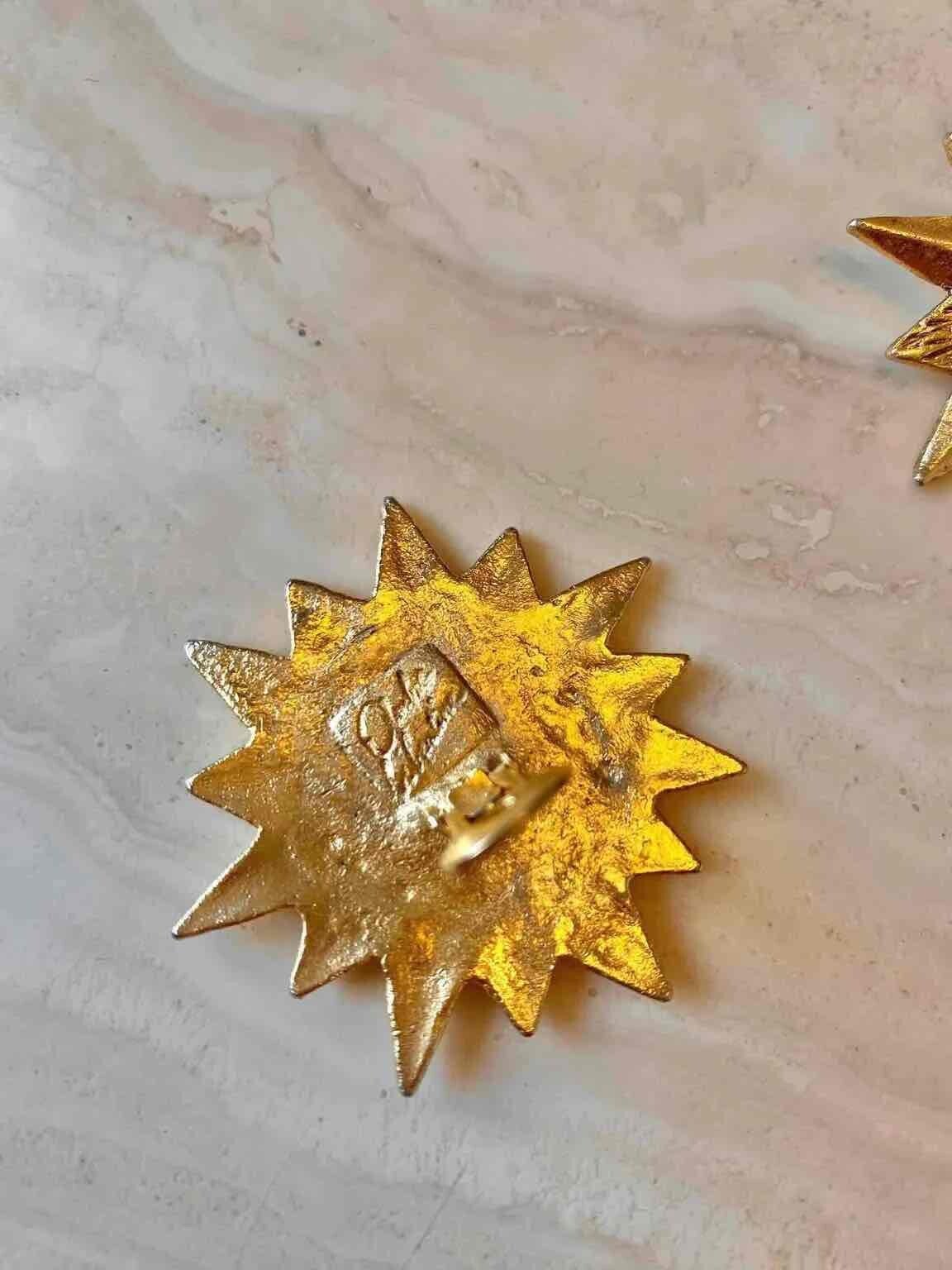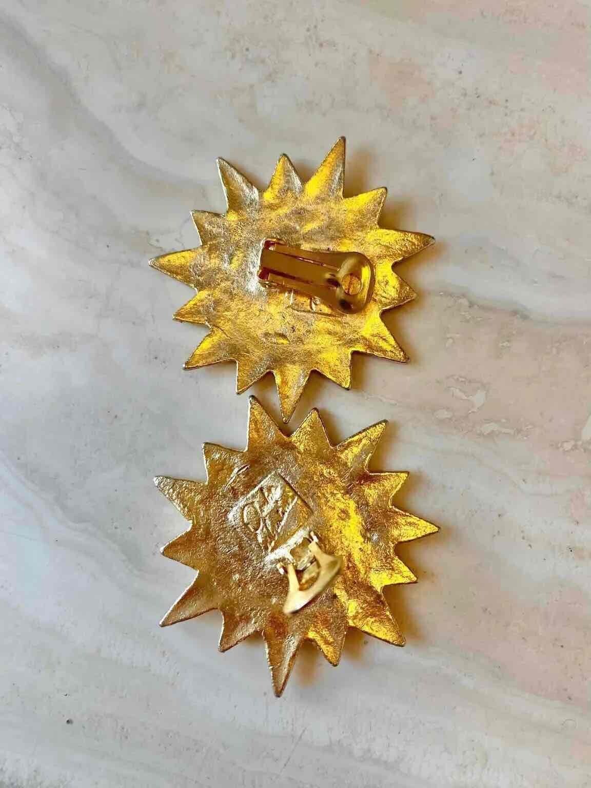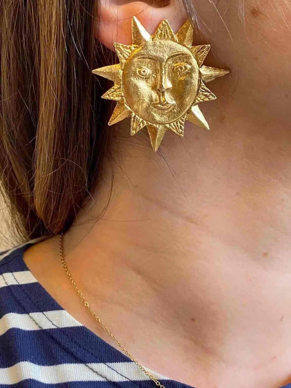 Unit price perSun earrings, Ombre Libertine designer clip-ons, gold-plated brass, sun and face shape, made in France, 80's, 5cm x 5cm.