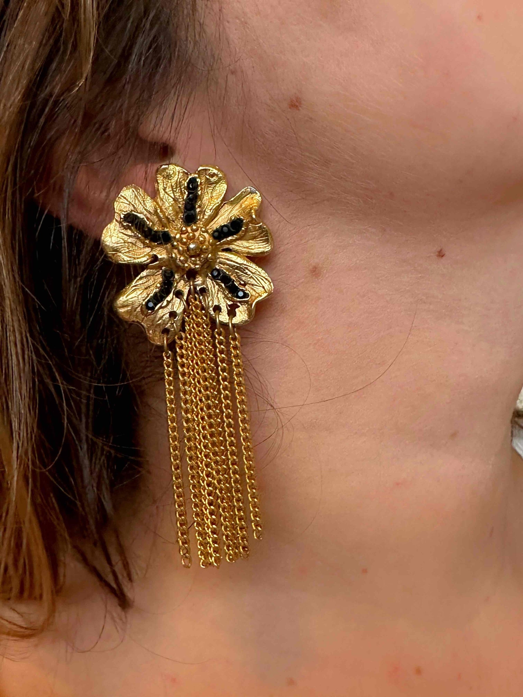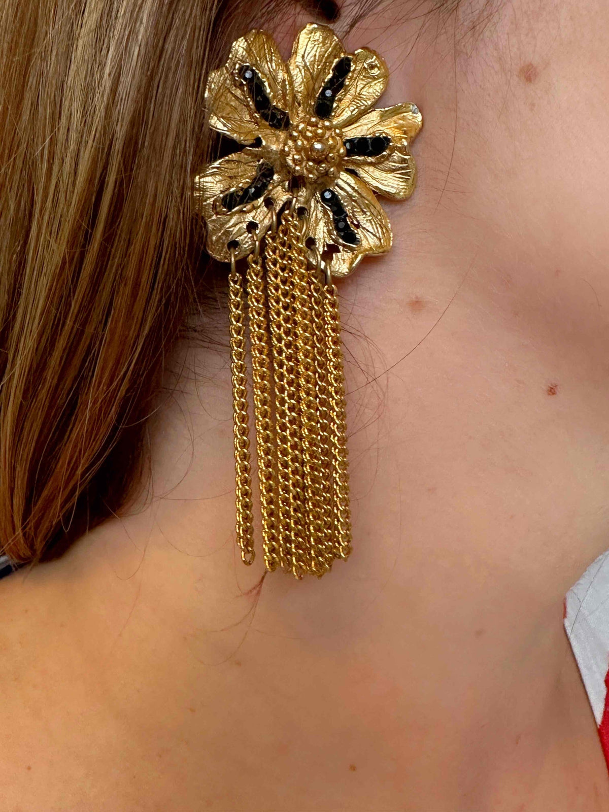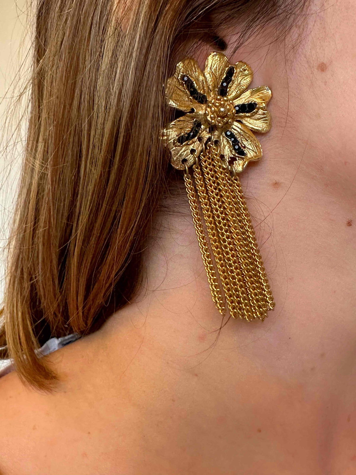 Jacky de G clip-on earrings, in gold-plated brass, large camellia flower encrusted with black glass crystal rhinestones, dangling chains in a Riviera style, 9cm long, 4.5cm diameter. Made in France, 1980s.