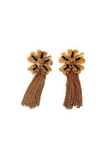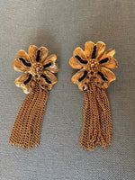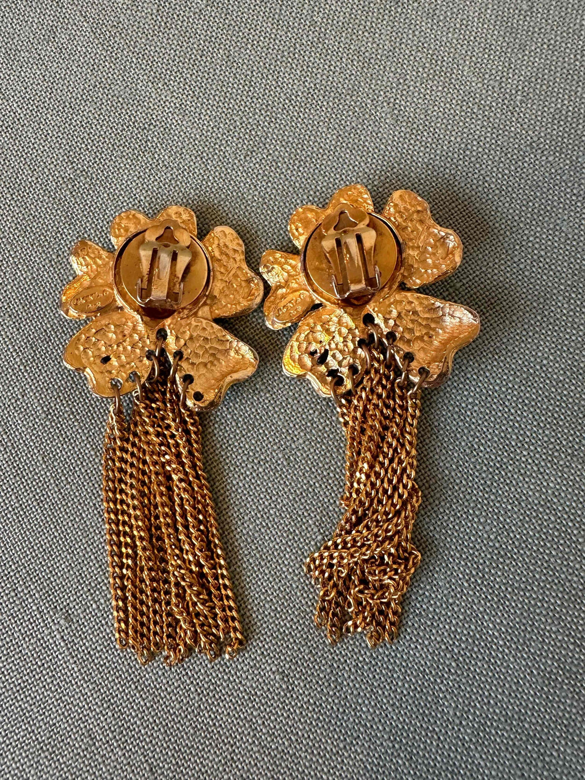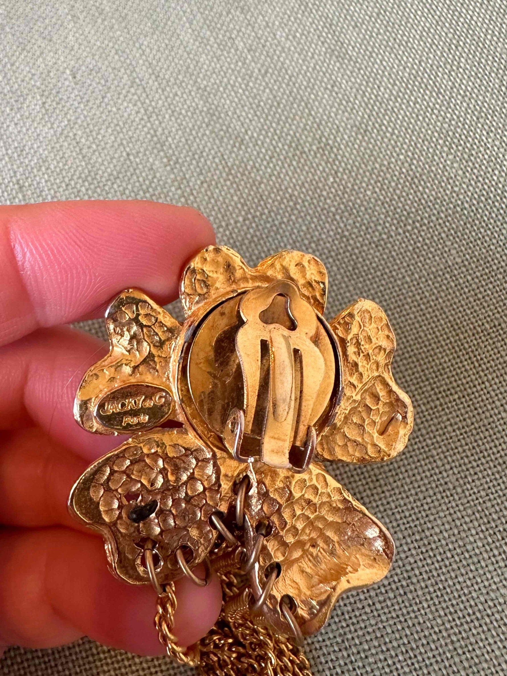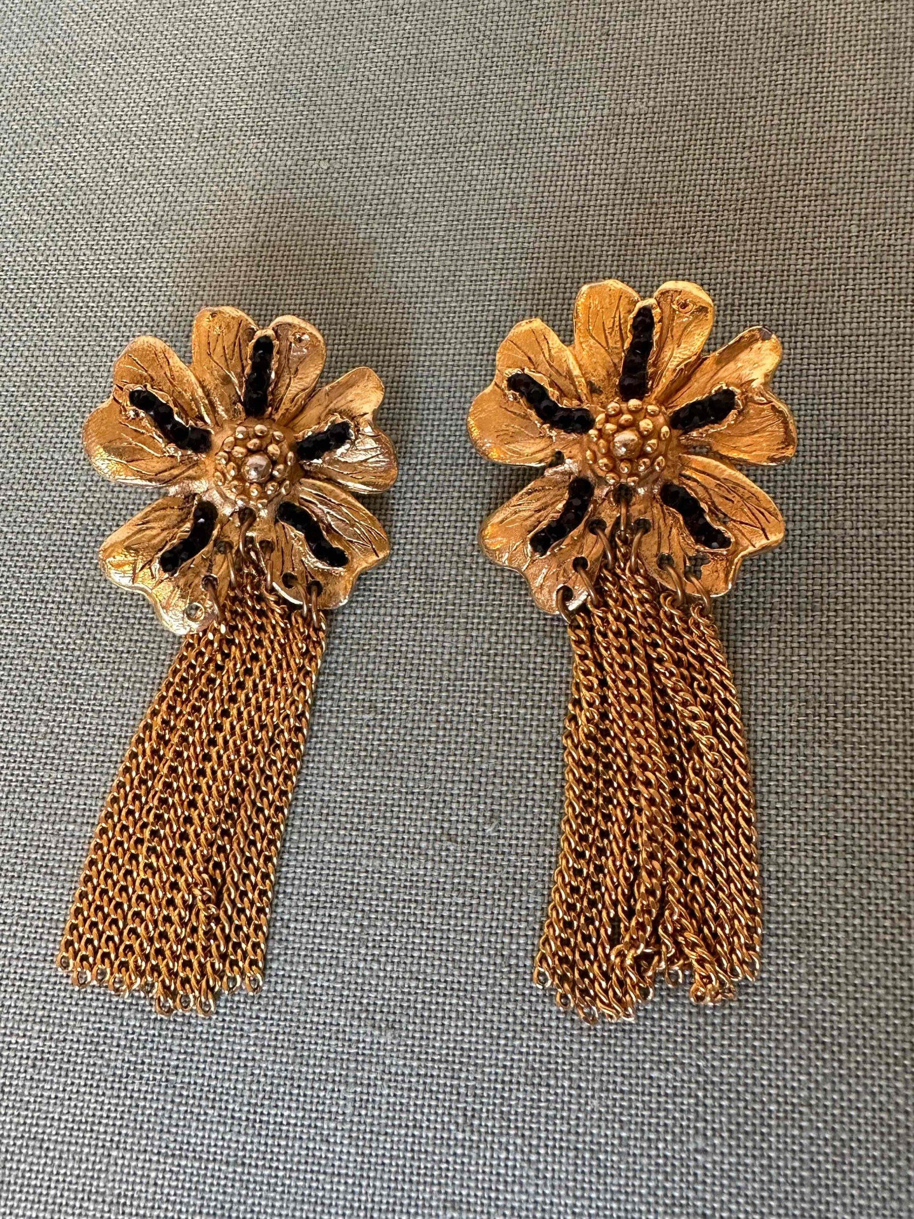 Jacky de G clip-on earrings, in gold-plated brass, large camellia flower encrusted with black glass crystal rhinestones, dangling chains in a Riviera style, 9cm long, 4.5cm diameter. Made in France, 1980s.