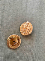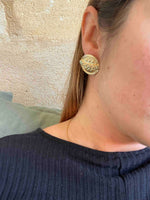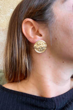 Unit price perClip-on earrings by Escada, made of gold-plated brass, featuring the brand name engraved in a sunburst pattern, 3cm in diameter.