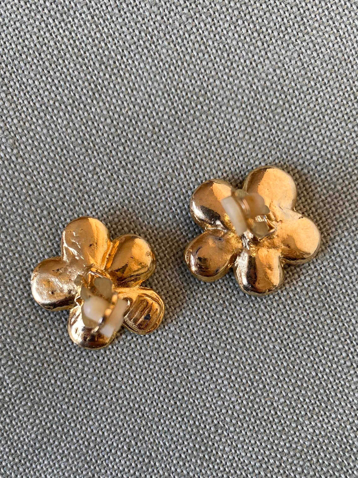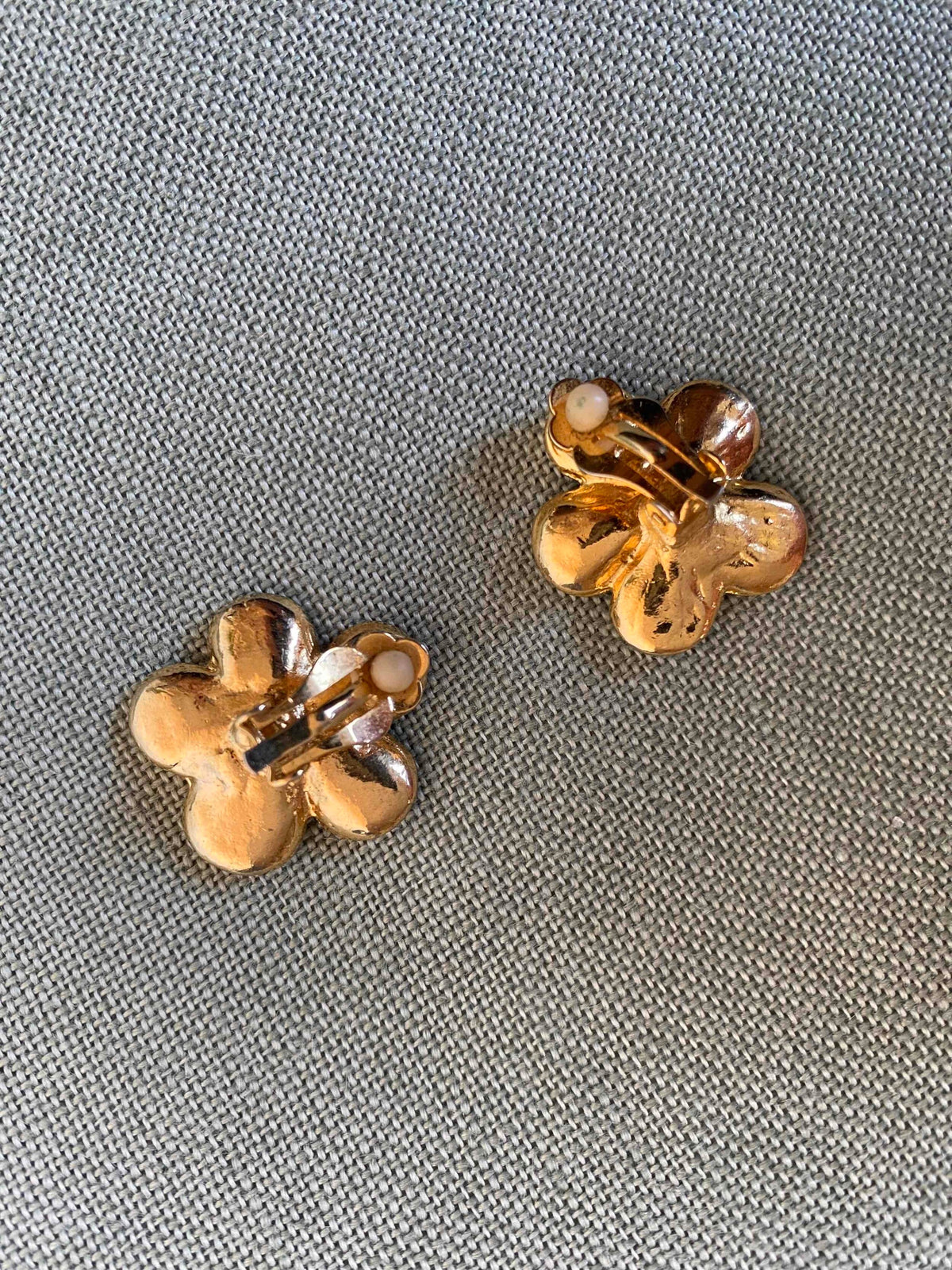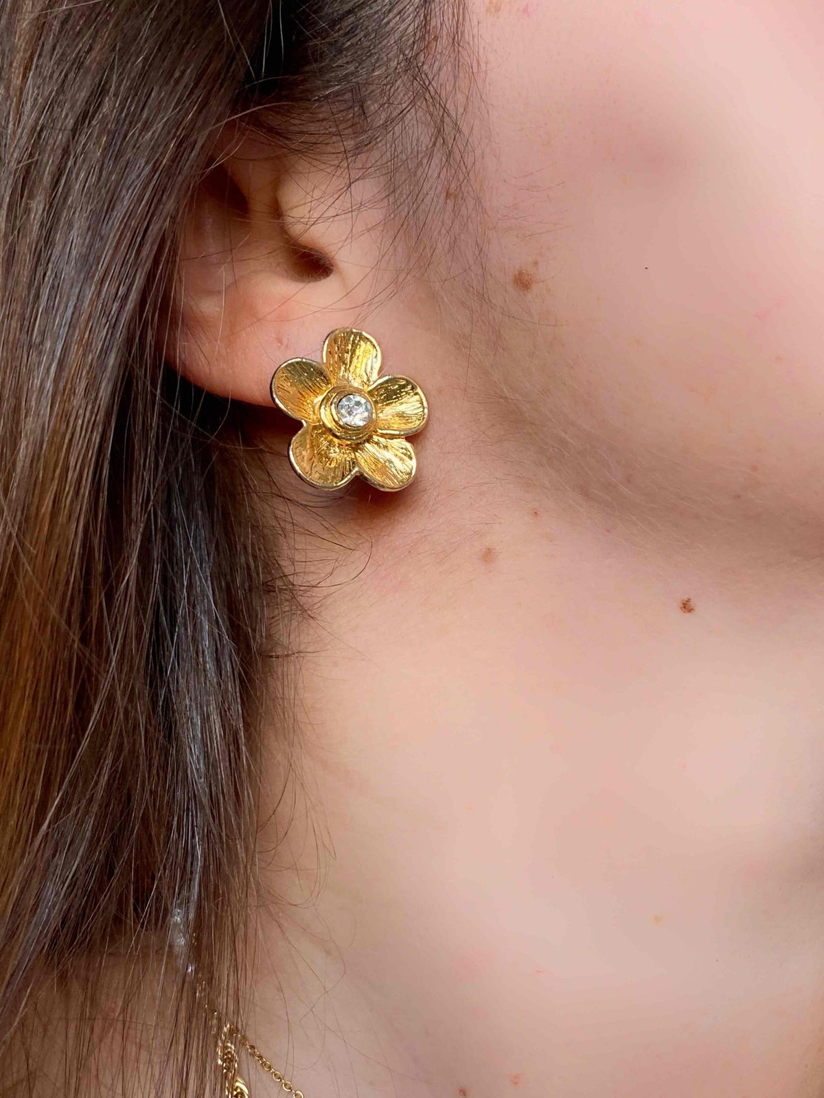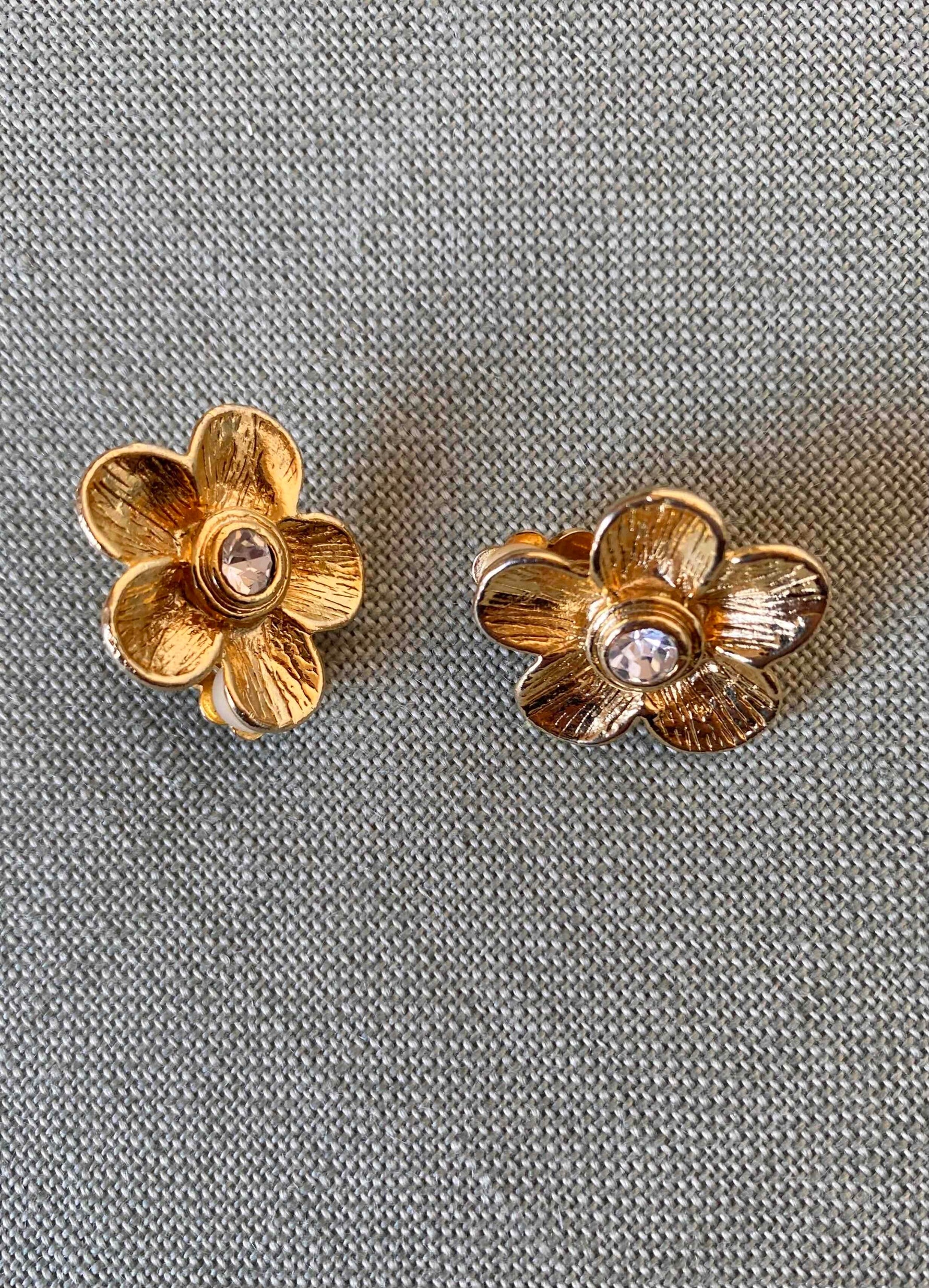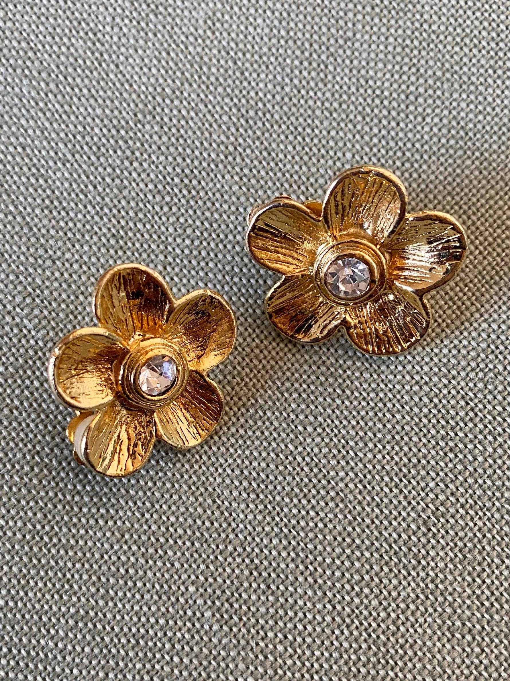 Unit price perClip-on flower earrings, in gold-plated brass, with a flower and heart shape in crystal rhinestones, 80's style, 2.5cm x 2.5cm.