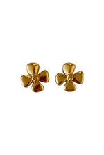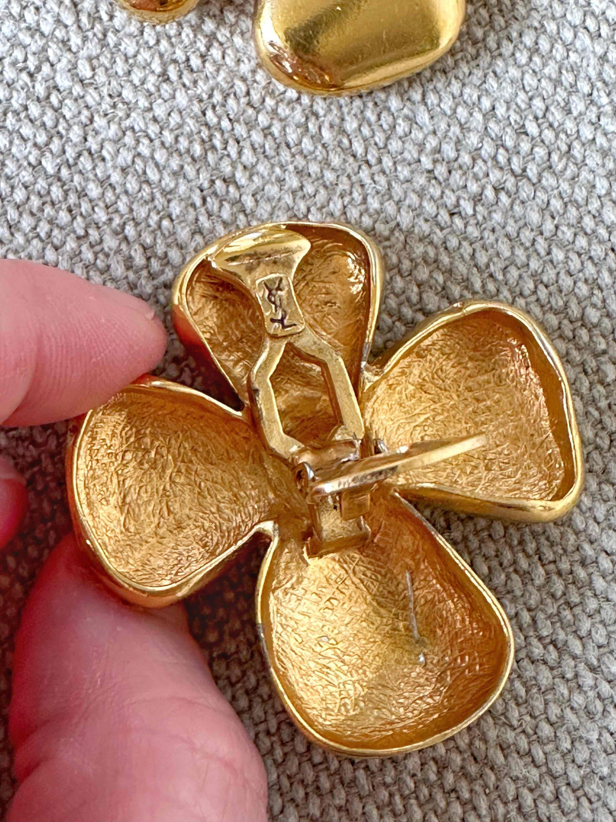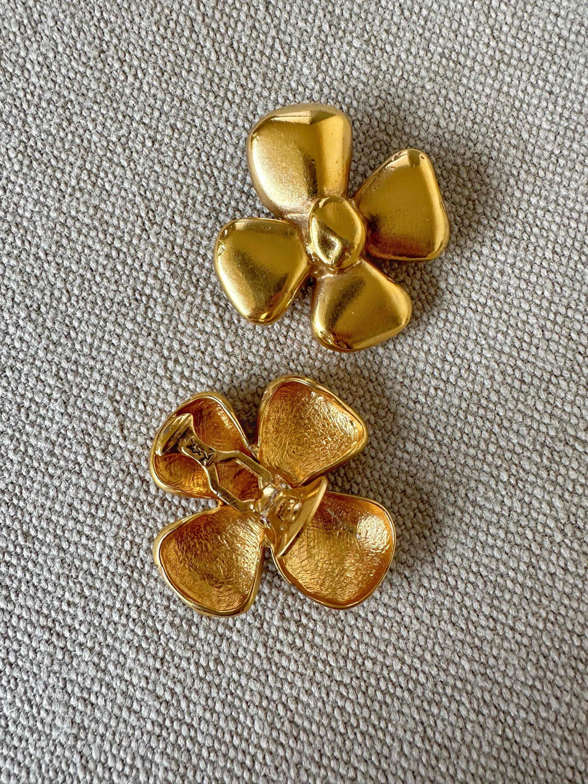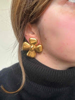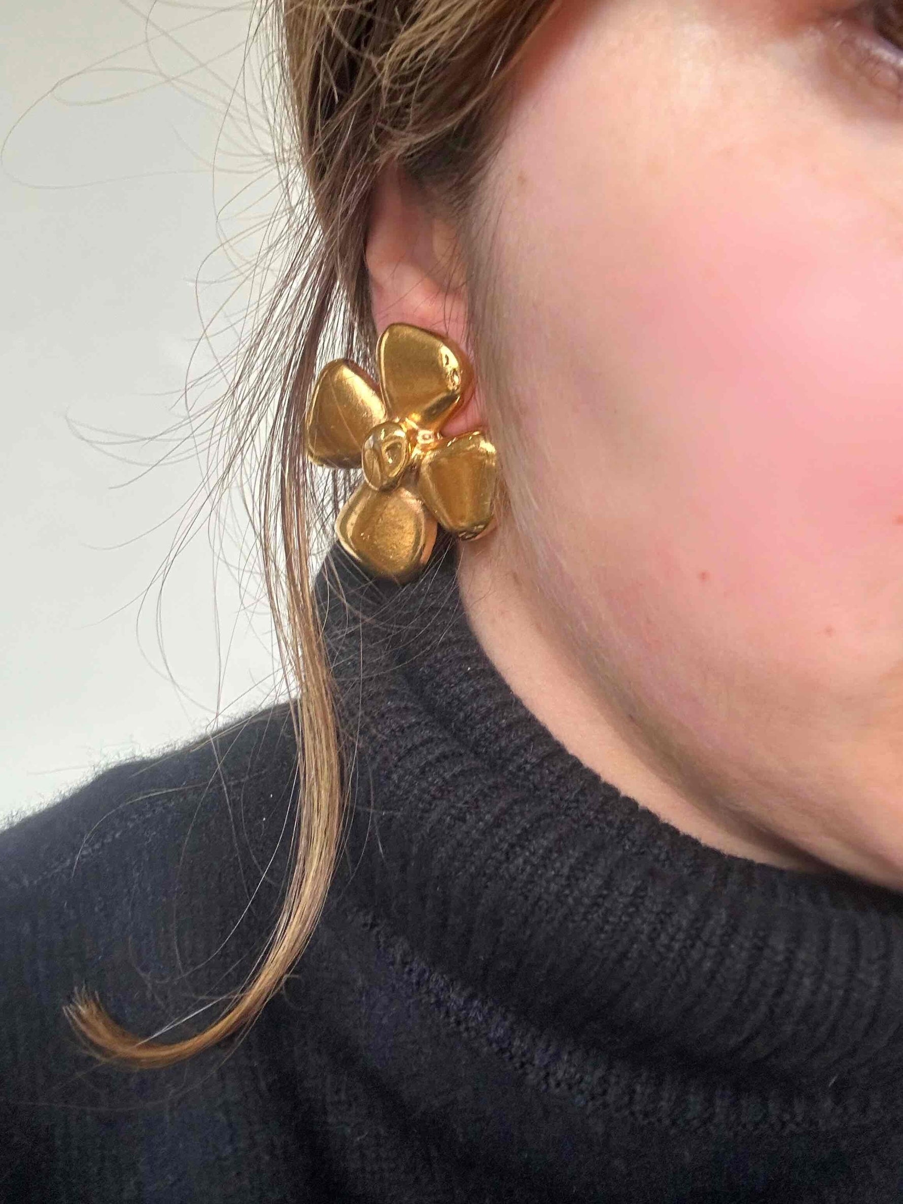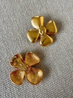 Unit price perYves Saint Laurent clip-on earrings, in gold-plated brass, flower-shaped, with YSL engraved hallmark, made in France, 5 cm x 5 cm wide.