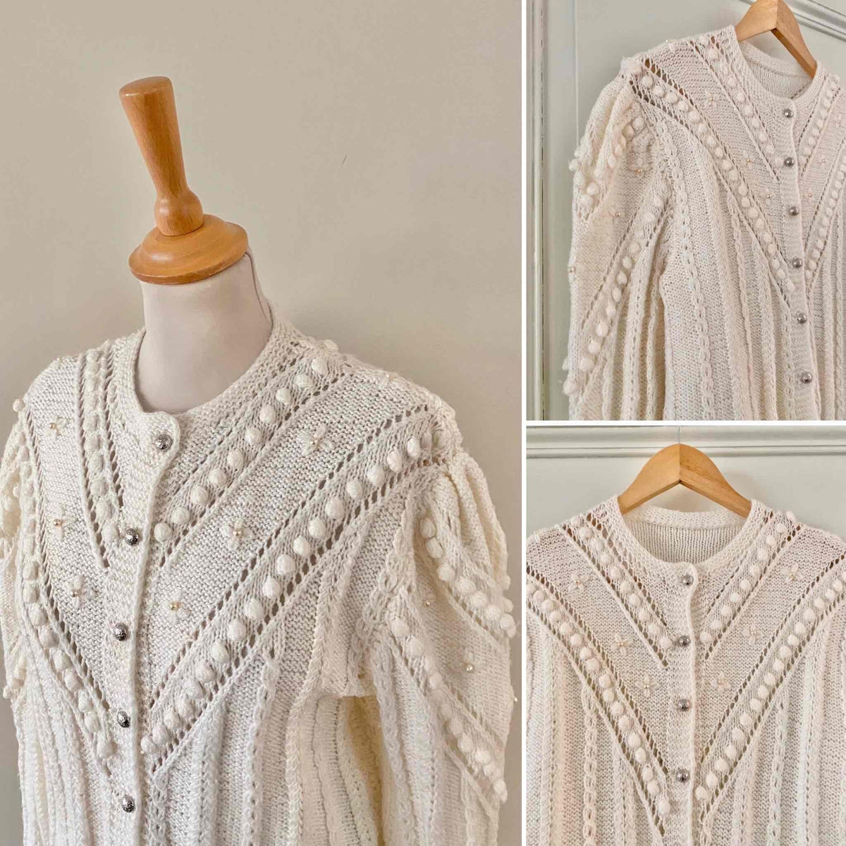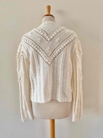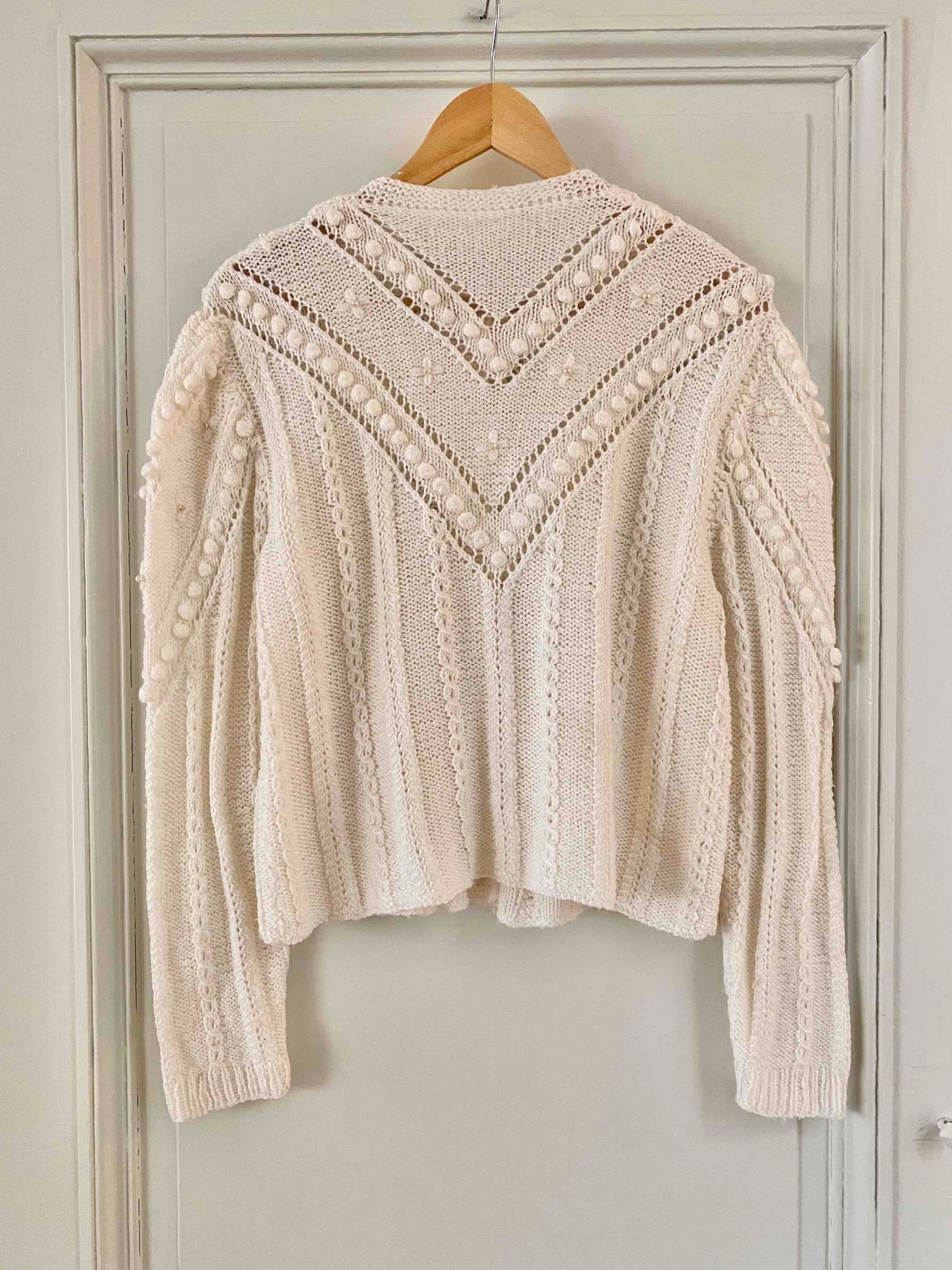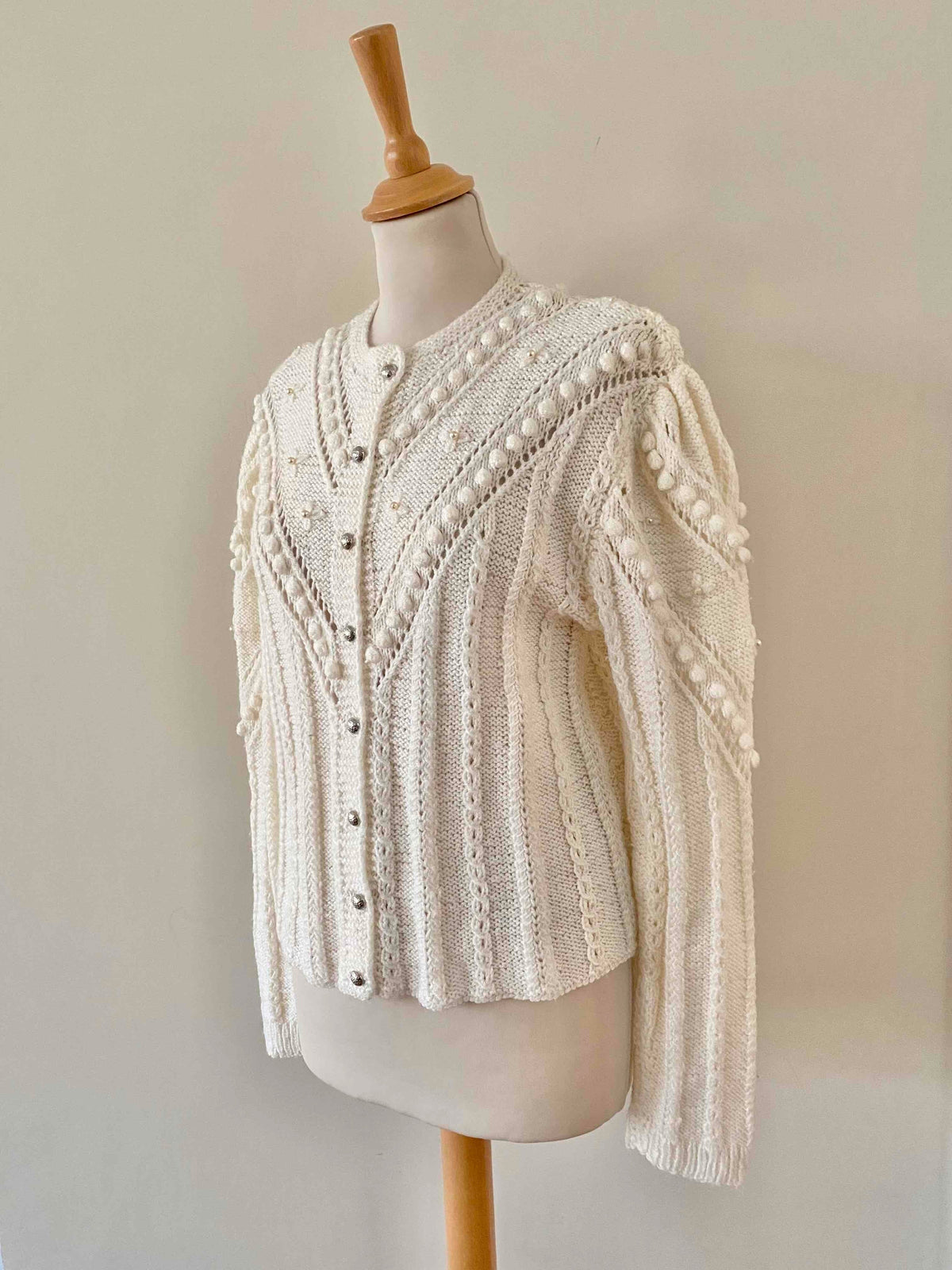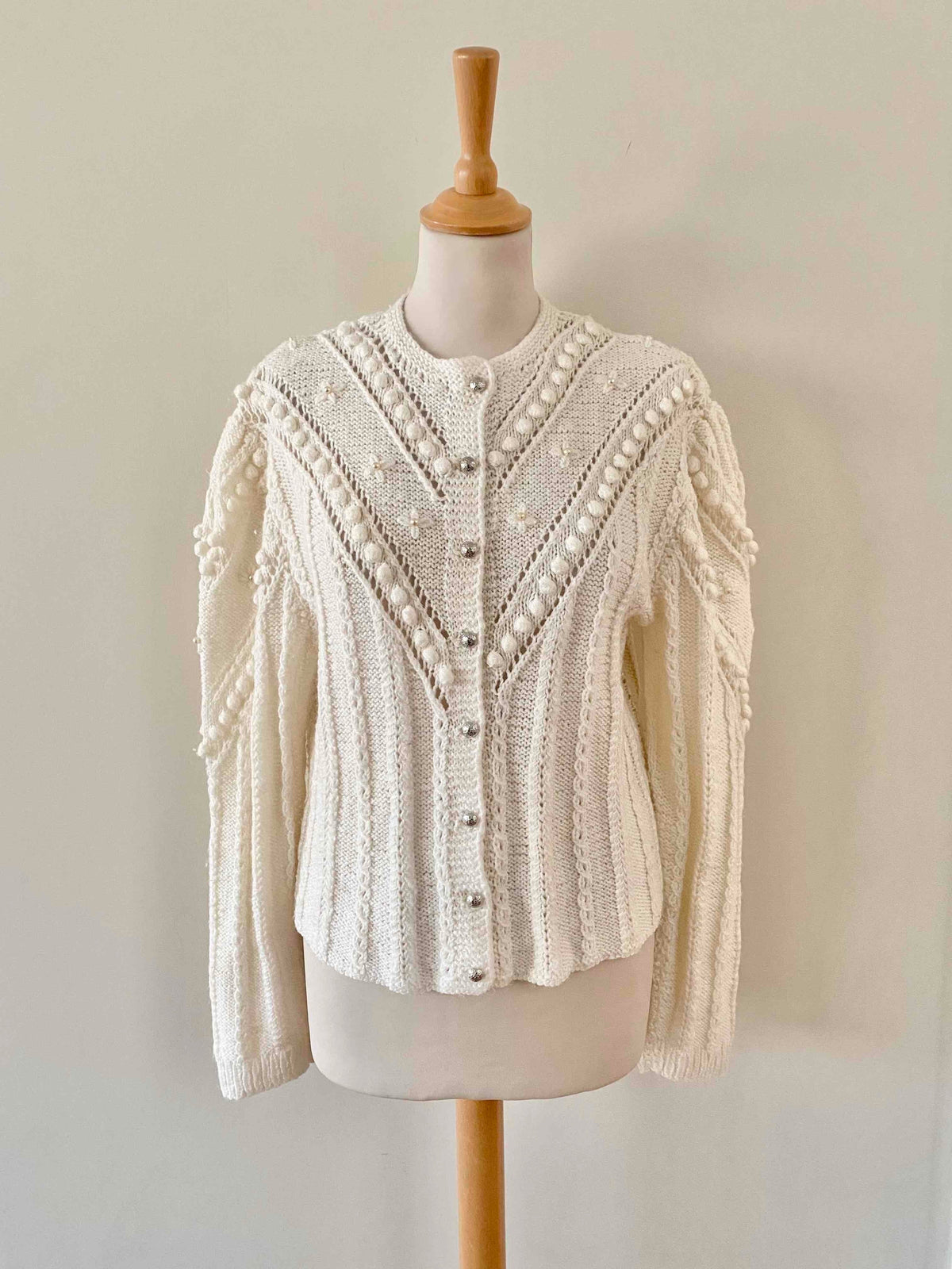Unit price perAustrian cardigan in white acrylic wool, popcorn stitch with embroidered pom-poms and tone-on-tone embroidered flowers, embroidered mother-of-pearl beads, embroidered balloon sleeves, silver jewelry buttons, knitted and embroidered by hand in Austria.