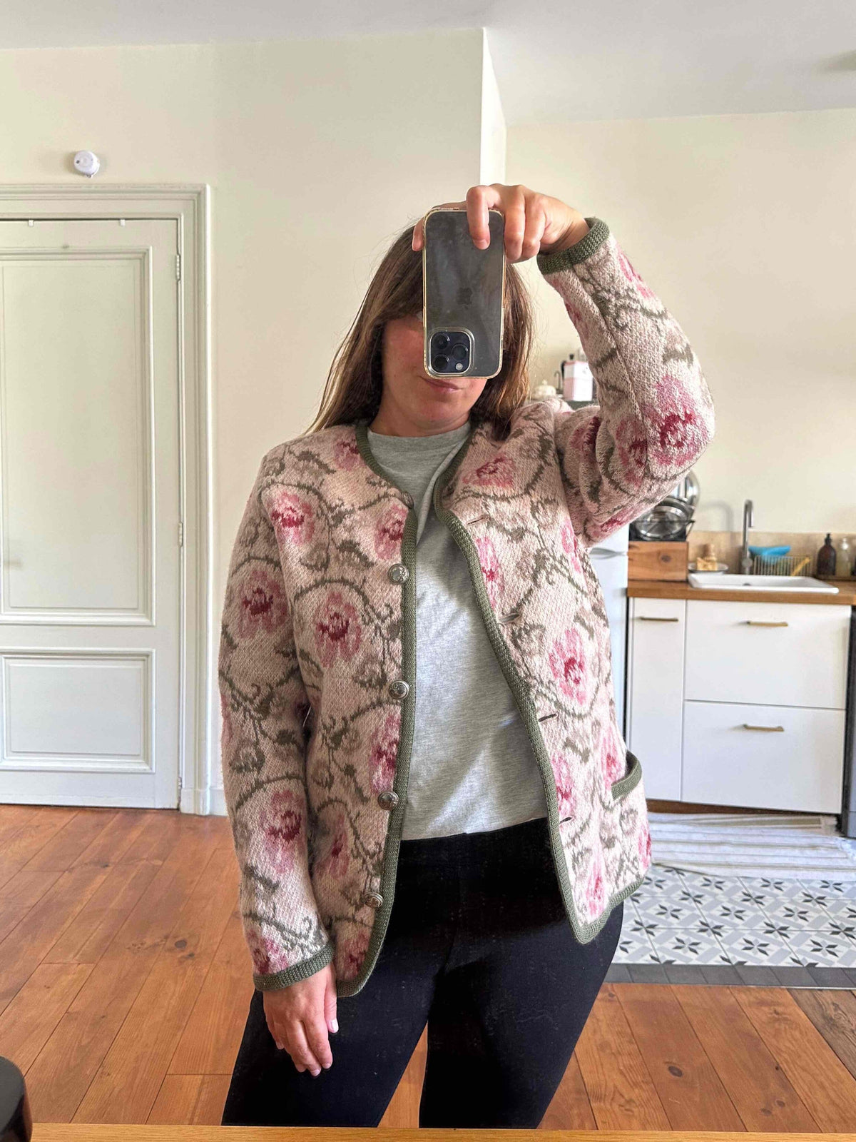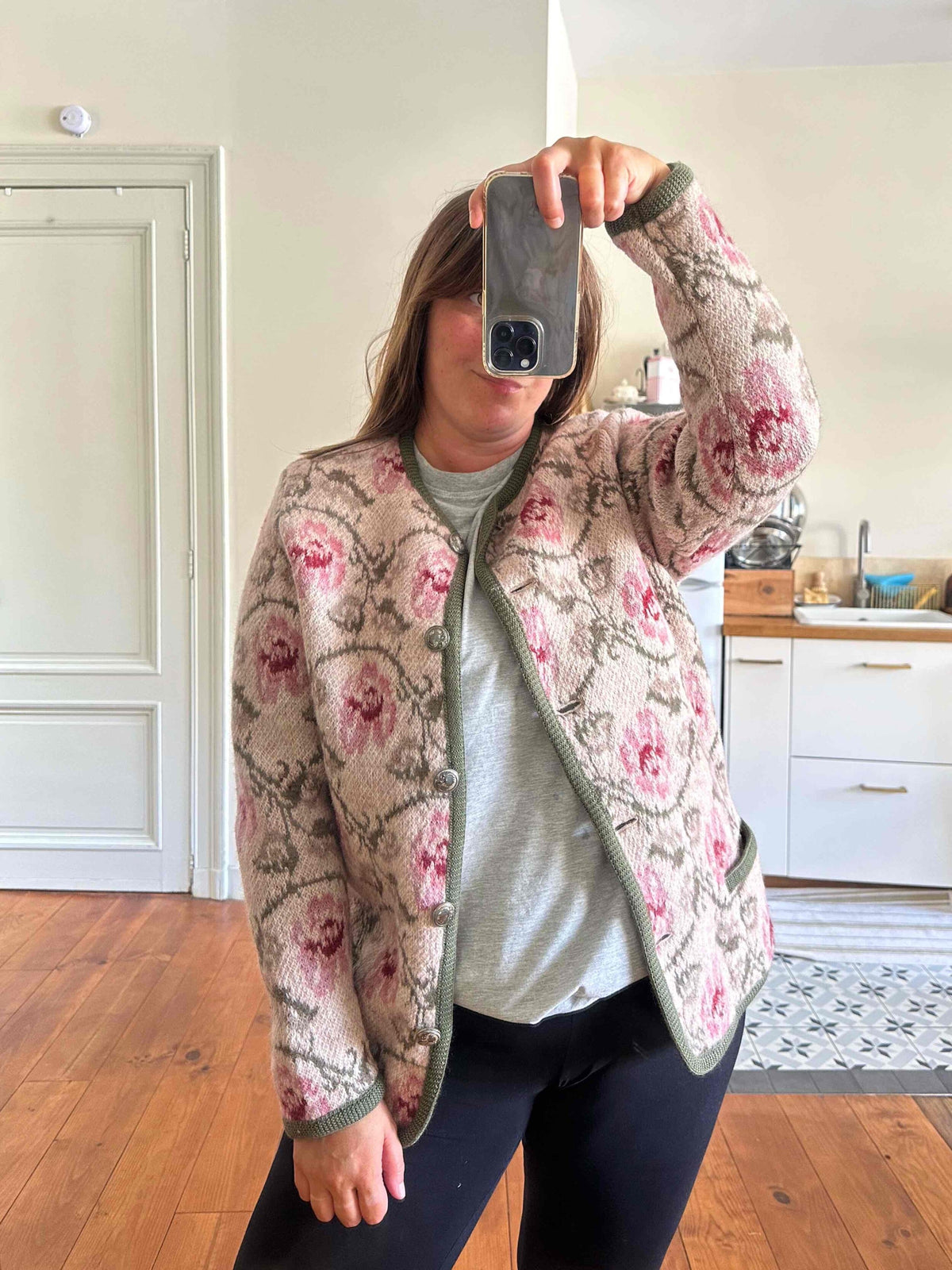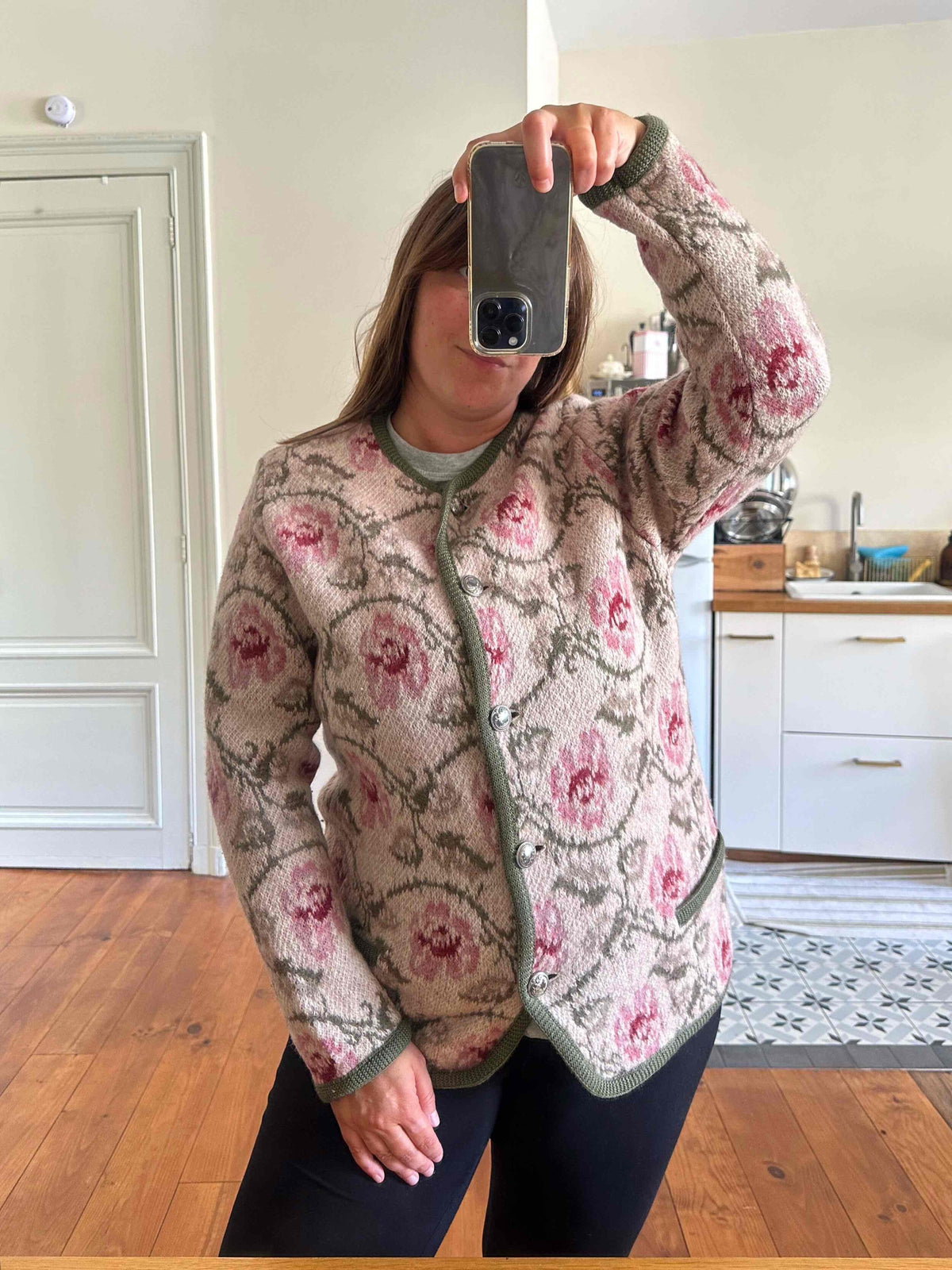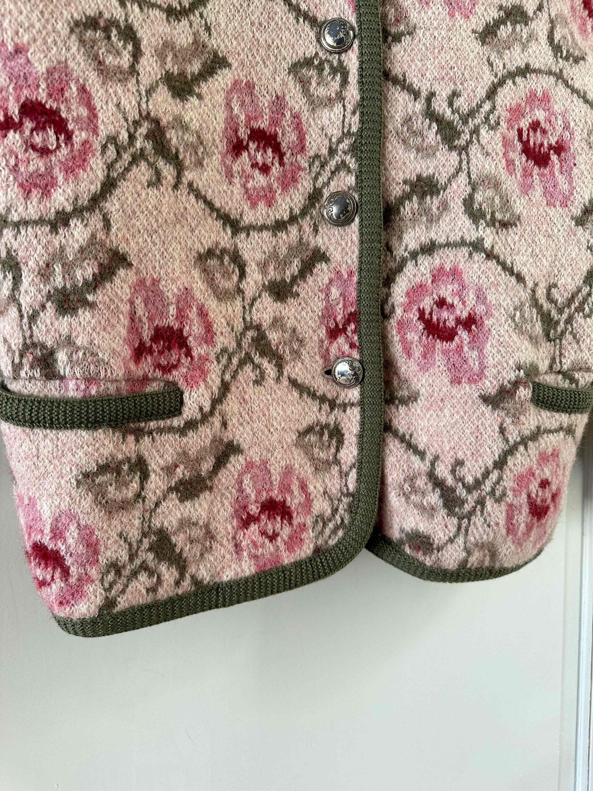 Unit price perAustrian cardigan, made of pure wool, with jacquard intarsia patterns of dusty rose and olive green flowers, silver-colored jeweled buttons, can be worn as a cardigan or jacket, made in Austria, size 40 shown here on a size 40 model.