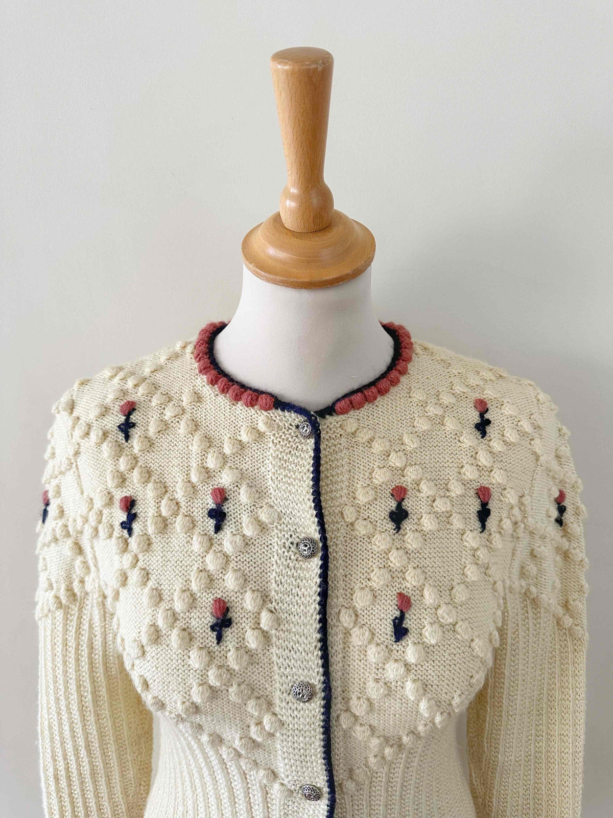 Unit price perAustrian cardigan in pure ecru wool, popcorn stitch with embroidered pom-poms, embroidered dusty pink and navy blue flowers, balloon sleeves, silver-colored jewel buttons, hand-knitted in Austria, suitable for sizes 34 and 36, shown here on a size 36 mannequin.
