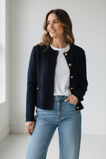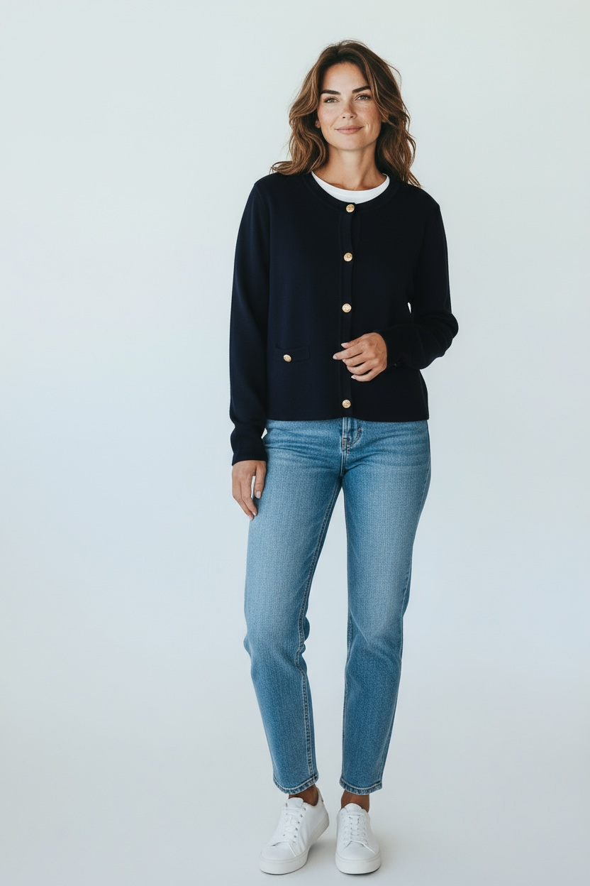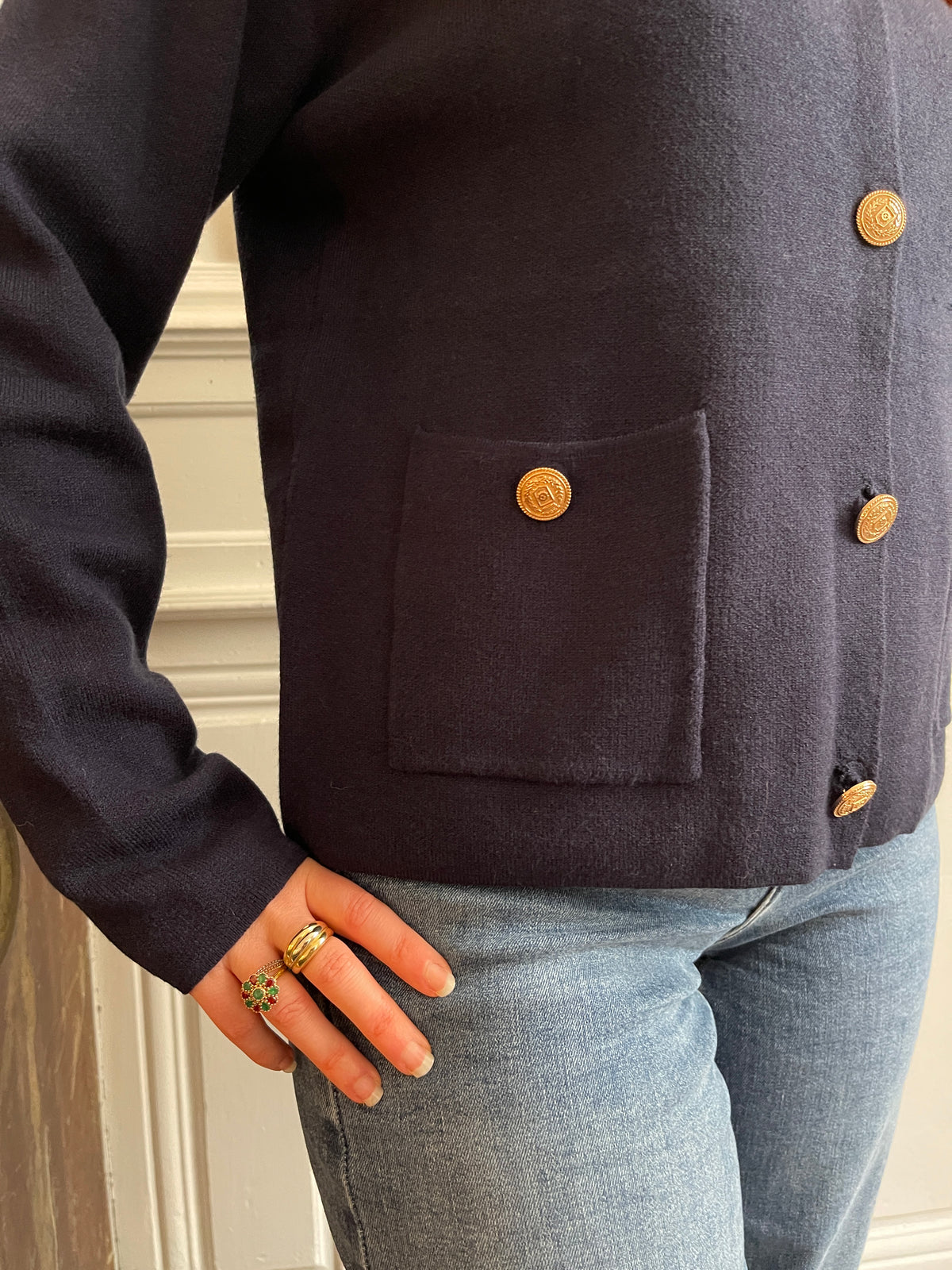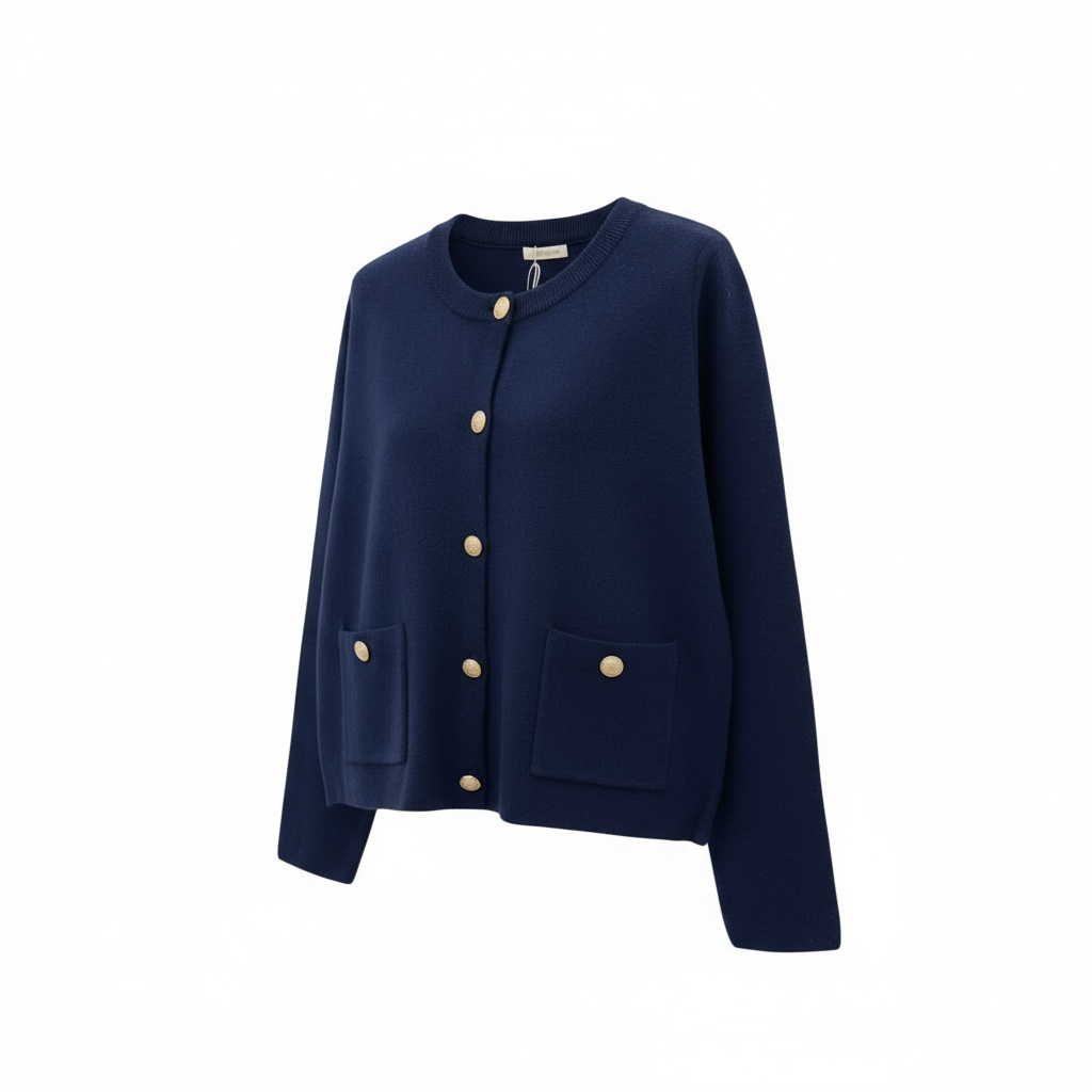 Navy blue cardigan with a timeless, straight cut, embellished with gold buttons for a touch of chic. With its discreet pockets and soft fabric, it's easy to pair with jeans for a casual look or a skirt for a dressier style. One size fits all. Made in China. Material: 40% viscose, 35% polyamide, 15% polyester, and 10% wool. Care: Machine wash at 30°C on a delicate cycle at 800 rpm.