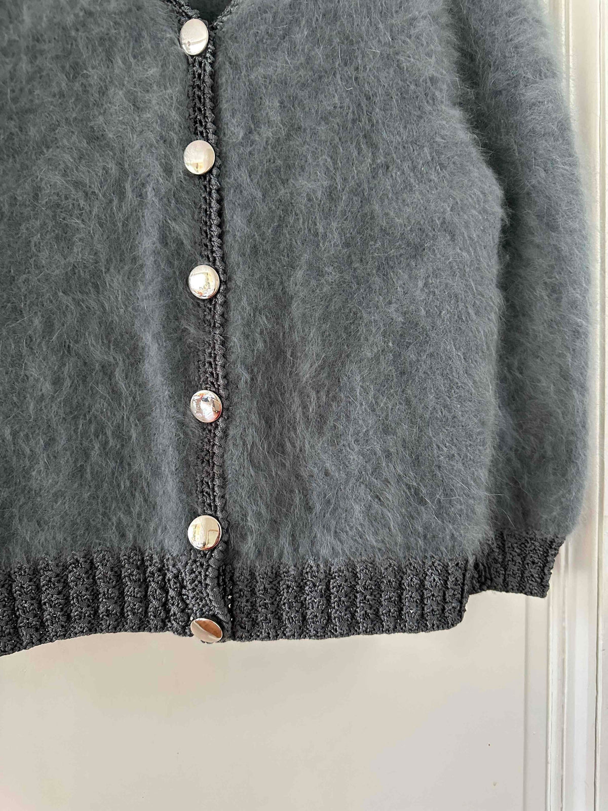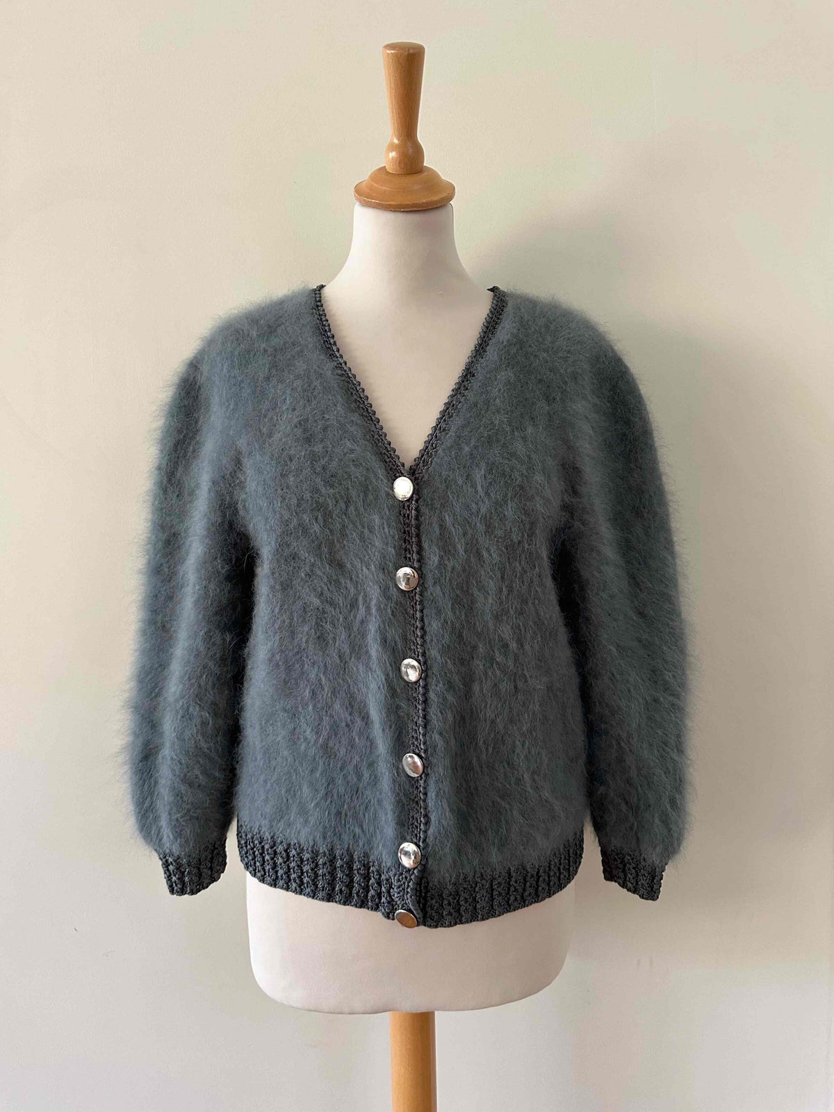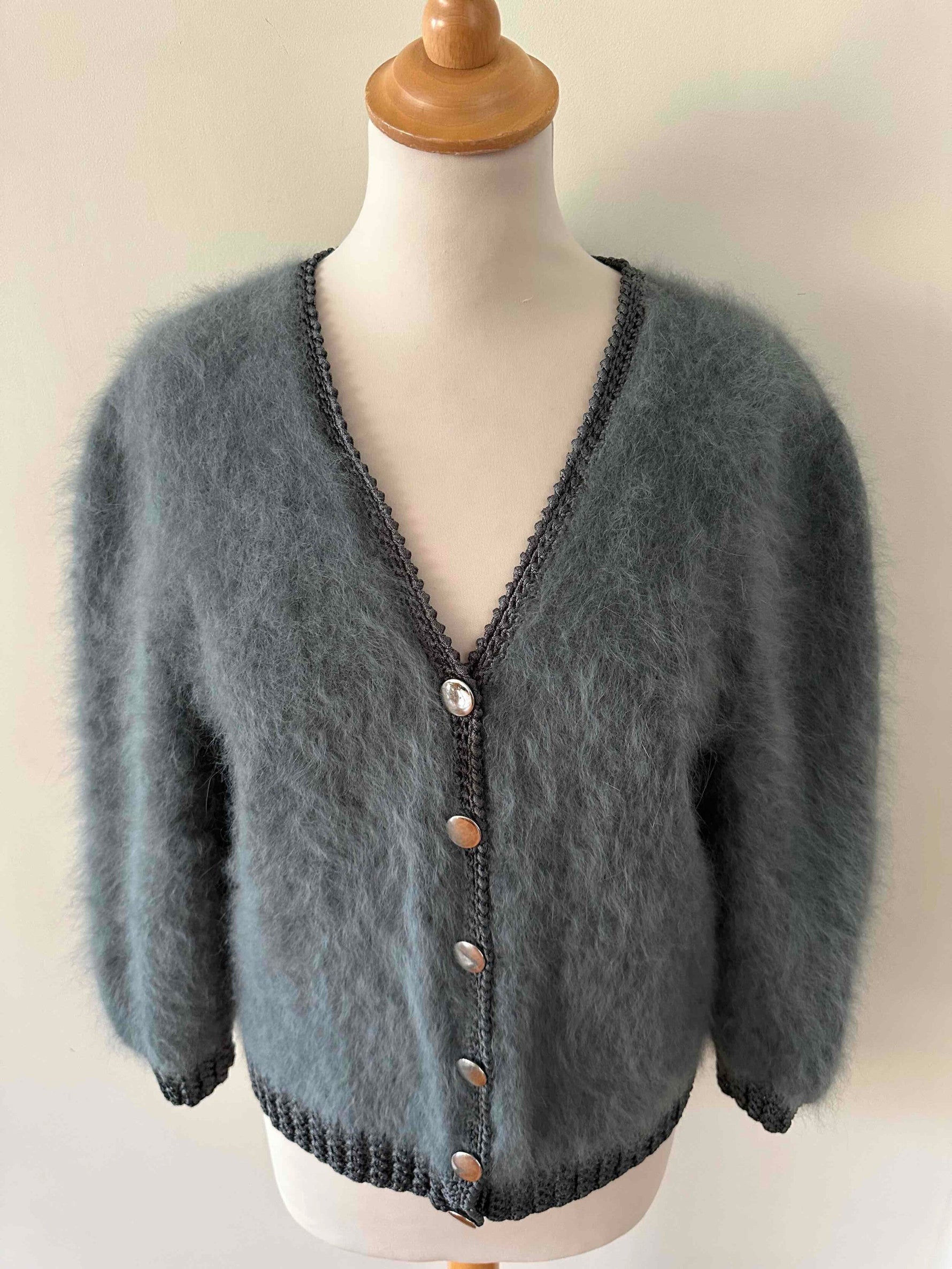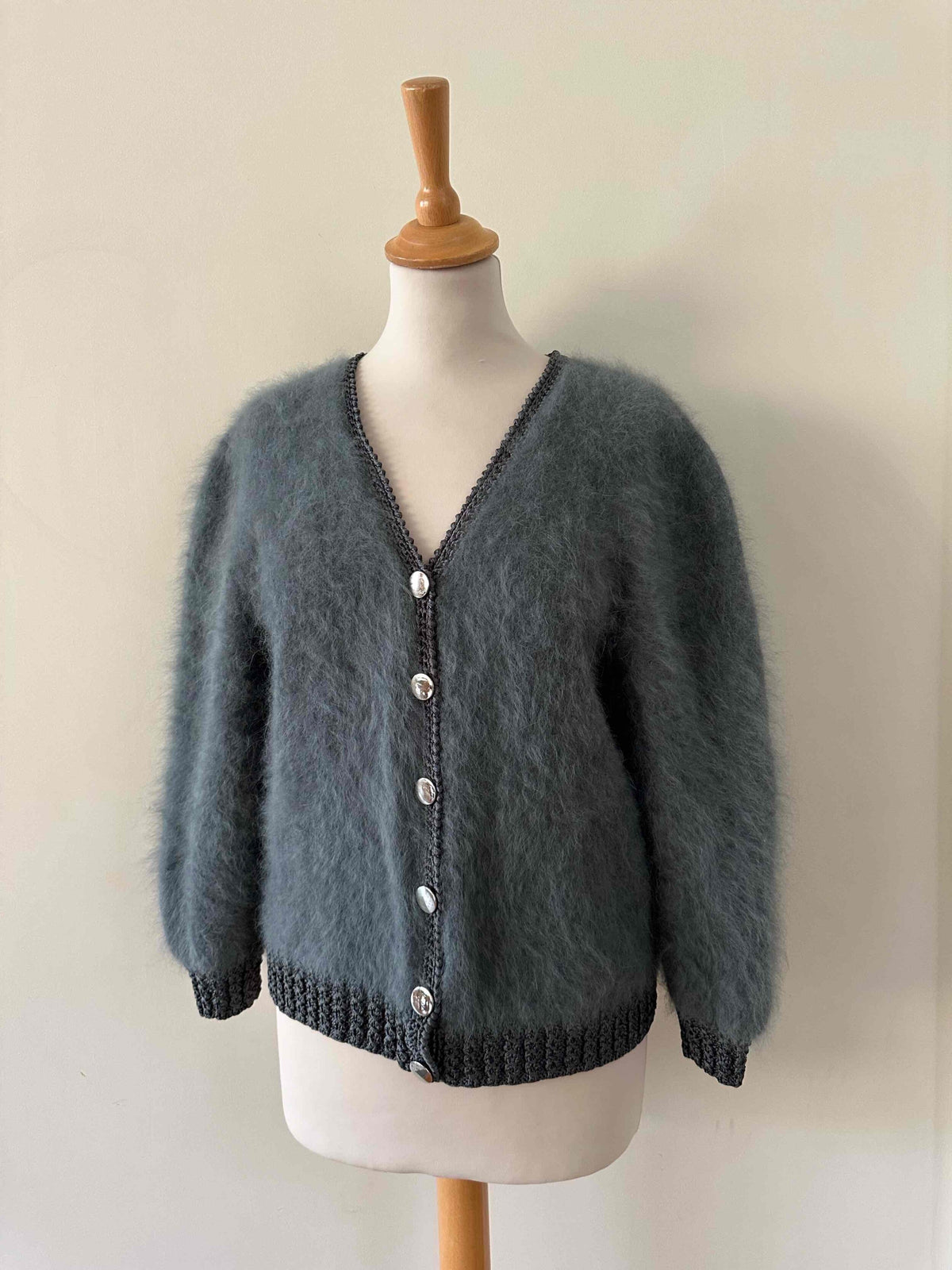 Angora cardigan, pure anthracite grey angora, silver buttons, balloon sleeves, hand-knitted, size 36 shown here on a size 36 mannequin.
