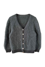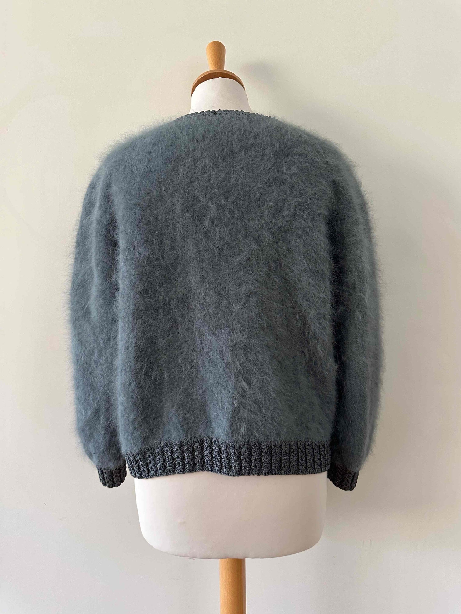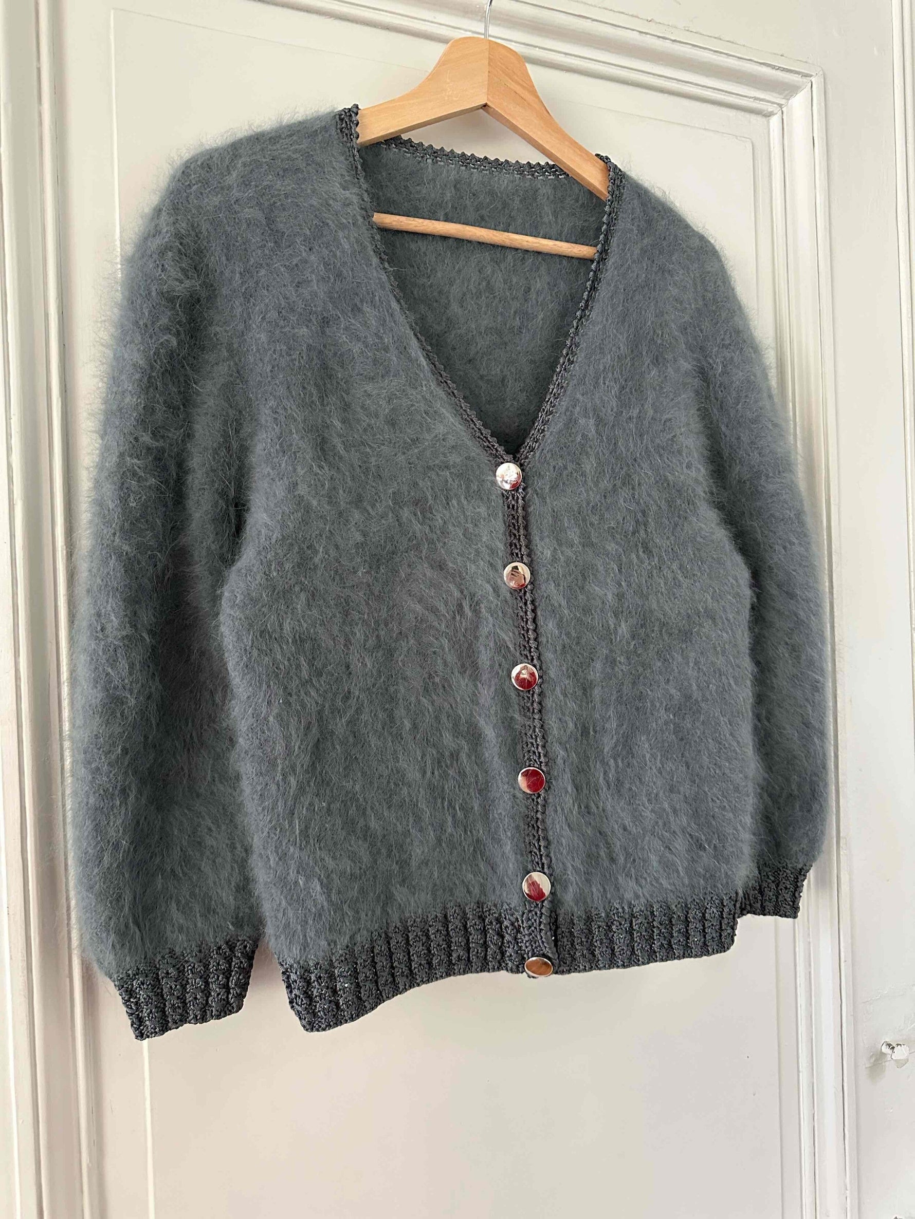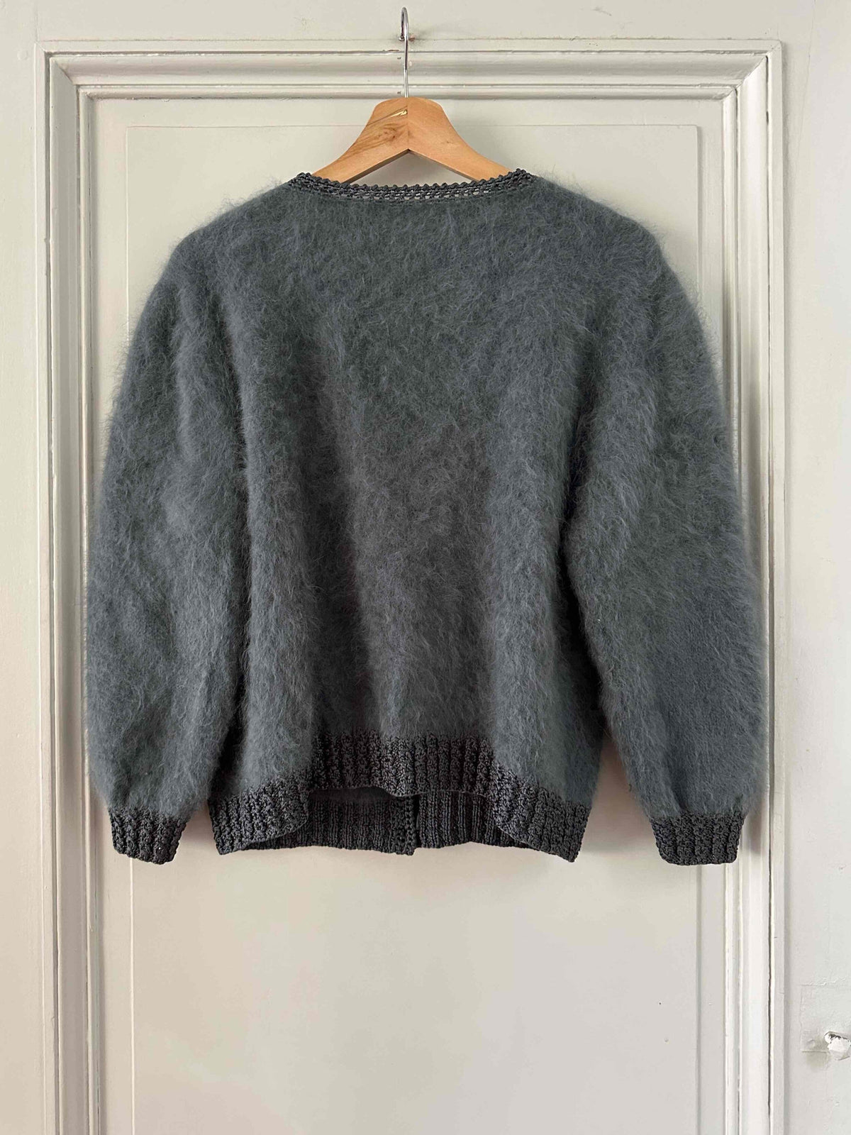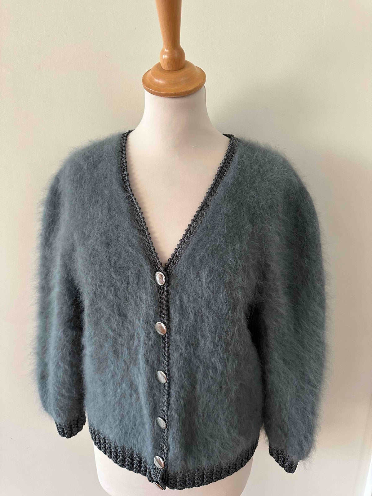 Angora cardigan, pure anthracite grey angora, silver buttons, balloon sleeves, hand-knitted, size 36 shown here on a size 36 mannequin.