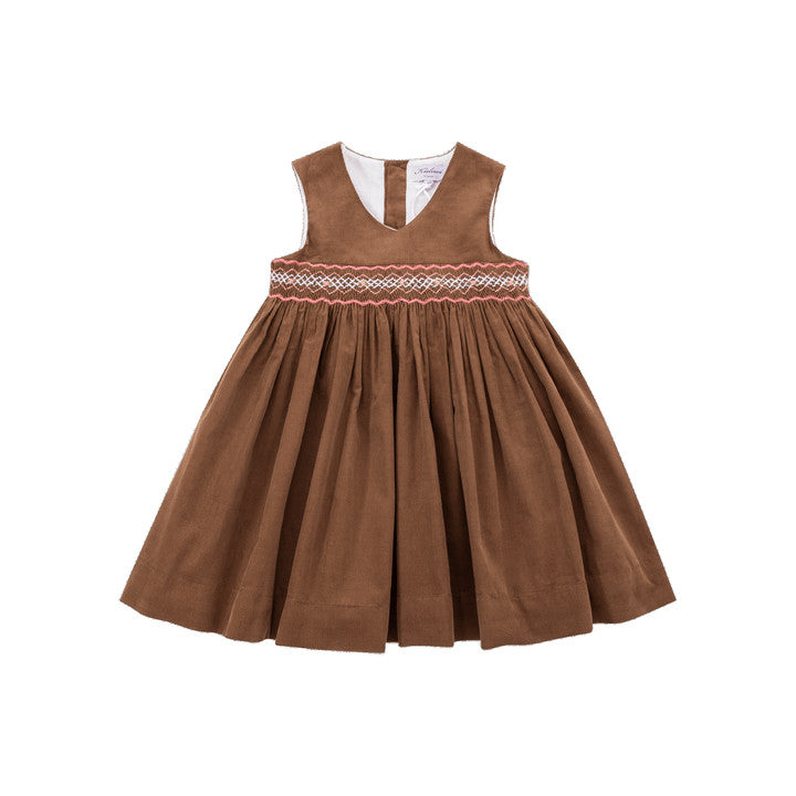 Robe chasuble Carmelle en velours milleraie châtaigne.