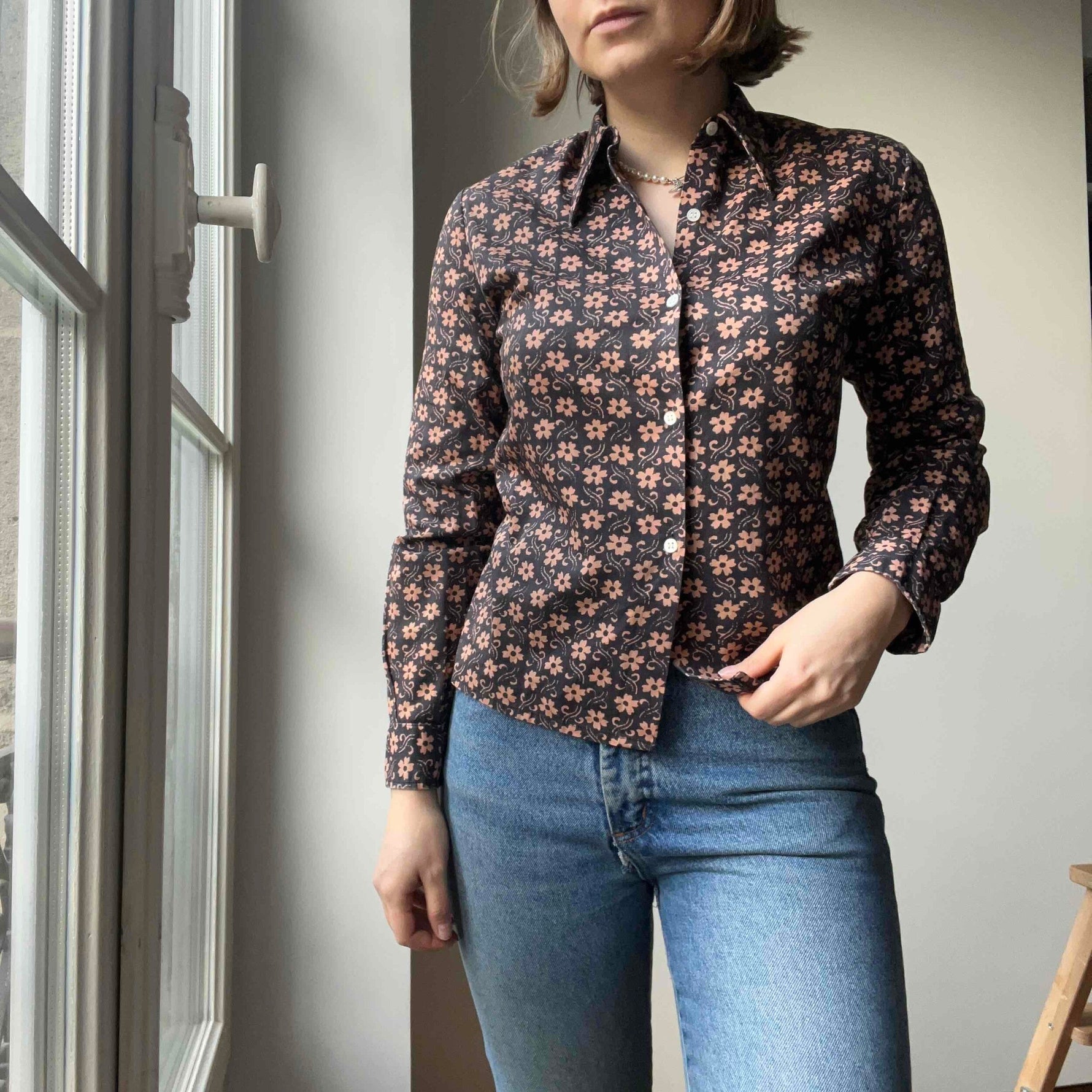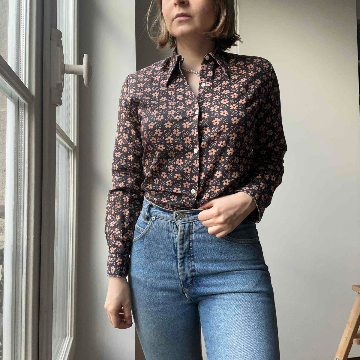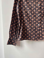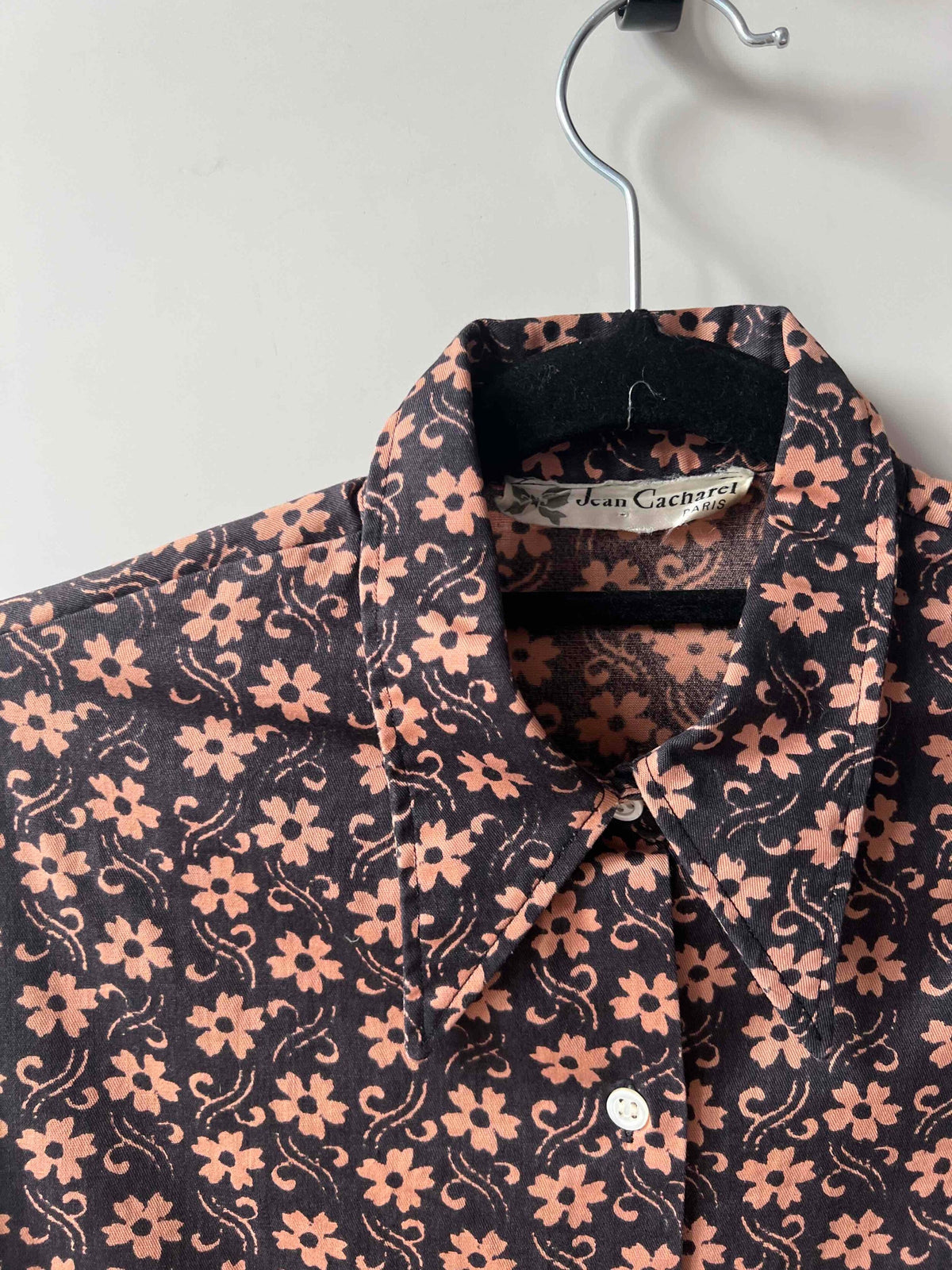 Unit price perBlack long-sleeved shirt with pastel orange flowers by Cacharel. Dating from the 1960s, from the brand's first collection, still under the name "Jean Cacharel". Pointed, pie-plate collar. Mother-of-pearl buttons. Size 36.