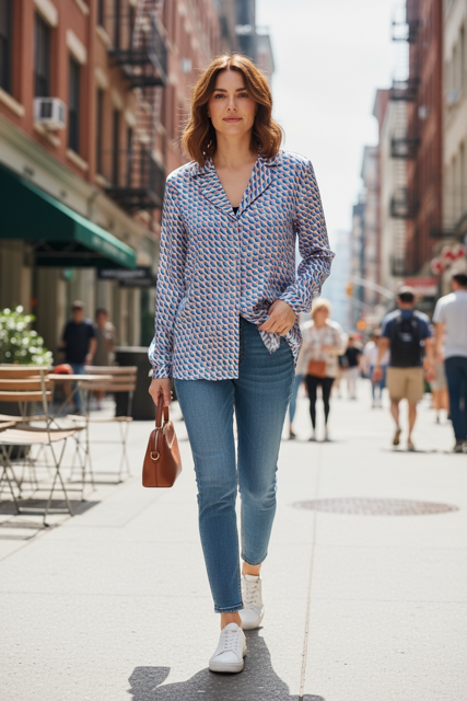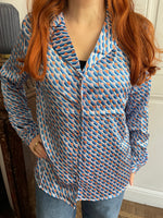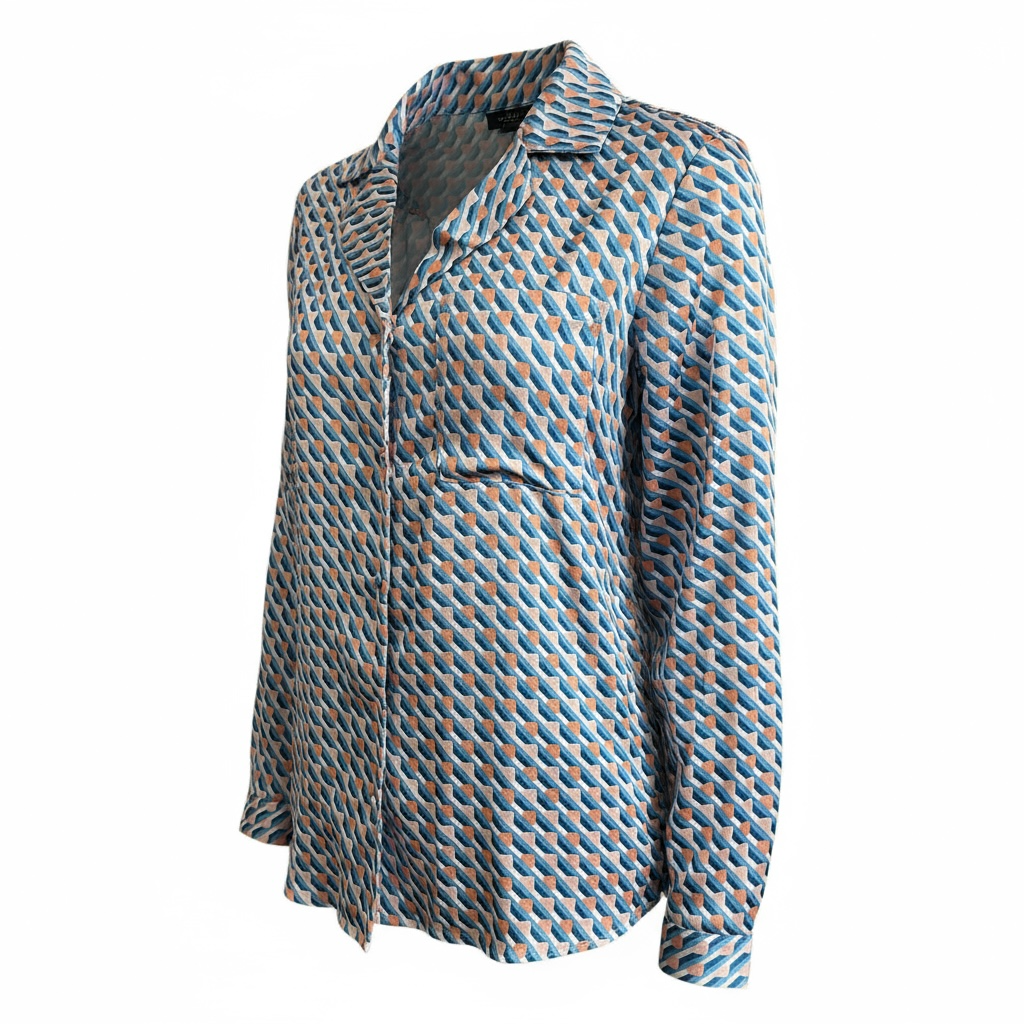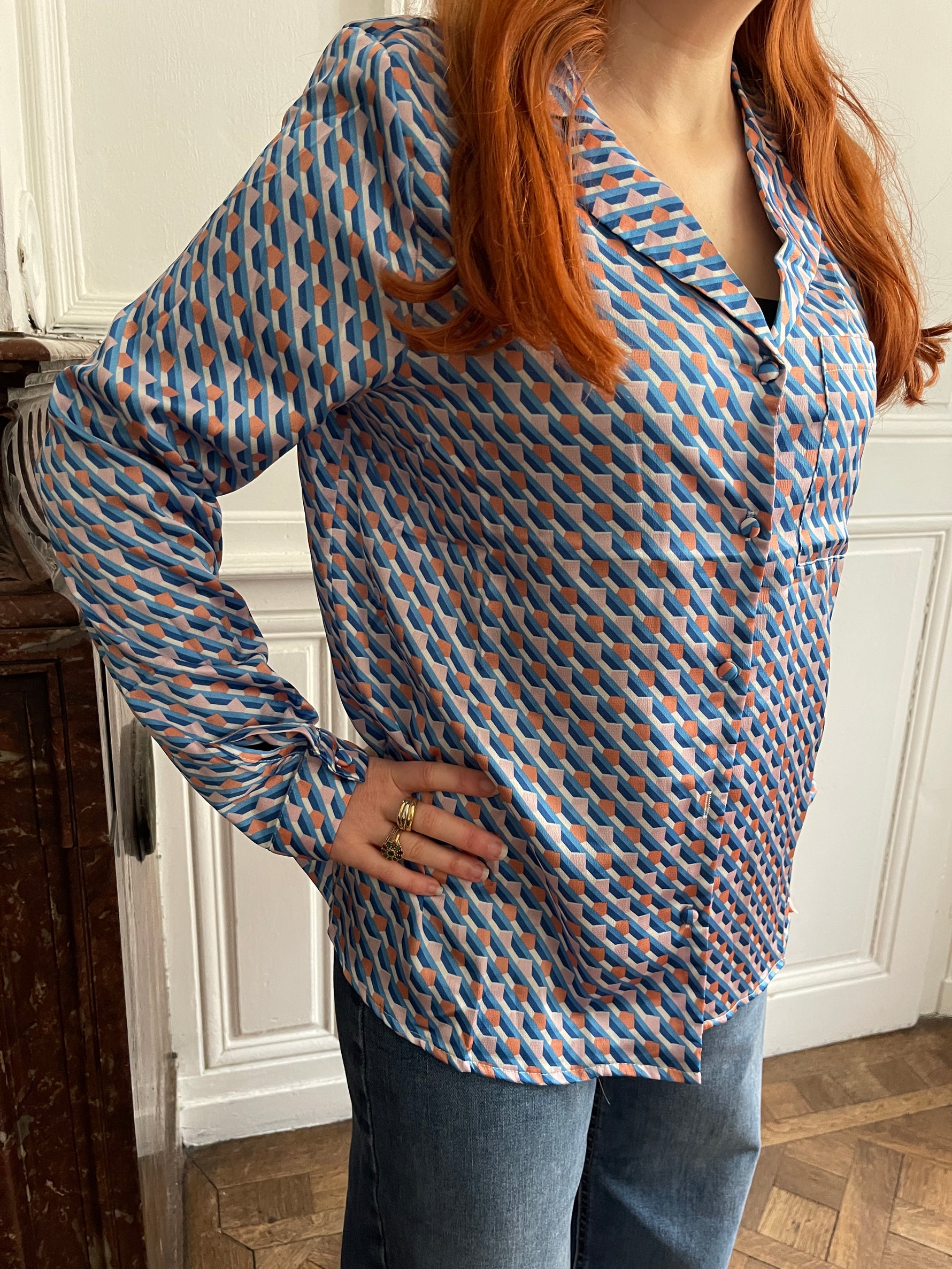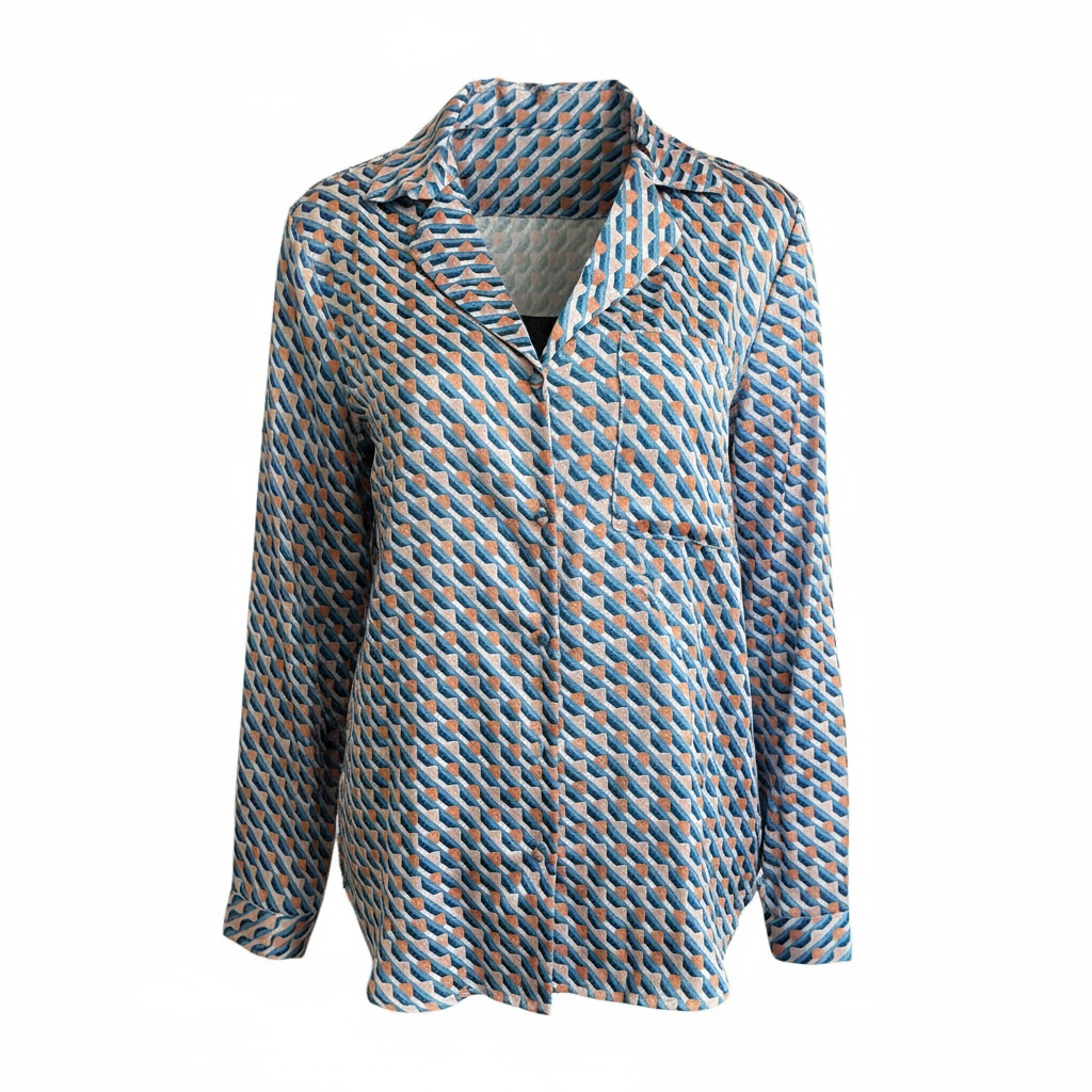 A geometric print shirt that reinvents the chic pajama style. Its cut and fluid fabric, notched collar, and chest pocket make it both comfortable and refined. Easy to pair with jeans for a casual look or wear with wide-leg trousers for a more sophisticated style. Size: M. Made in China. Material: 100% polyester. Care: Machine wash at 30°C on a delicate cycle at 800 rpm.