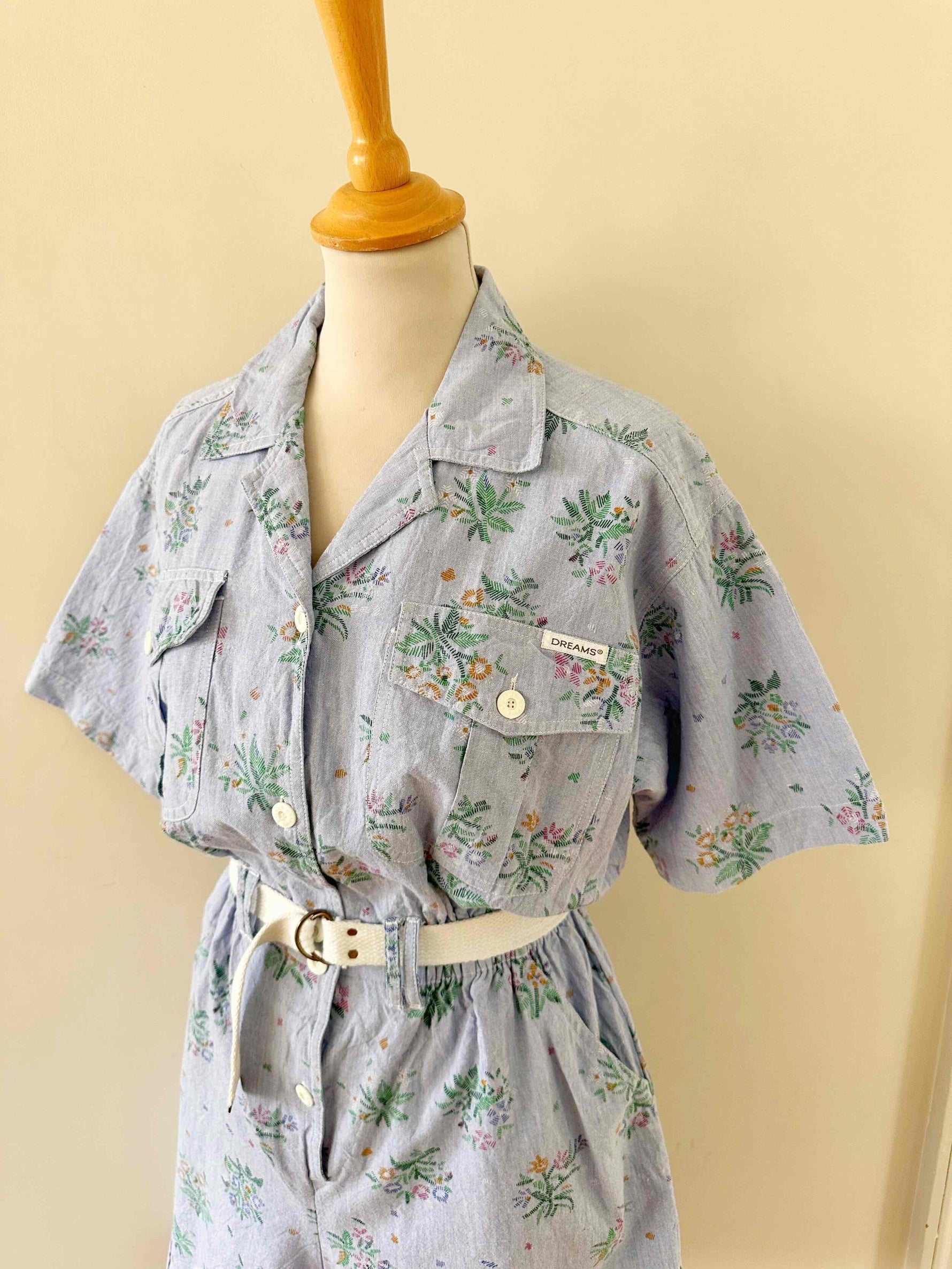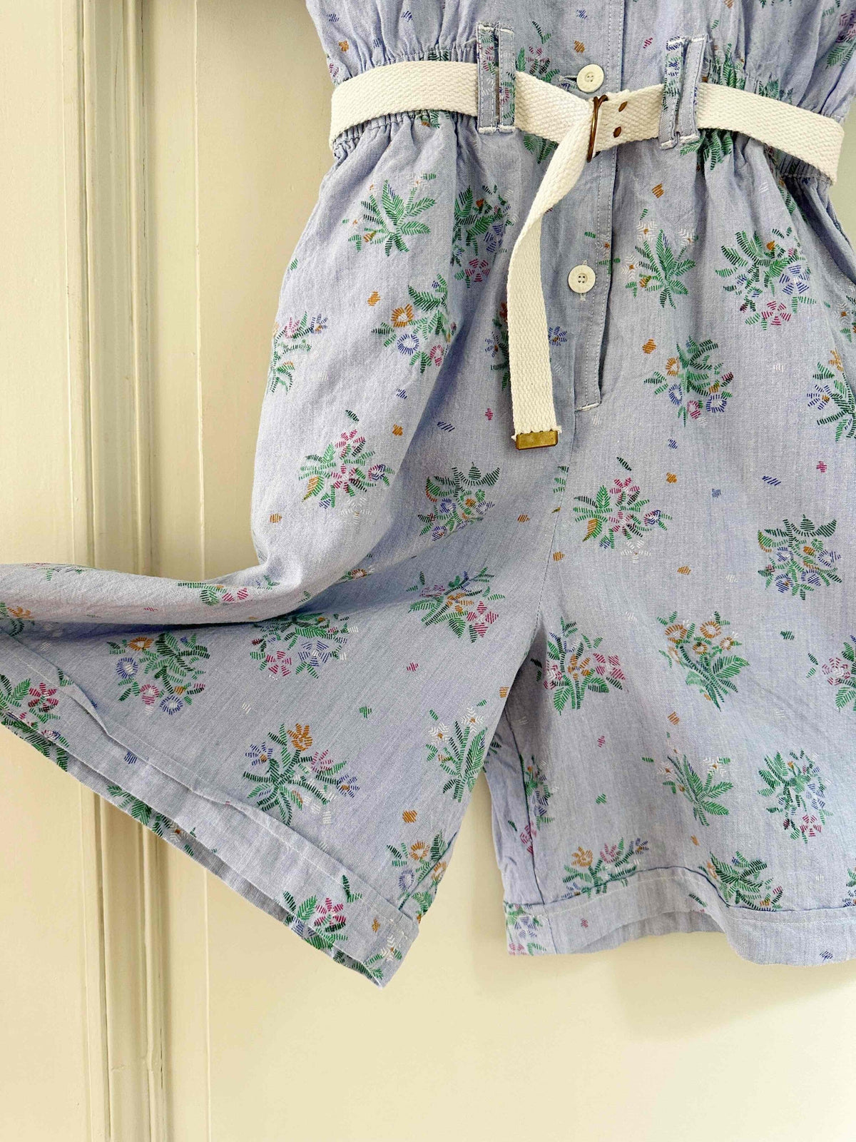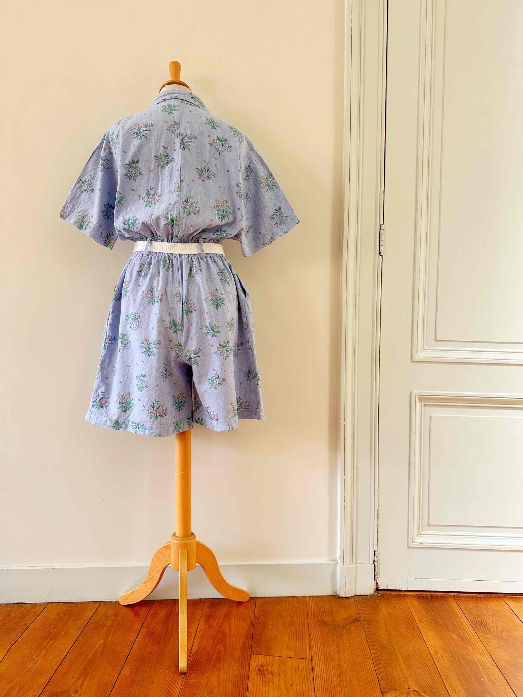 Unit price perCotton floral print playsuit, in chambray cotton with a denim blue effect, printed with multicolored flowers, safari style, elastic waist, buttoned, and white grosgrain belt, 90s style, current size 36, worn here on a size 36 mannequin.