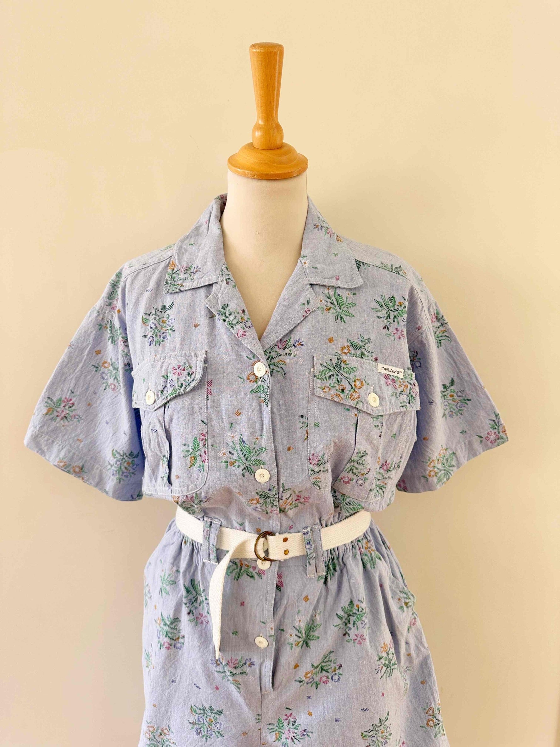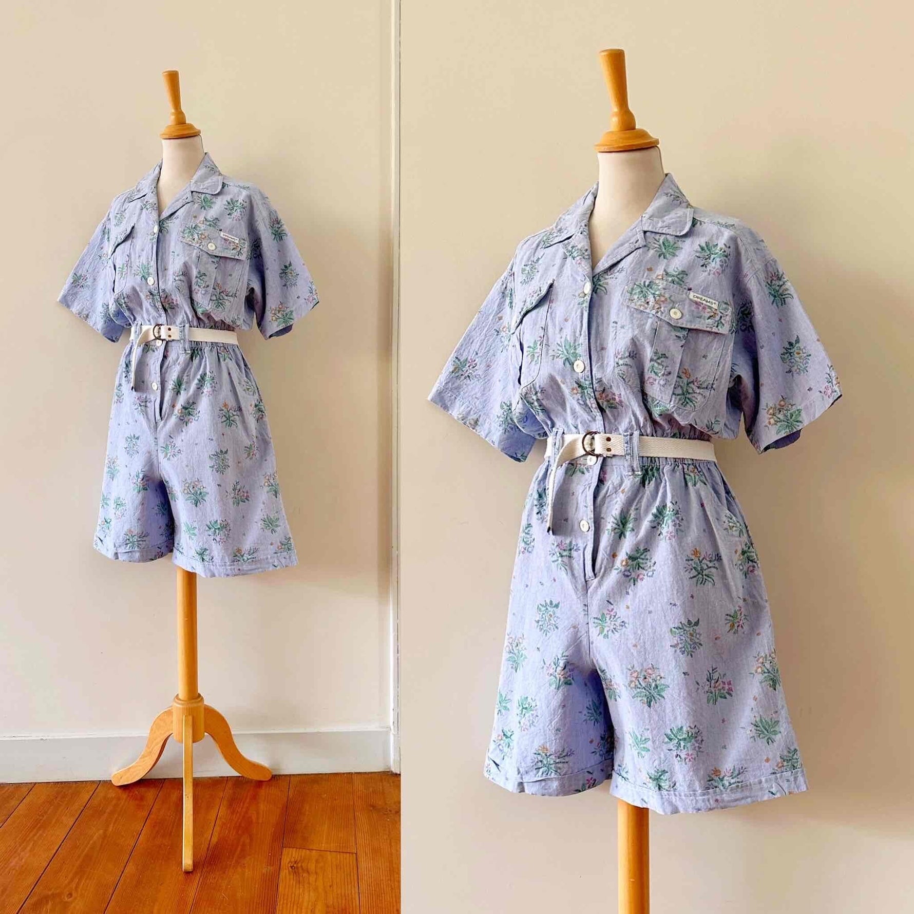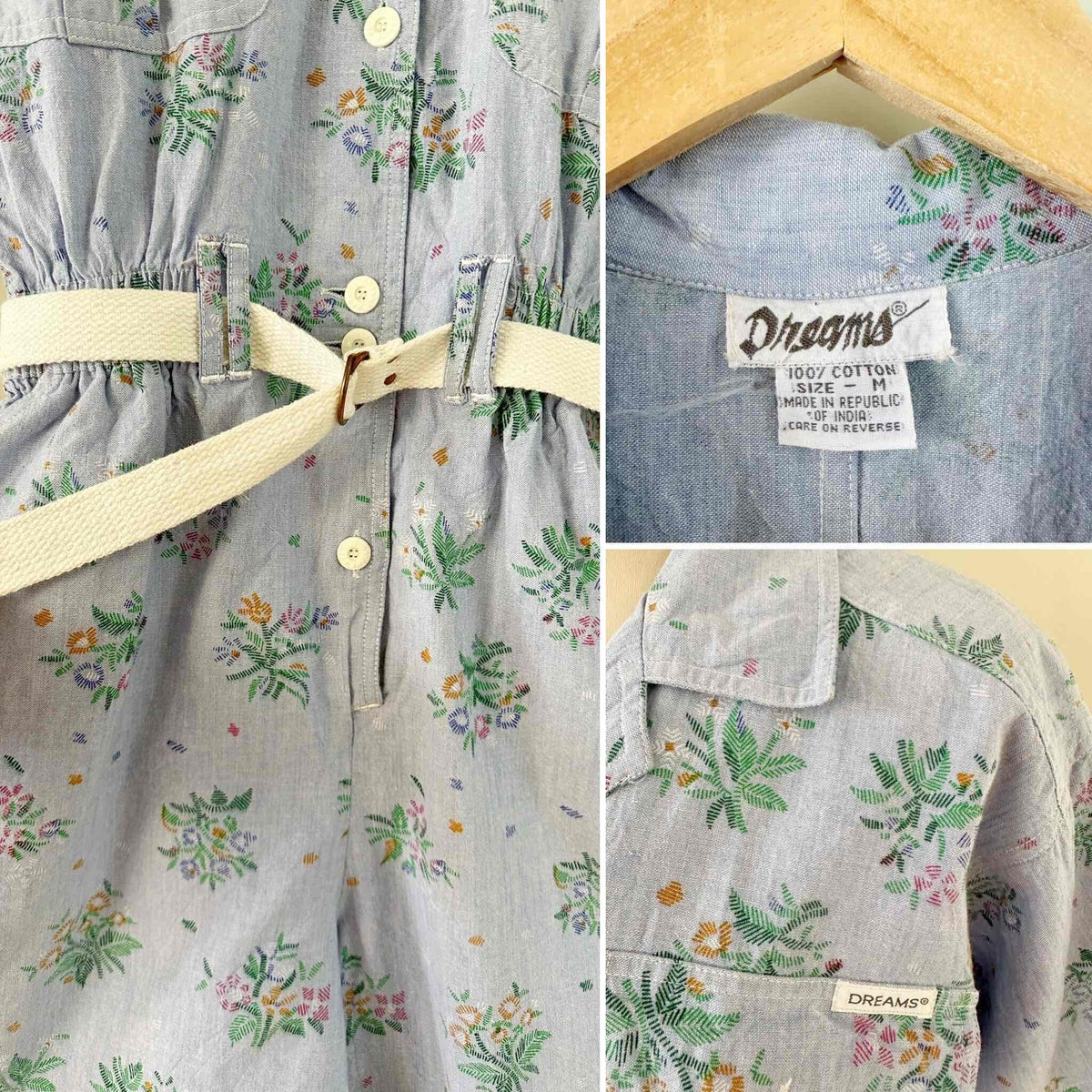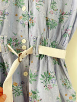Unit price perCotton floral print playsuit, in chambray cotton with a denim blue effect, printed with multicolored flowers, safari style, elastic waist, buttoned, and white grosgrain belt, 90s style, current size 36, worn here on a size 36 mannequin.