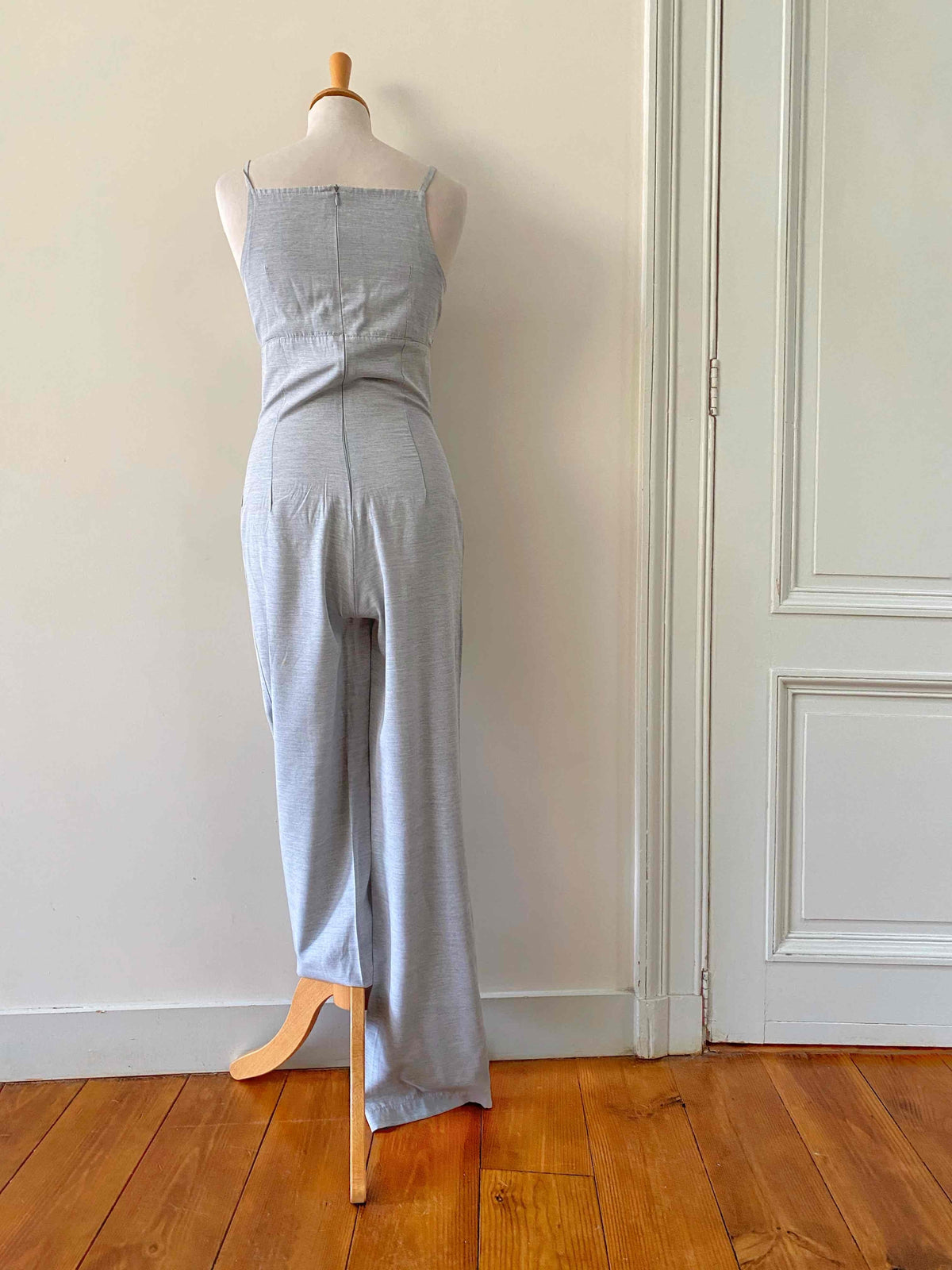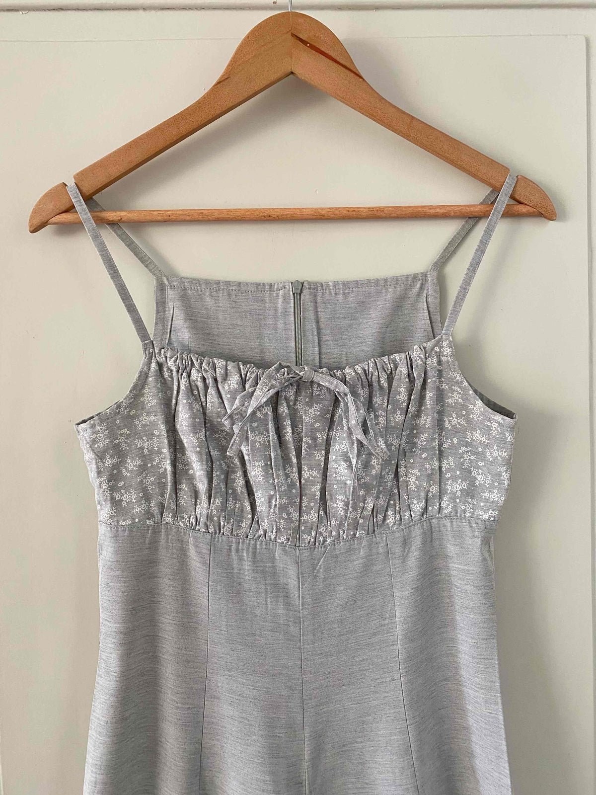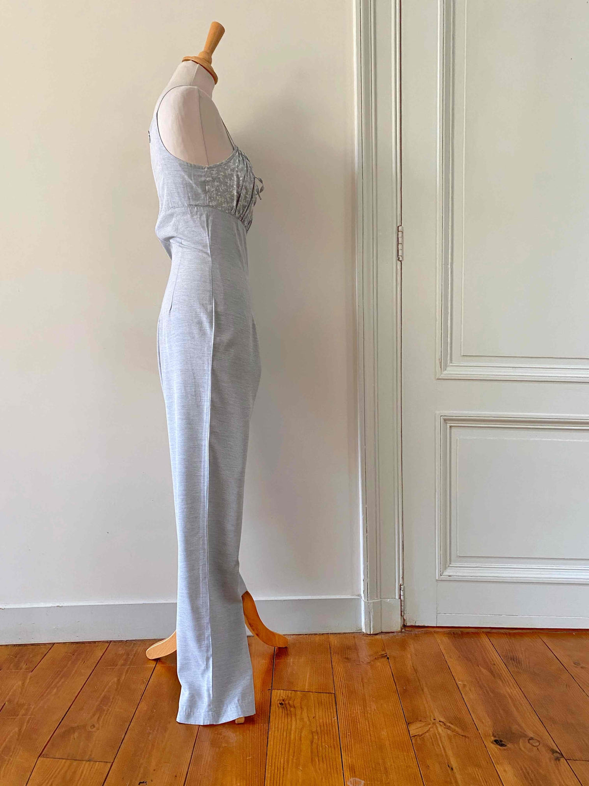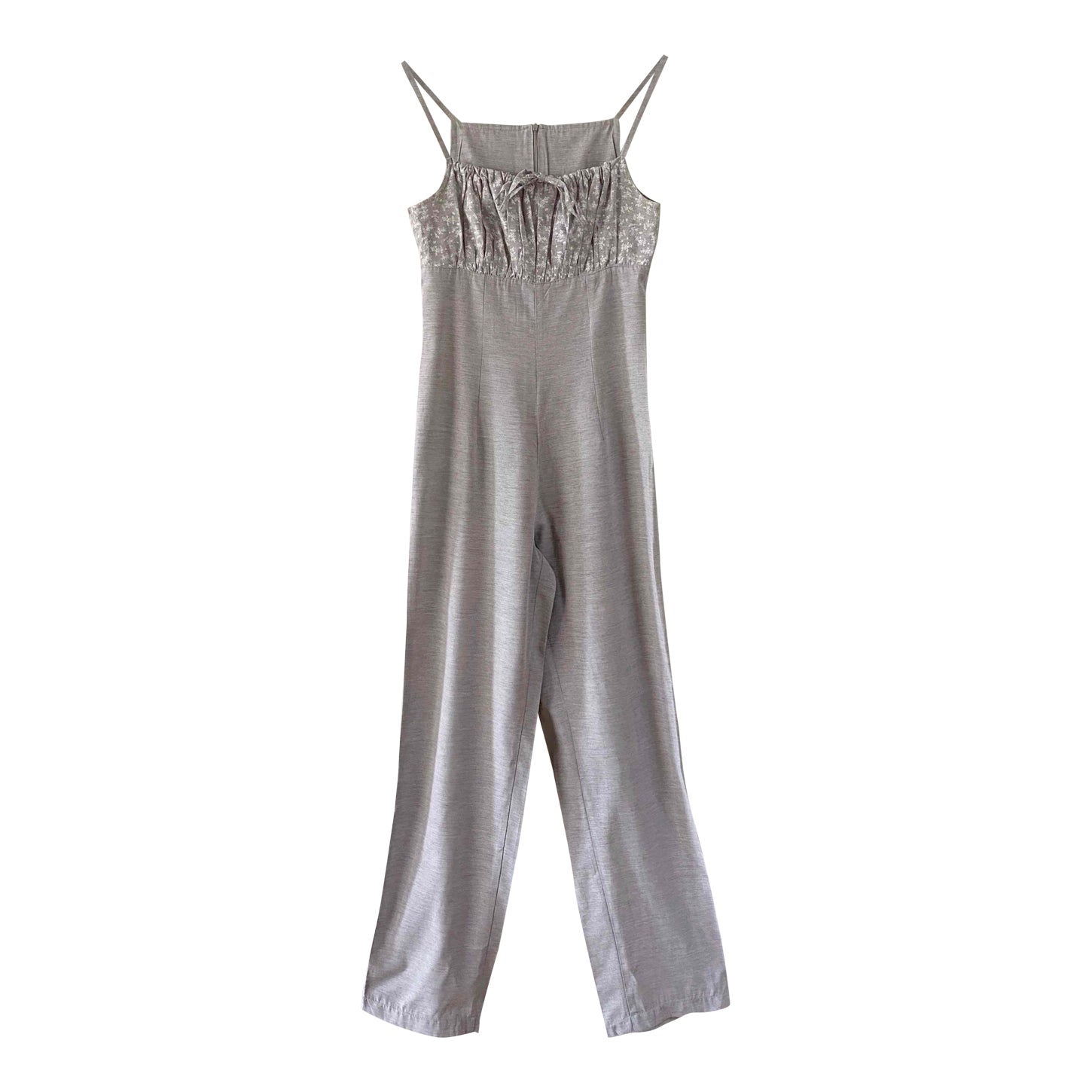 Unit price perFloral jumpsuit in light grey mottled viscose, adjustable spaghetti straps that tie at the bust, gathered top with a print of small white flowers, zip closure at the back, long straight legs, made in France, current size 34 or small 36 shown here on a size 36 mannequin. Measurements: Bust: 42cm