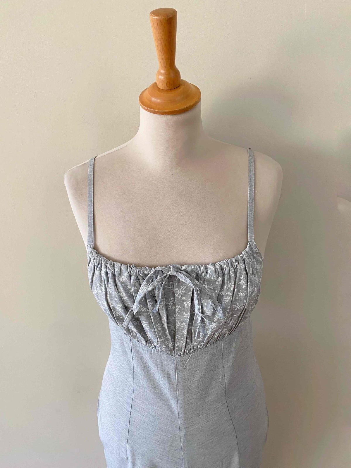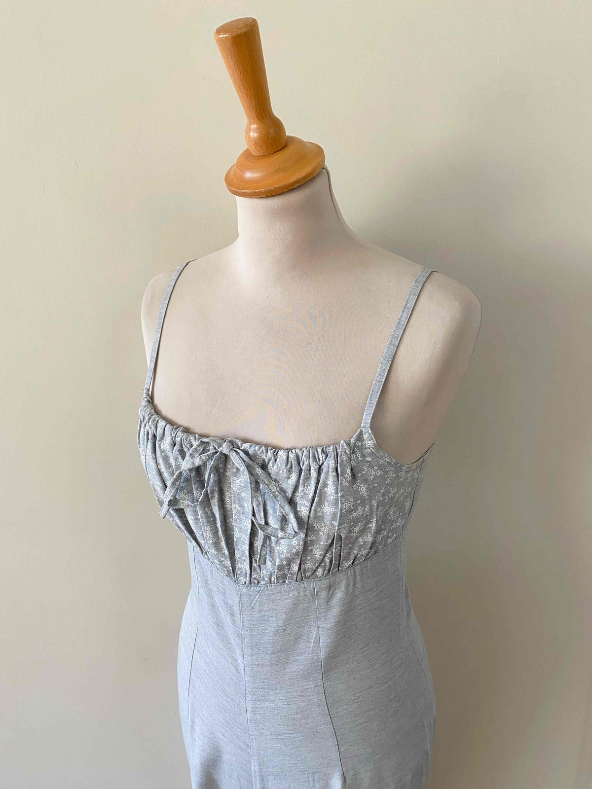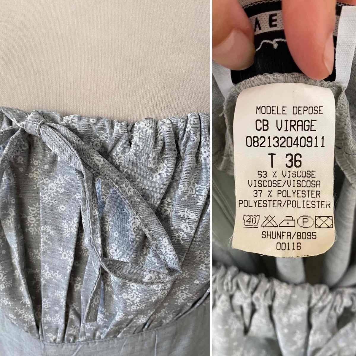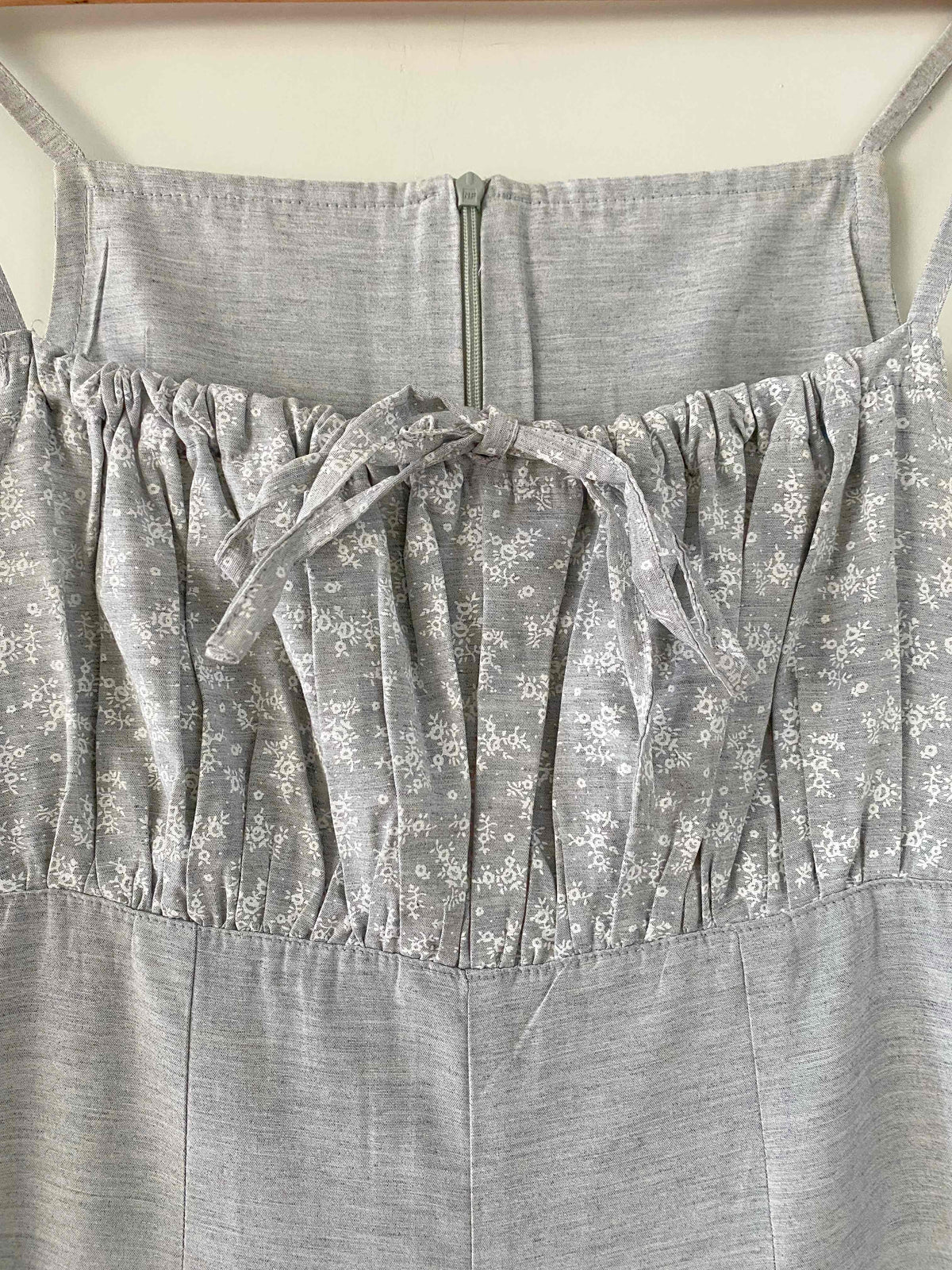 Unit price perFloral jumpsuit in light grey mottled viscose, adjustable spaghetti straps that tie at the bust, gathered top with a print of small white flowers, zip closure at the back, long straight legs, made in France, current size 34 or small 36 shown here on a size 36 mannequin. Measurements: Bust: 42cm