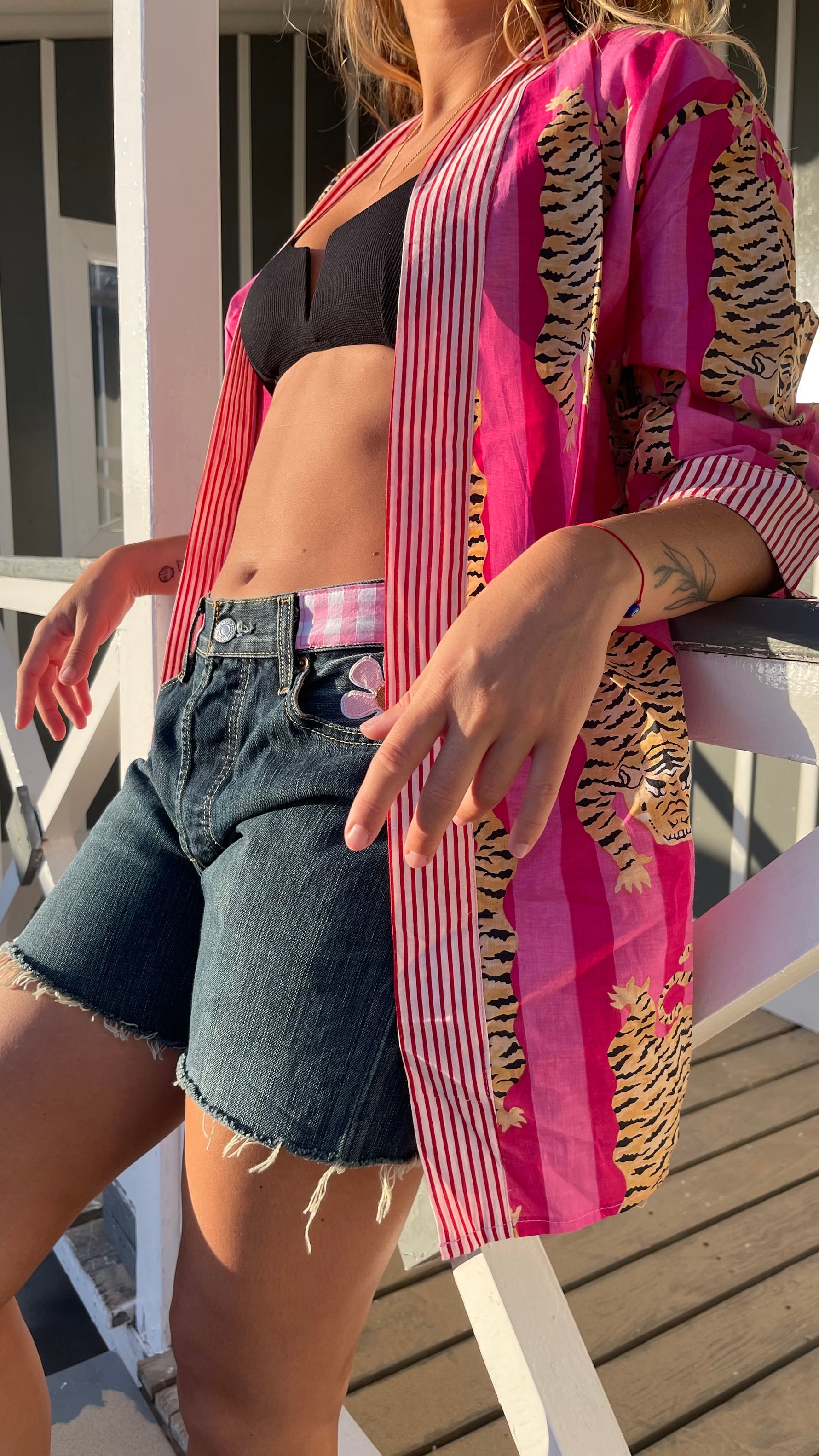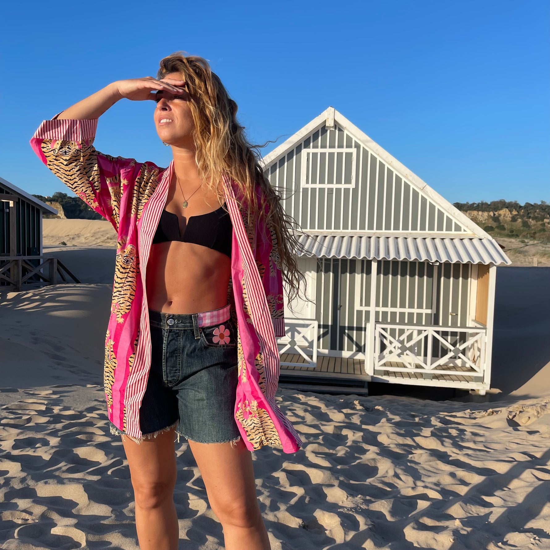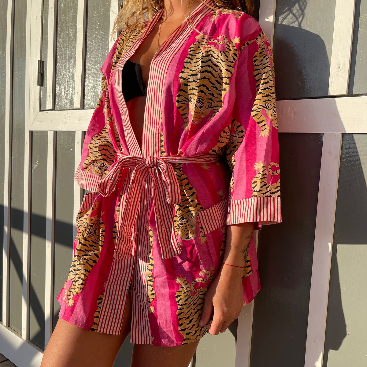 Short Indra cotton kimono. Two patch pockets + a belt. Made in India to order within one working month.