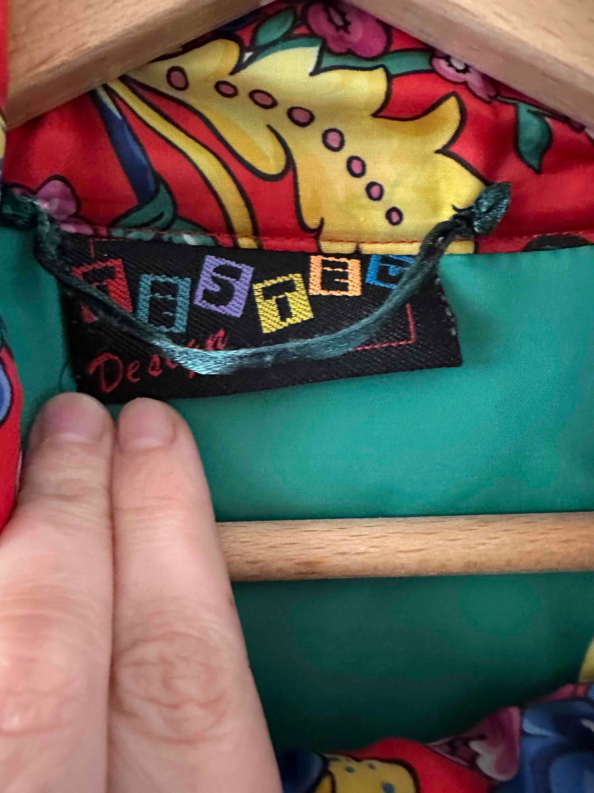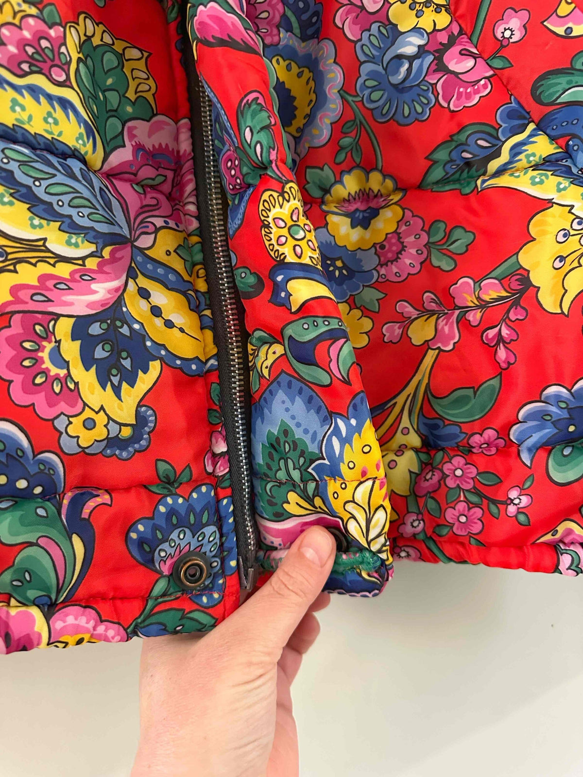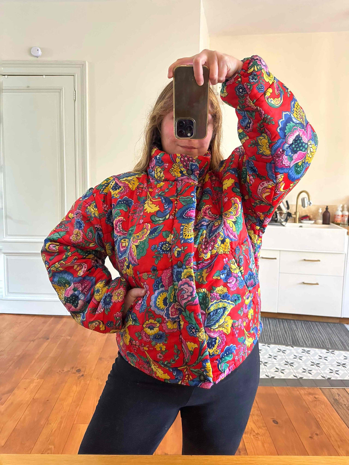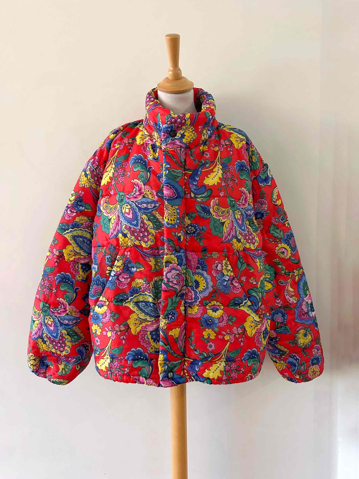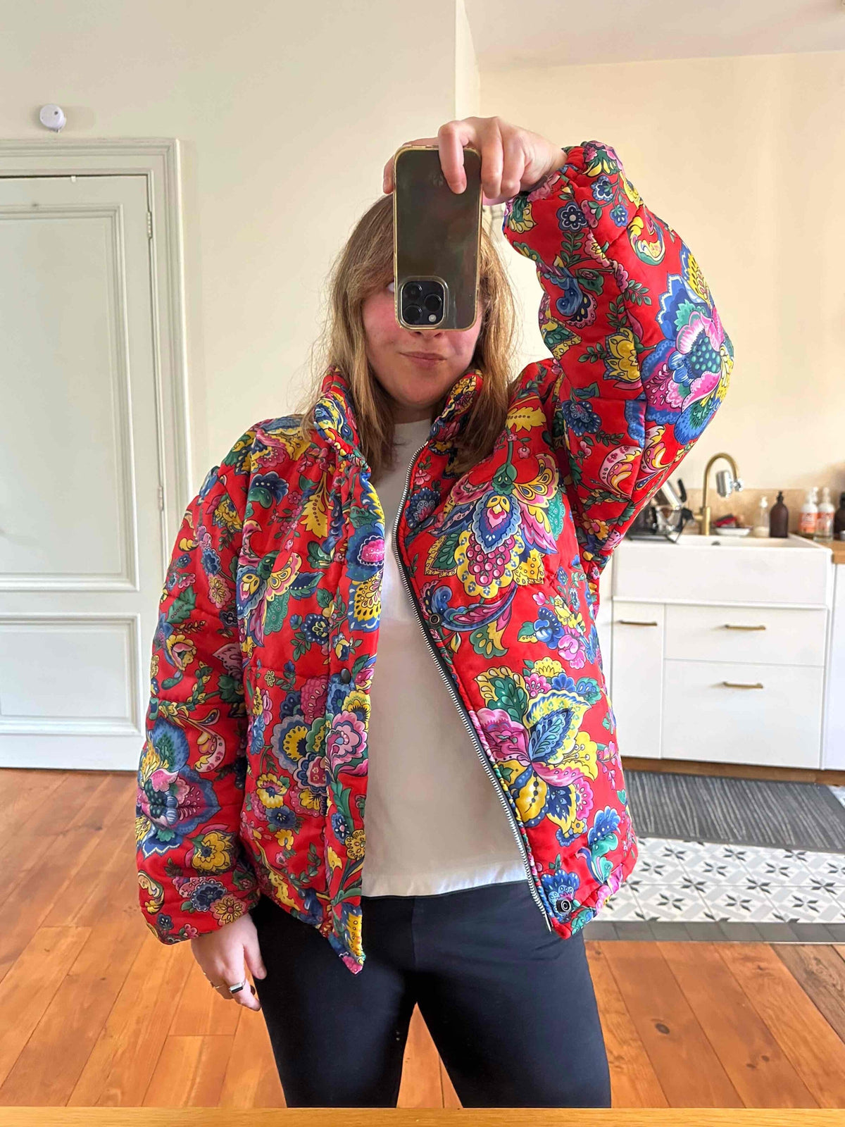 Unit price perDoudoune motifs paisley, en nylon rouges imprimé paisley multicolore, matelassée rembourrée, années 90s, convient aux tailles 36/38/40 porté ici sur un mannequin T36 et sur une personne T40.