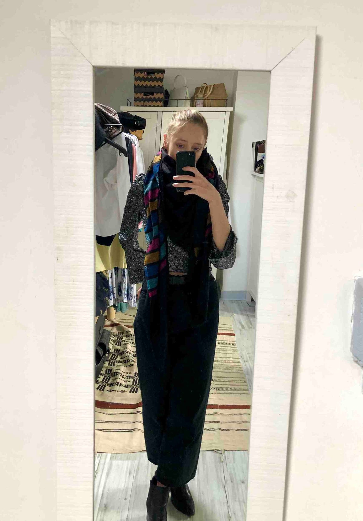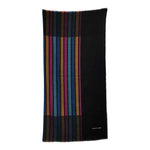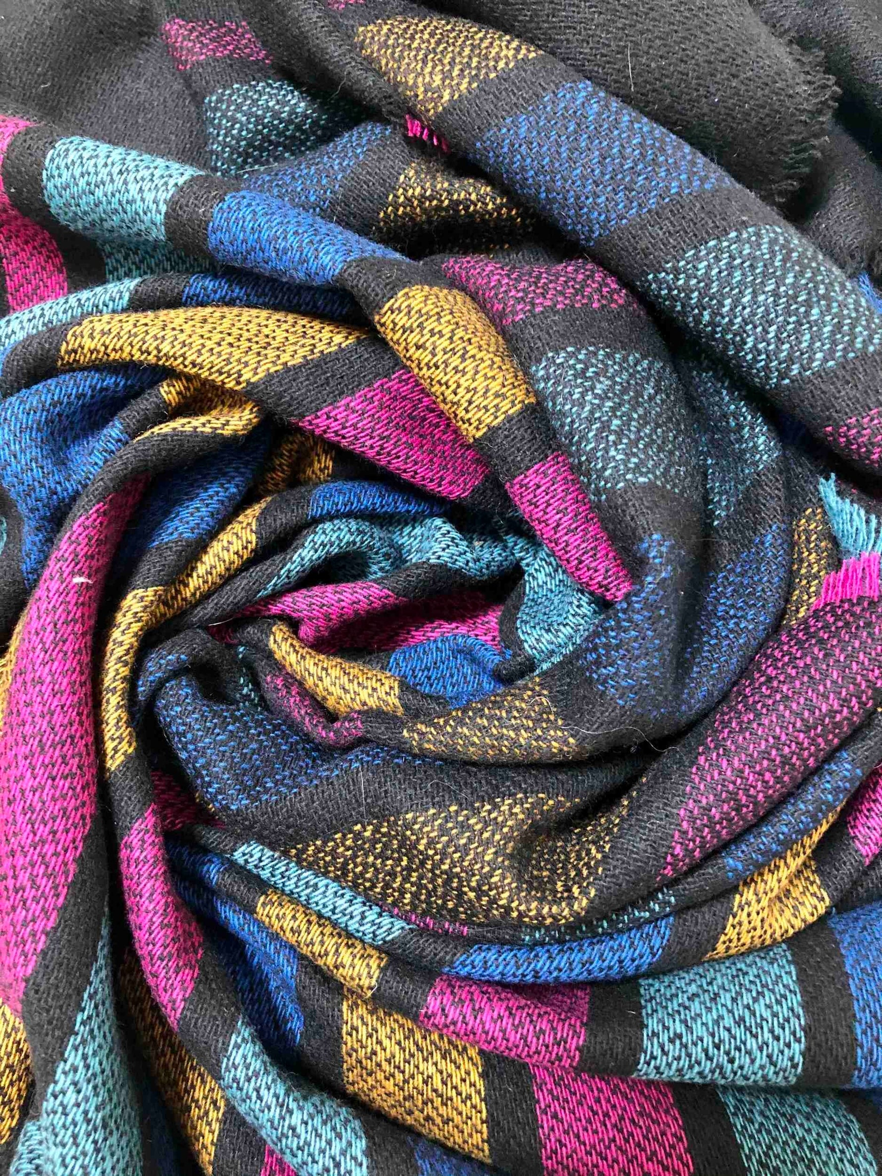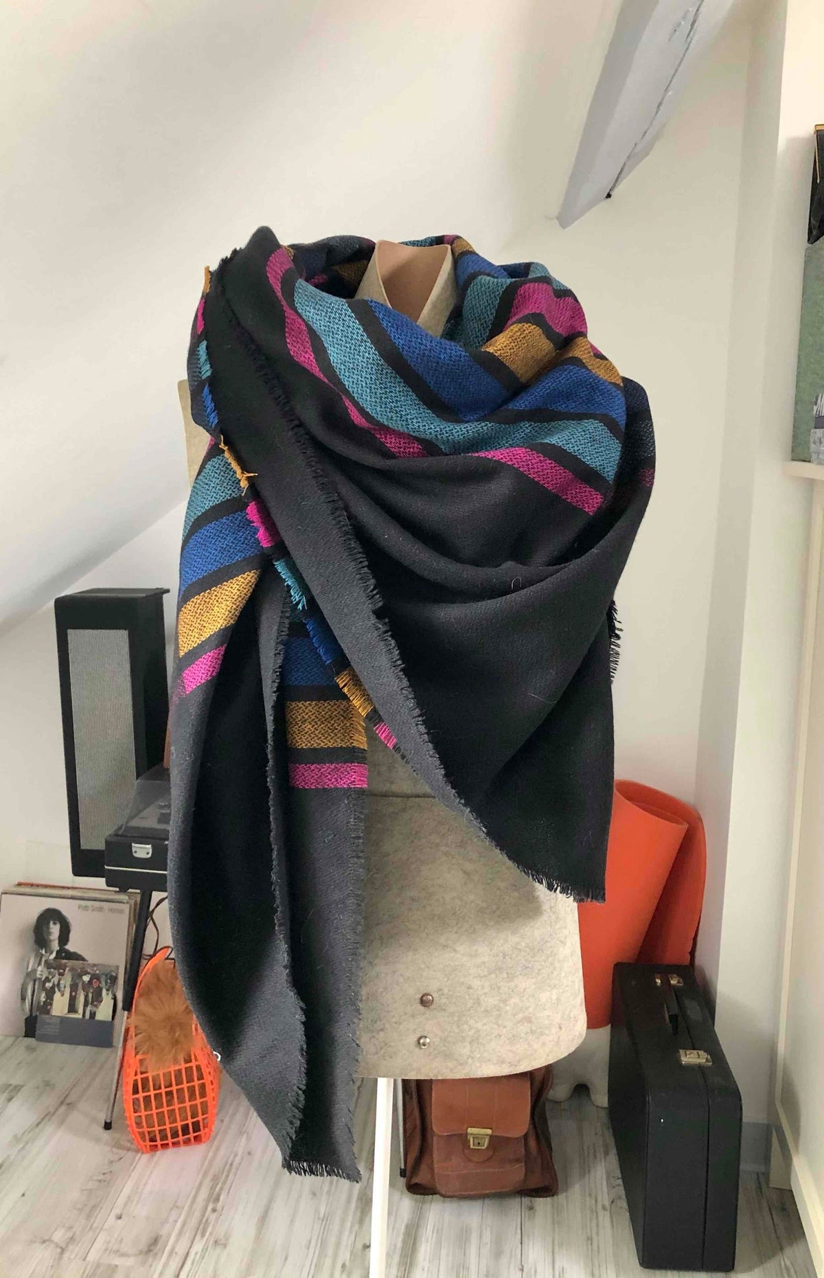 Unit price perEmanuel Ungaro wool scarf. Very large square format, fringed on the edges. Multicolored stripes on a black background. A vintage 90's piece from the French designer.