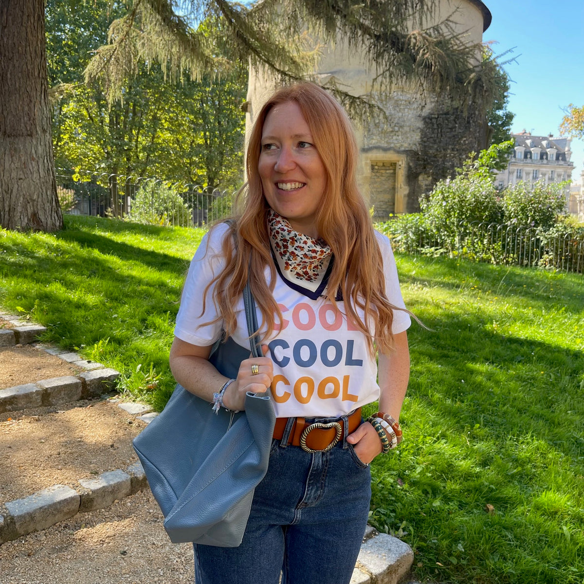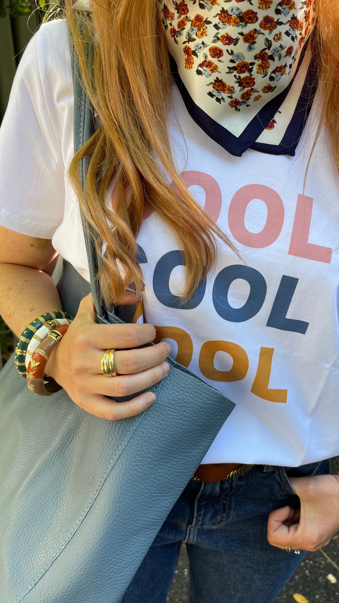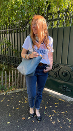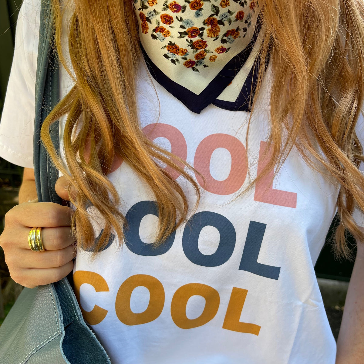 A fun and casual essential that goes with everything. This white cotton t-shirt features a COOL print in three colors (pink, navy, and mustard yellow) for a graphic and vibrant touch. Its crew neck gives it a modern look and makes it easy to style, whether with the Louis V-neck cardigan or jeans. A basic with a twist, perfect for brightening up your everyday looks with a touch of cheer. Size L runs small, suitable for a size M or a small 40. Made in China. Material: 95% cotton and 5% spandex. Care: Machine wash at 30°C on a delicate cycle at 800 rpm.