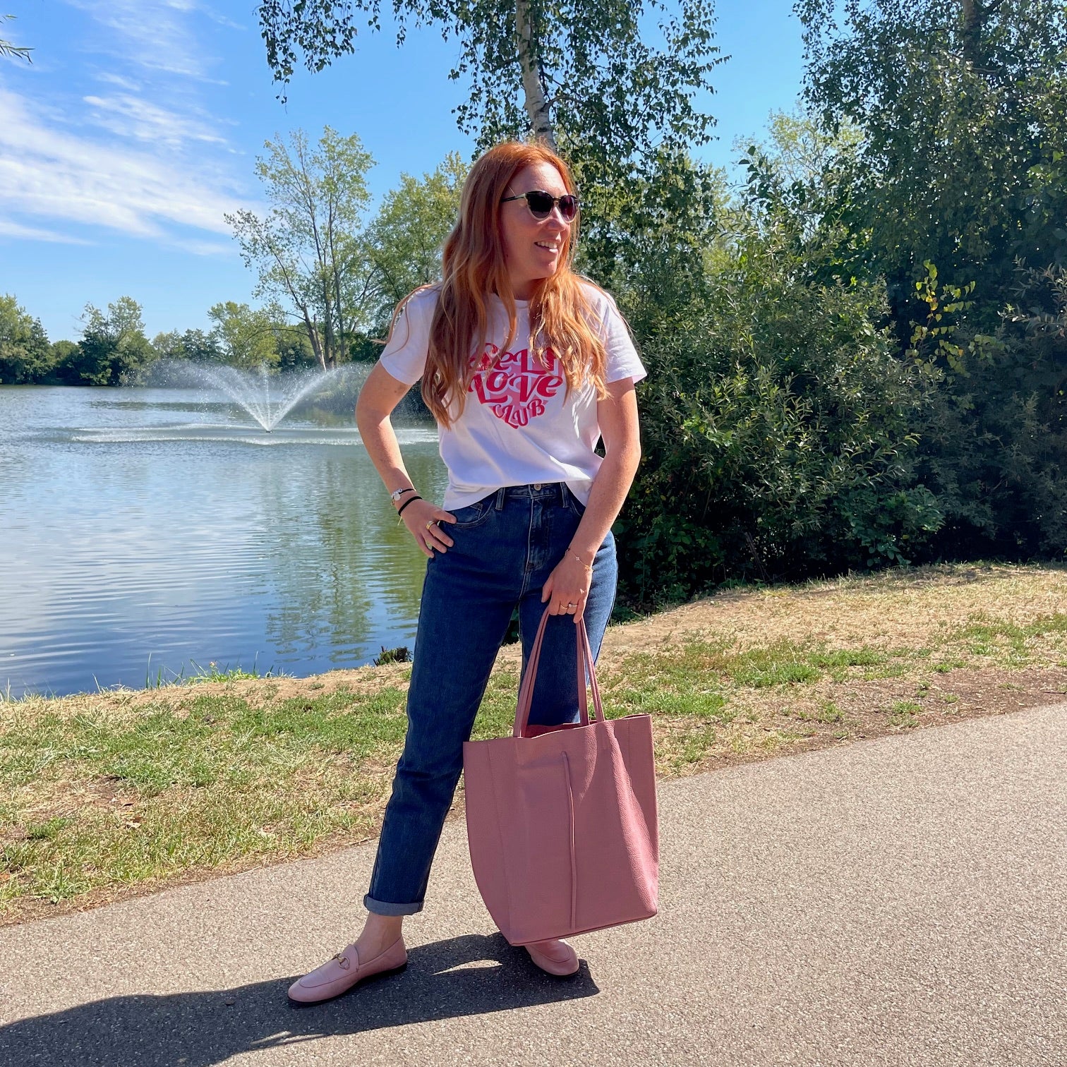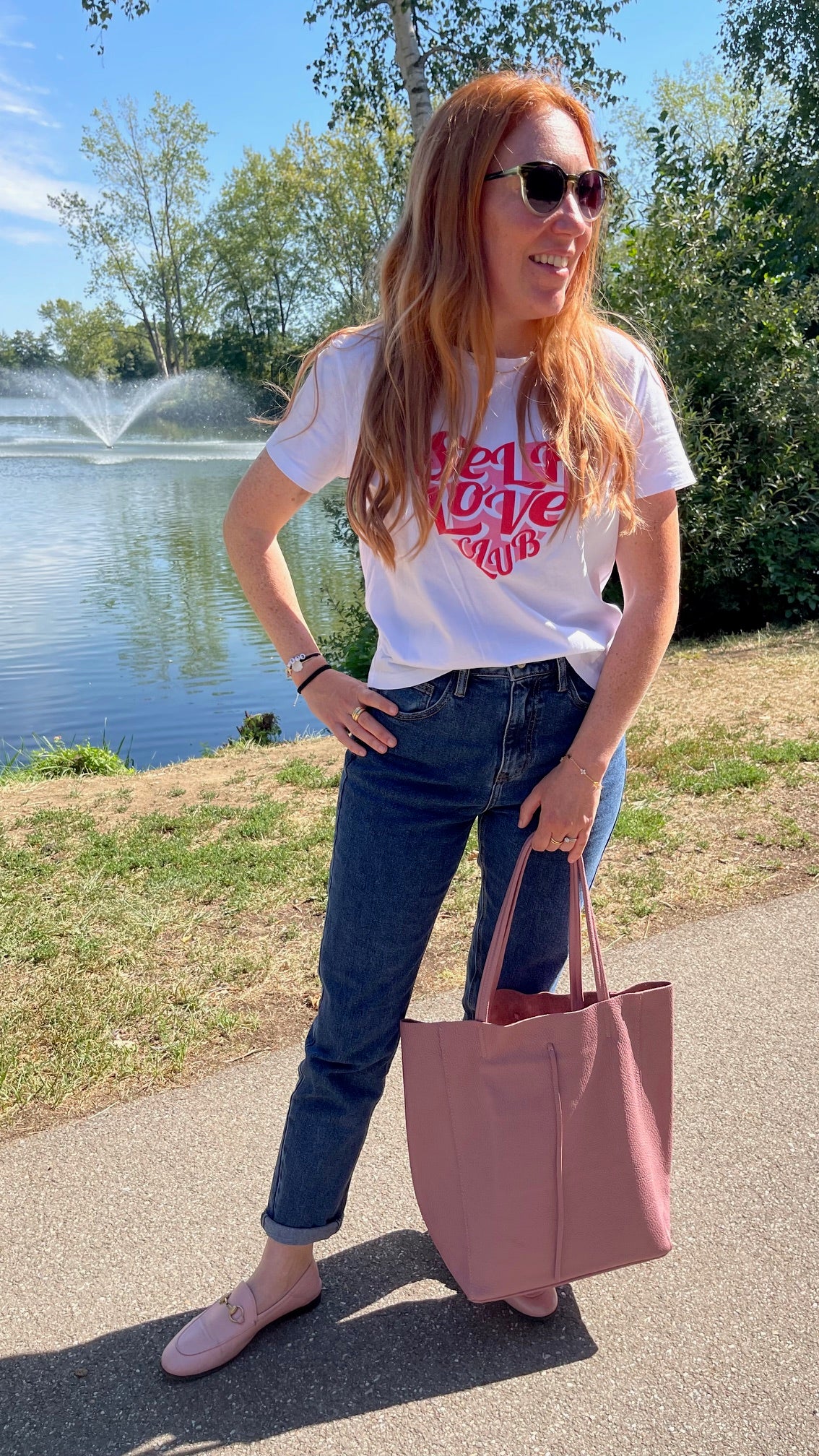 An essential piece brimming with good vibes: this white cotton t-shirt features a retro-inspired "Self Love Club" red heart print. With its fitted, feminine cut, it can be tucked into jeans or worn under a blazer or the Louis V-neck cardigan for a casual-chic look. Its soft, breathable fabric makes it comfortable for everyday wear. A reimagined basic that sends a positive and inspiring message: because self-love is forever. Size M runs small, fits like a size S, and size L also runs small, fits like a size M. Made in China. Material: 100% cotton. Care: Machine wash at 30°C on a delicate cycle at 800 rpm.