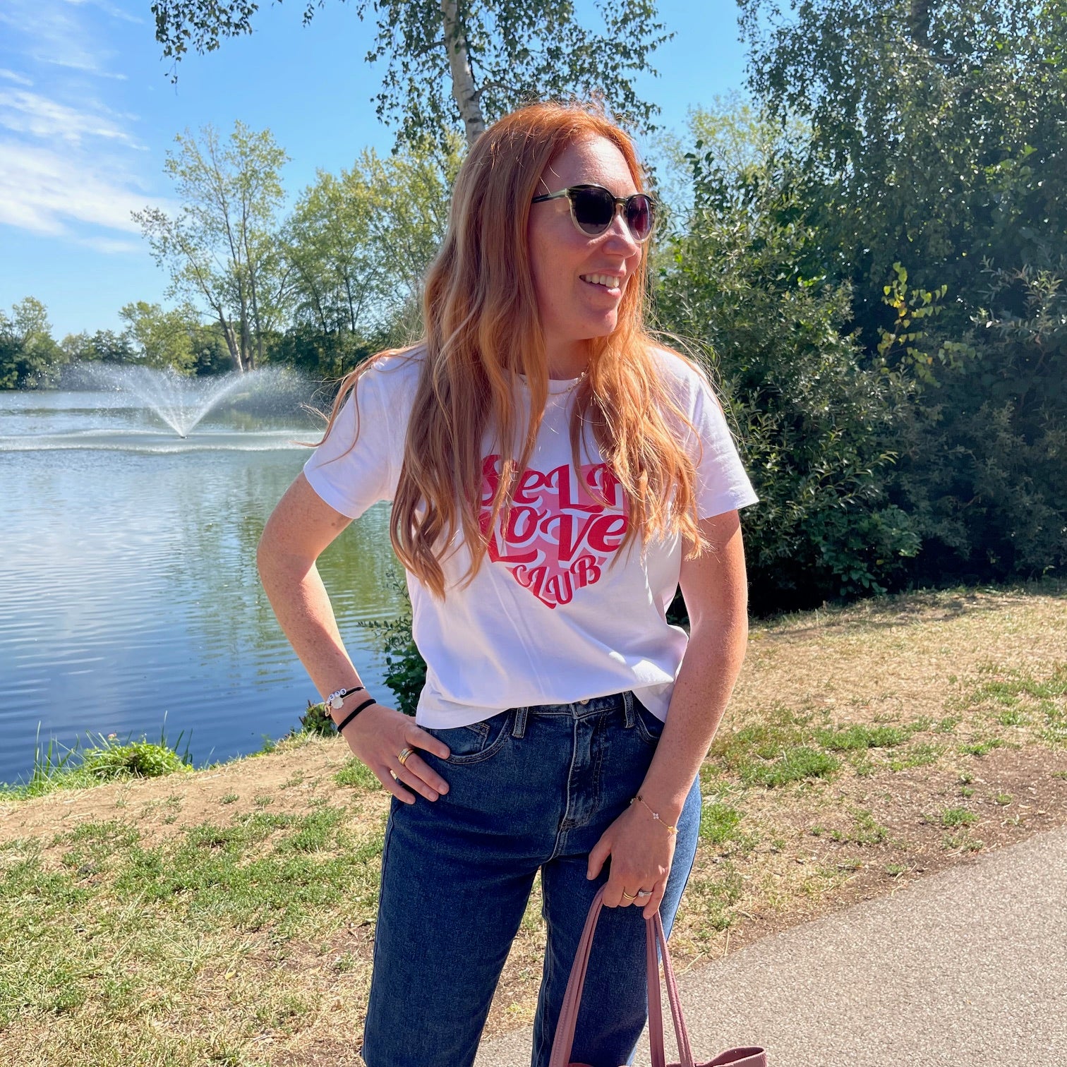 Slim-fit cotton T-shirt with "Self Love Club" heart print. Jeans.