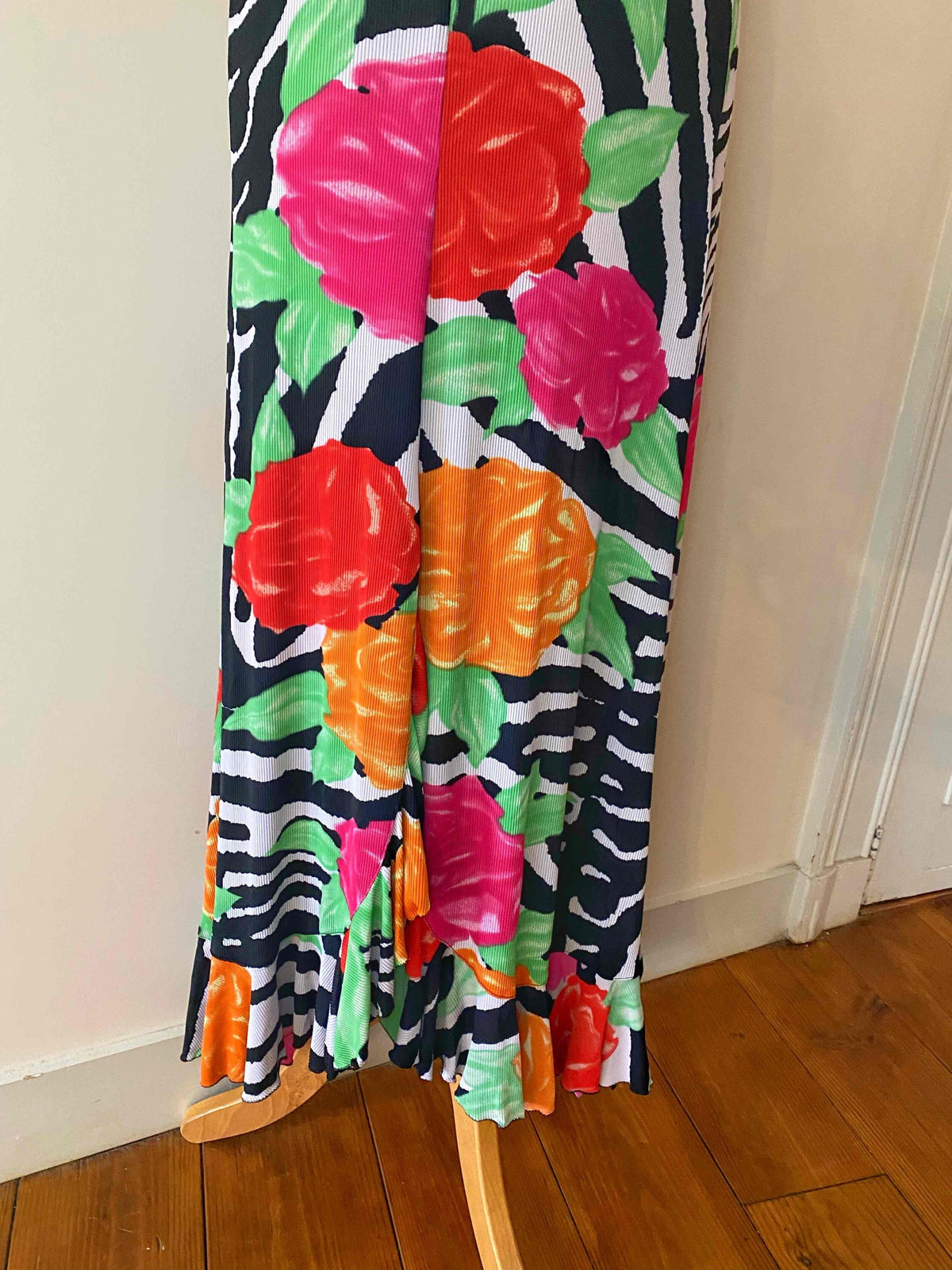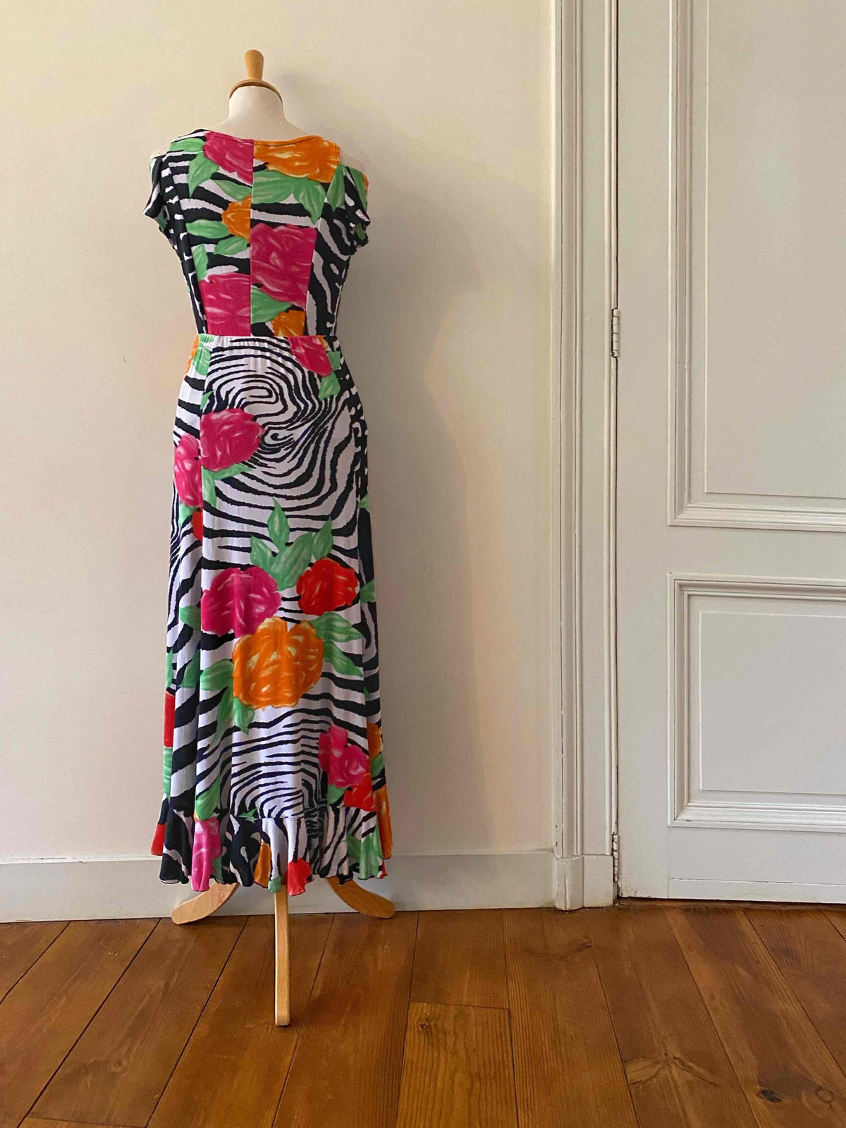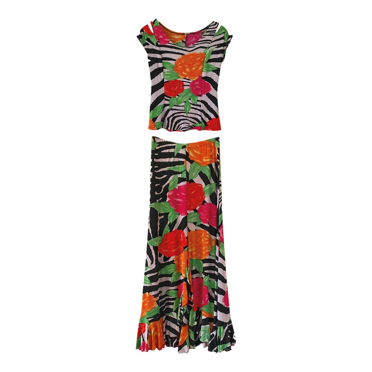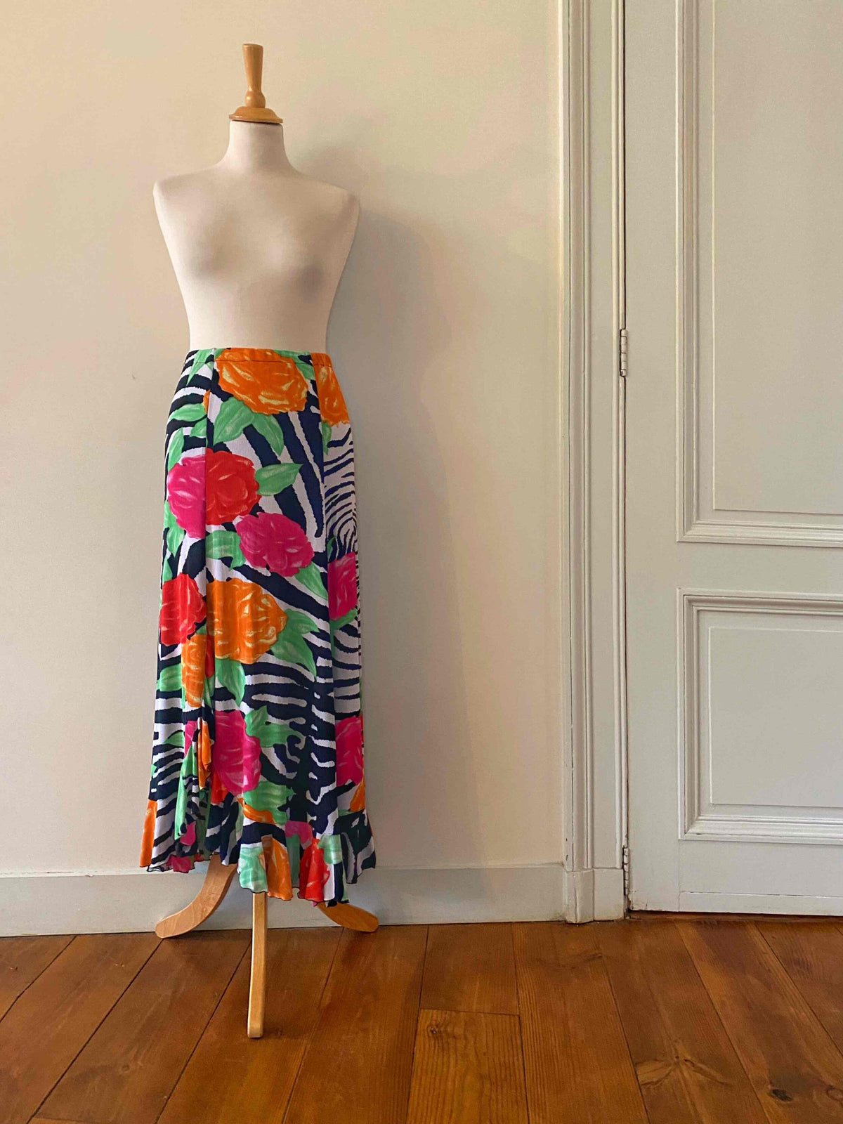 Unit price perZebra and floral print skirt and top set, in flowing ribbed knit fabric with a zebra print and large fuchsia, orange and green flowers. The skirt is a long, asymmetrical, flared style, and the top is a peeka-boo style with open, bare shoulders. Made in France, size 36 (shown here on a size 36 mannequin). Skirt measurements: waist 33cm, length 88cm. Top measurements: armpit to armpit 42cm, length 55cm.