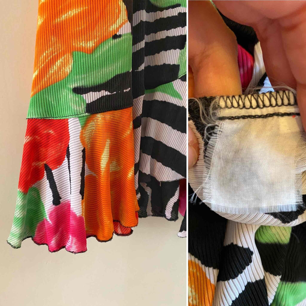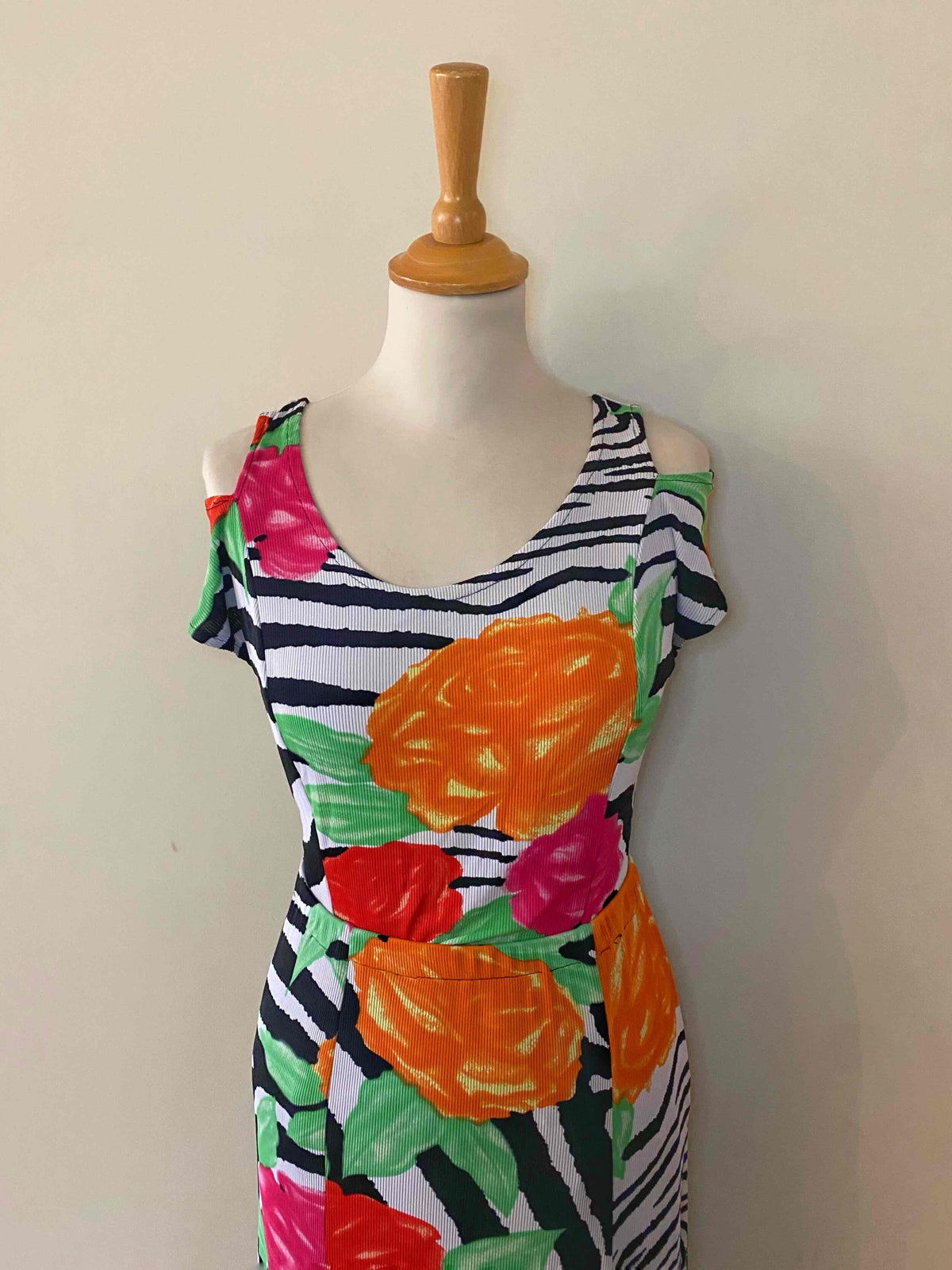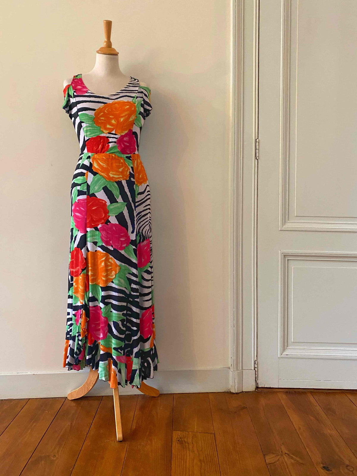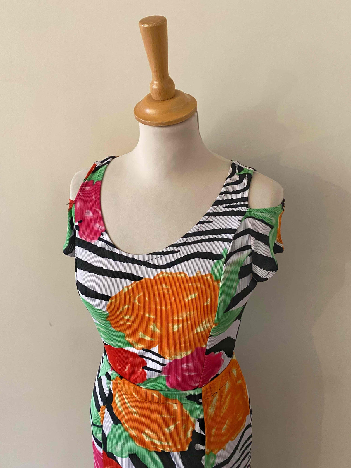 Unit price perZebra and floral print skirt and top set, in flowing ribbed knit fabric with a zebra print and large fuchsia, orange and green flowers. The skirt is a long, asymmetrical, flared style, and the top is a peeka-boo style with open, bare shoulders. Made in France, size 36 (shown here on a size 36 mannequin). Skirt measurements: waist 33cm, length 88cm. Top measurements: armpit to armpit 42cm, length 55cm.