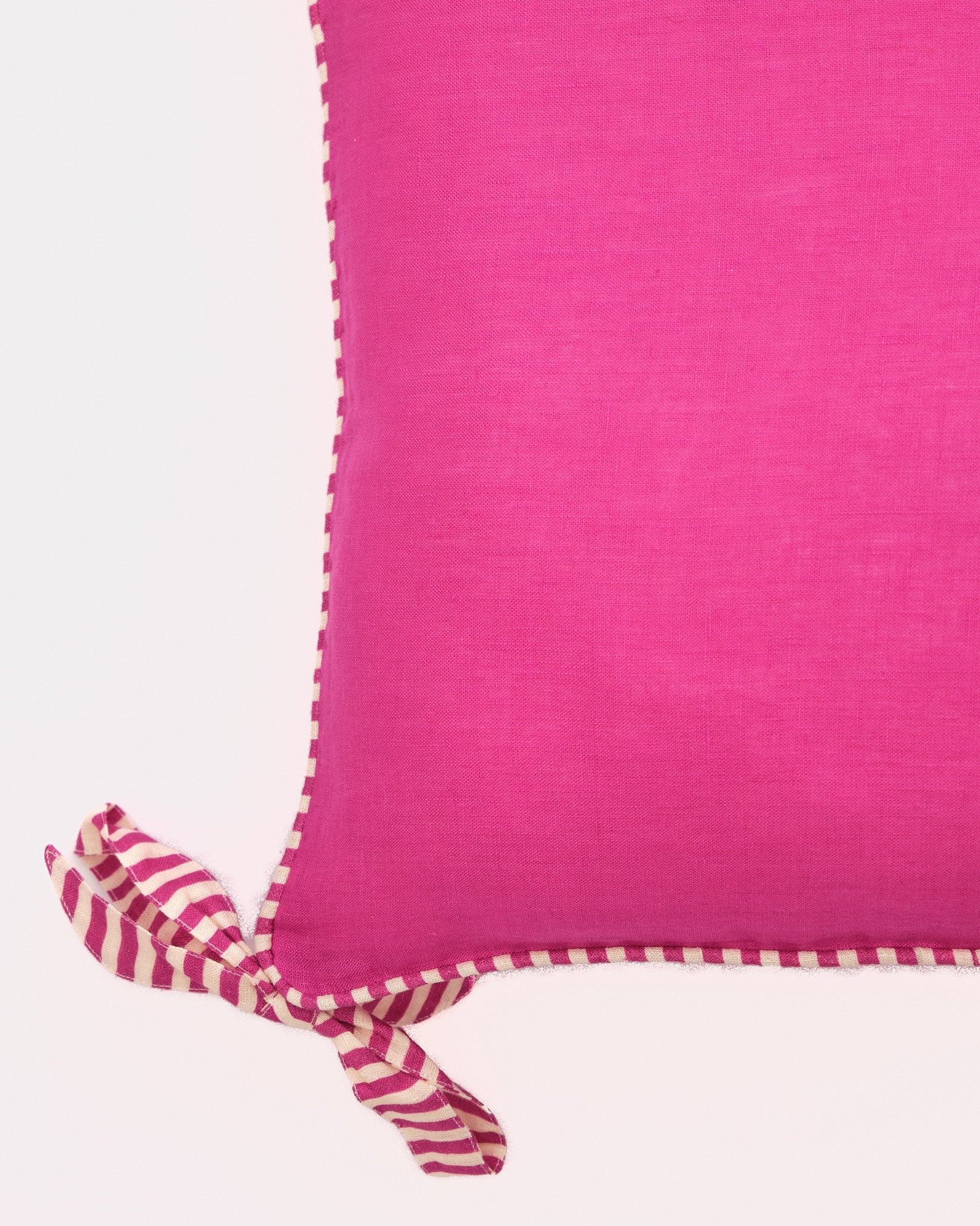 Crafted from premium European linen, this cushion cover is digitally printed with eco-friendly dyes finished with striped piping and ribbons at each corner. Each piece is 45 x 45 cm.