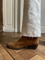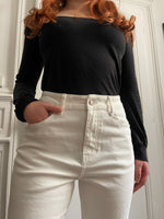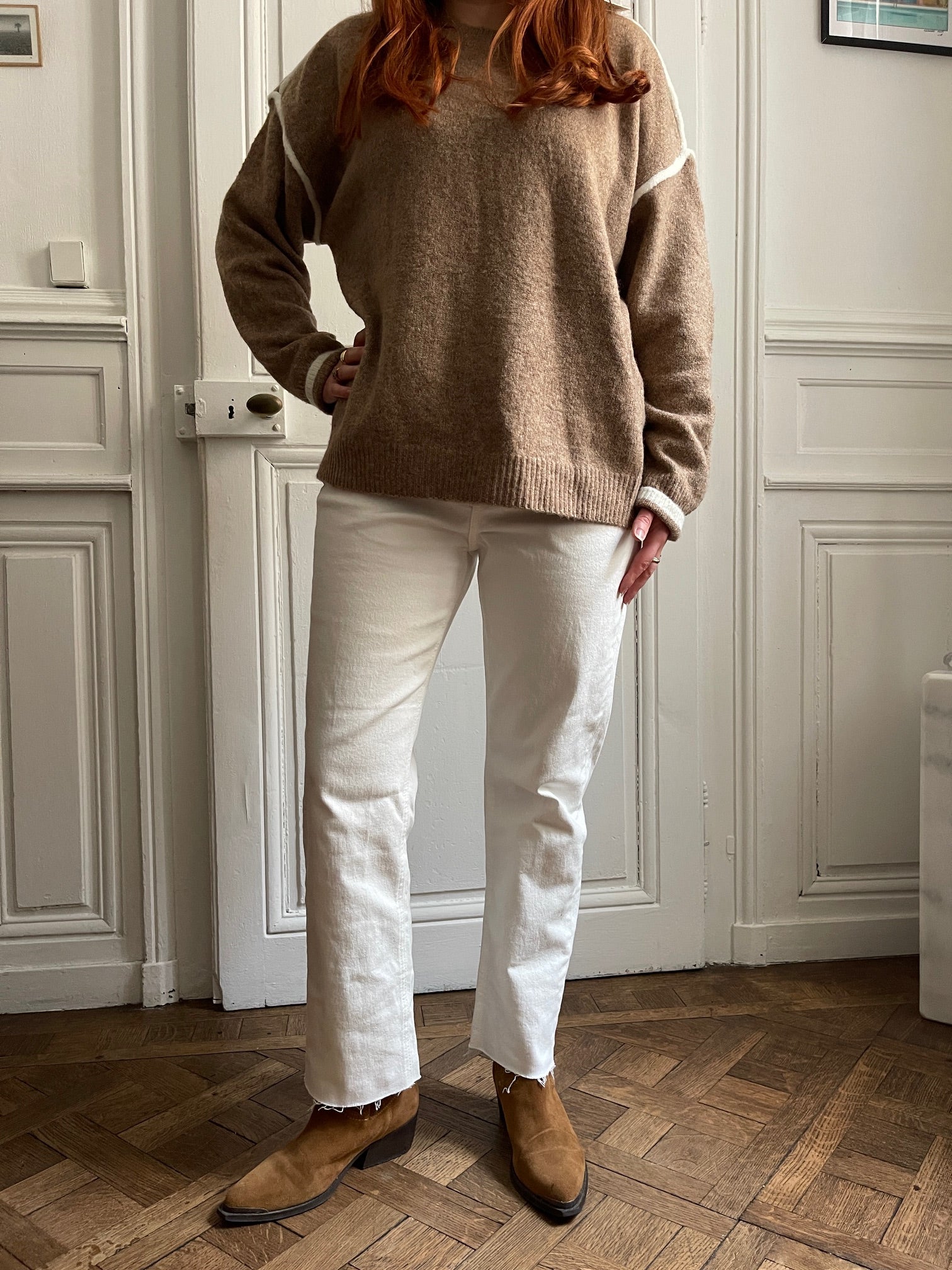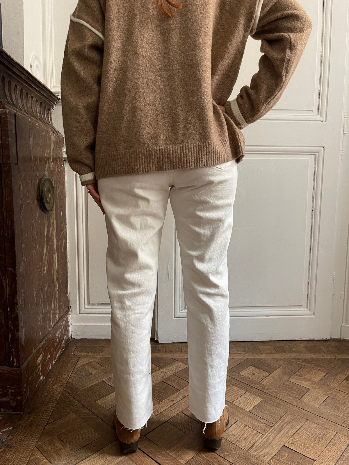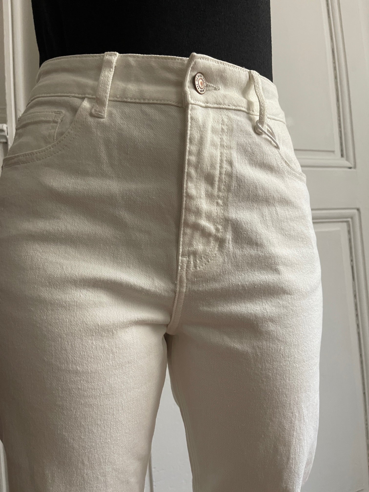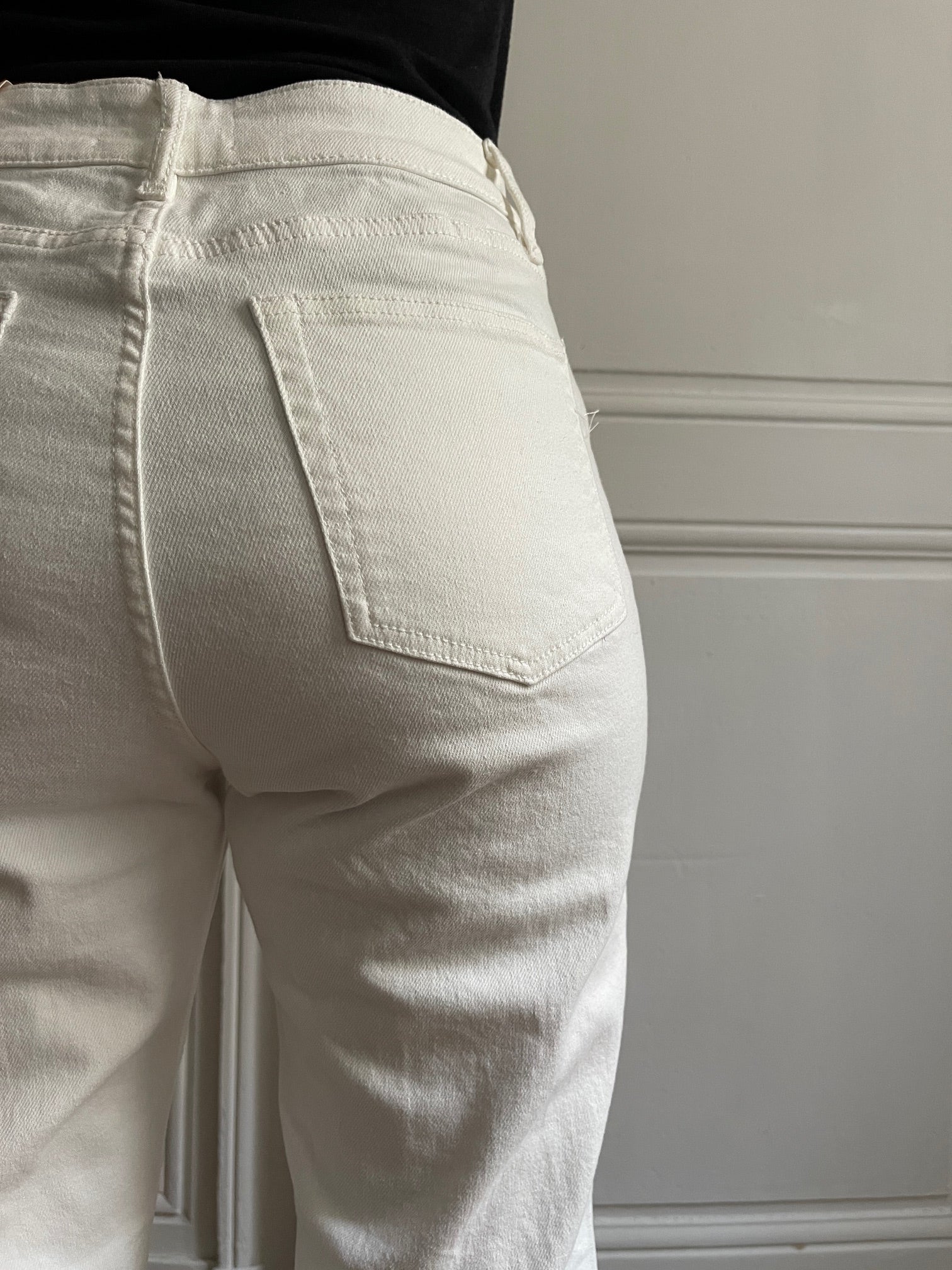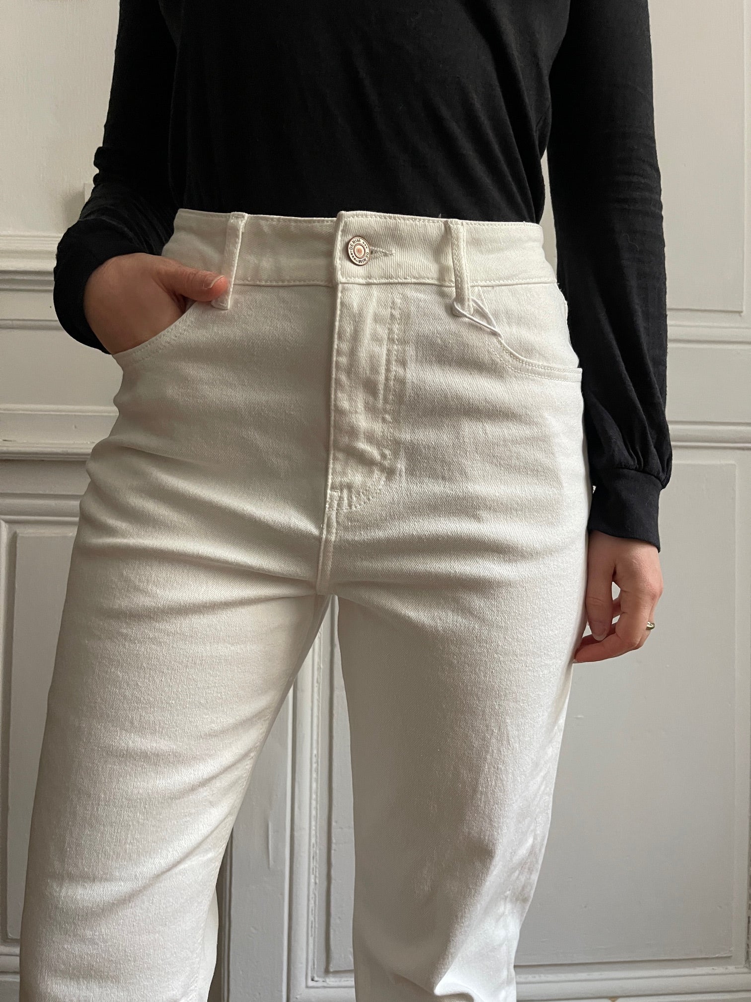 These white jeans are a timeless piece with a modern twist. Made from raw denim with a structured drape, they stand out thanks to their frayed hem, which adds a relaxed and trendy touch. The straight cut elongates the silhouette and can be worn with ankle boots, sneakers, or ballet flats. The high waist hugs your curves while remaining comfortable for everyday wear. A revisited basic to mix with an oversized sweater or a light shirt for a casual-chic look. Size 38. Made in China. Material: 99% cotton and 1% elastane. Care: Machine wash at 30°C on a delicate cycle at 800 rpm. Size L