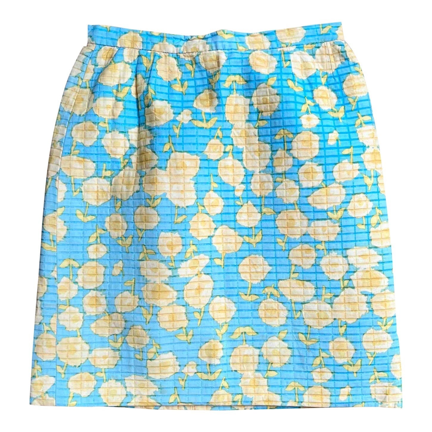 Unit price perQuilted cotton mini skirt, 1970s. Turquoise blue background with a pastel yellow floral pattern. Metal zipper and snaps/press studs. Fully lined. Size 38 or small 40 (waist).