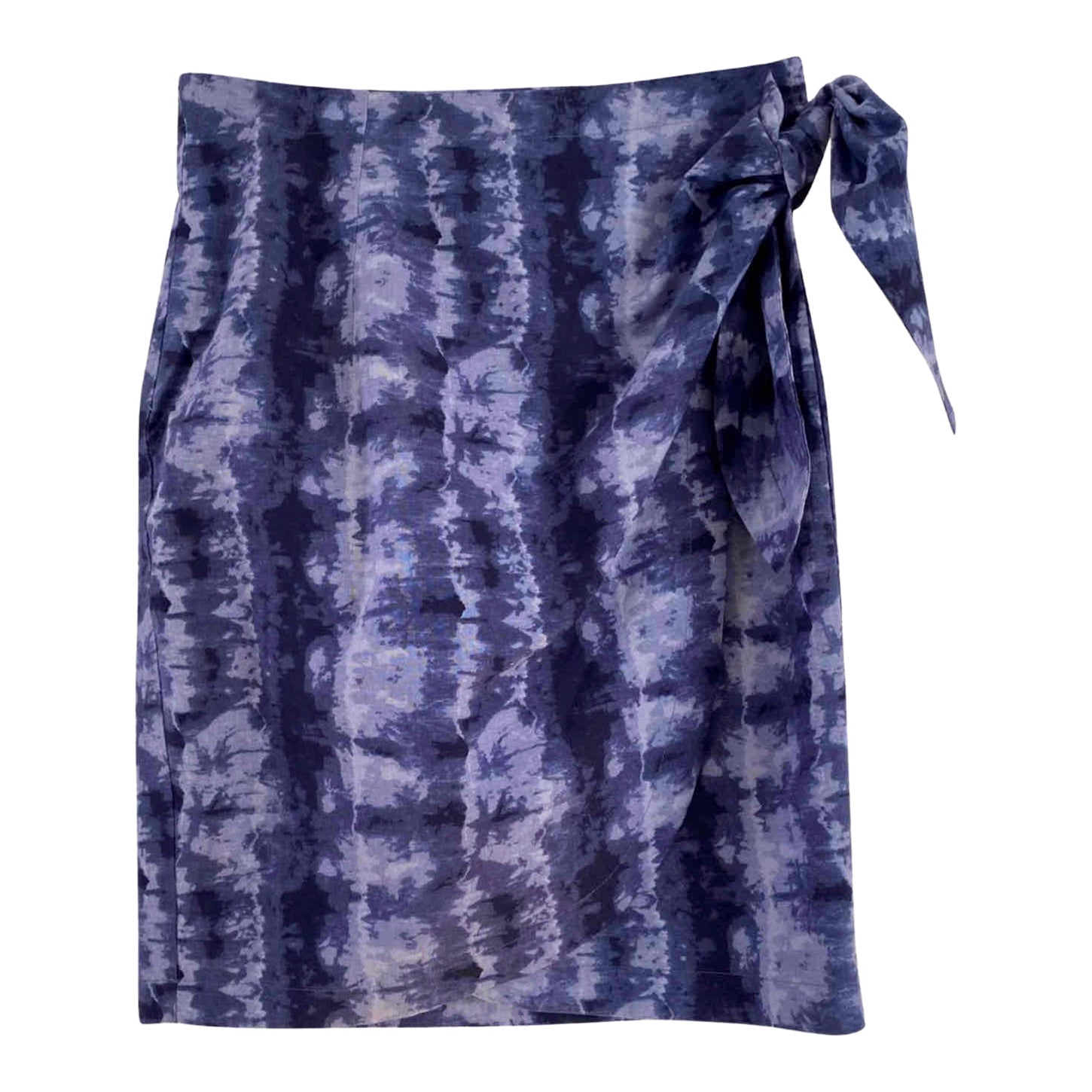 Unit price perTie-dye wrap skirt, made of 100% blue cotton with a sky-blue tie-dye print, with an inner button closure and an outer tie for a wrap-around style, made in France, size 36 shown here on a size 36 mannequin.