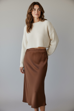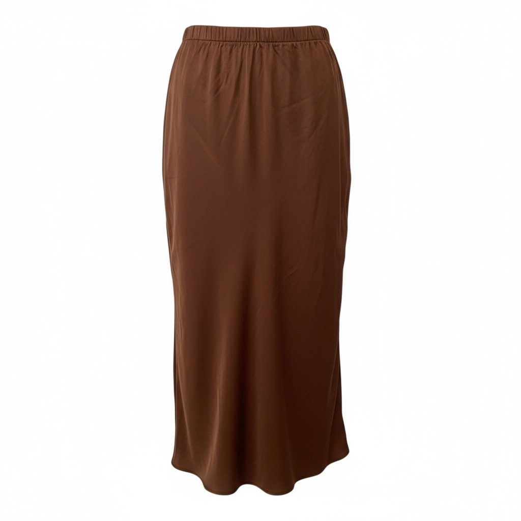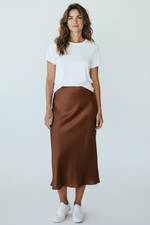 Elegance and softness define this iced brown midi skirt. Made partly from silk, it offers a delicate fluidity and a satiny drape that moves with you naturally. Its clean, feminine cut can be worn with a simple white t-shirt for a casual chic look or with a sweater or blouse for a sophisticated style. A timeless piece that adapts to seasons and occasions, from a relaxed day to an elegant dinner. One size. Made in Italy. Material: . Care: Hand wash recommended or dry clean.