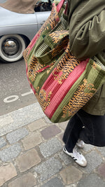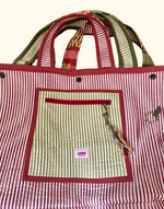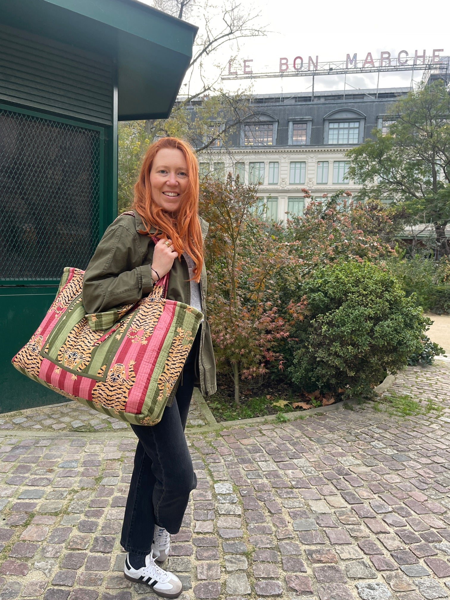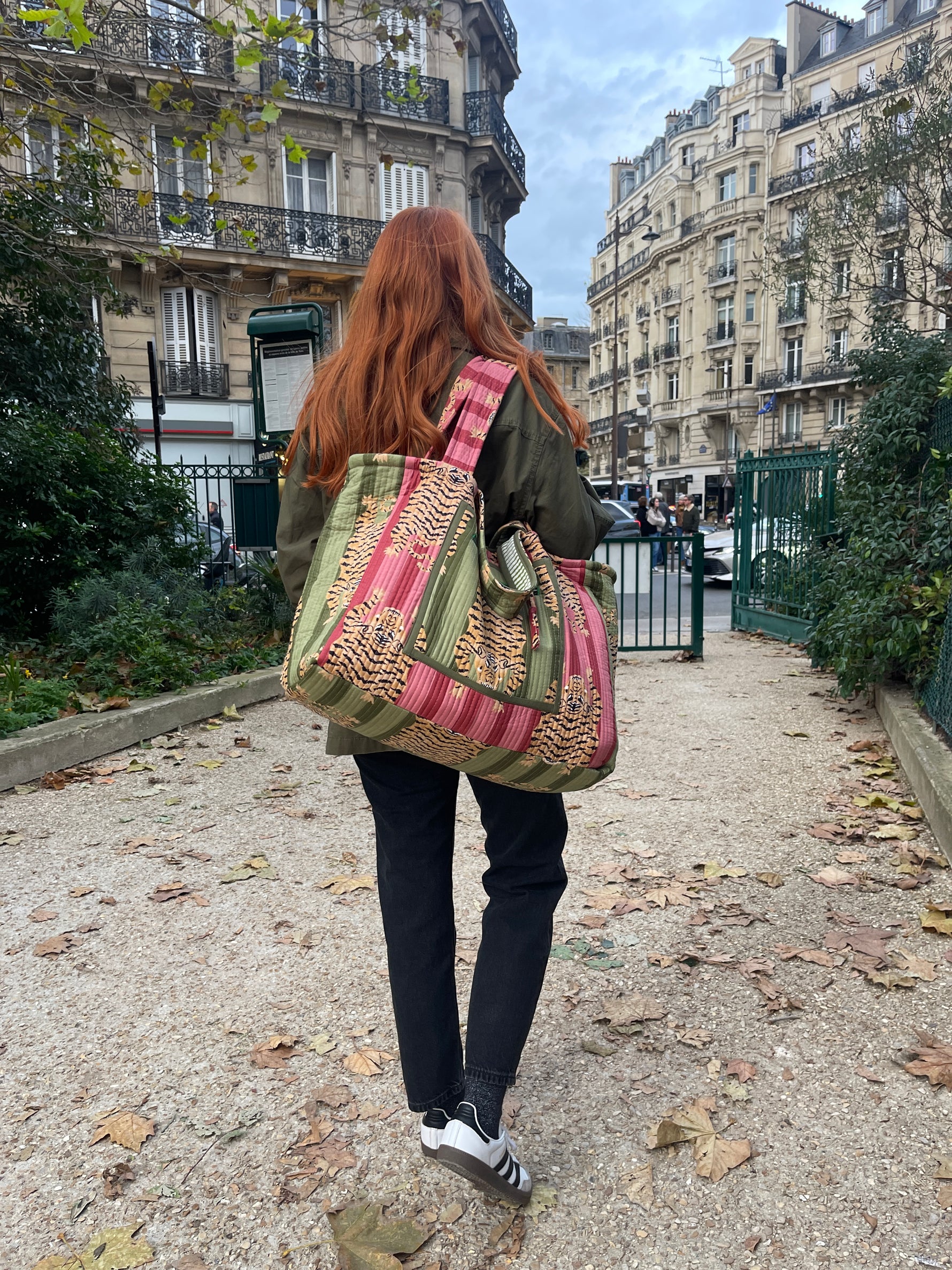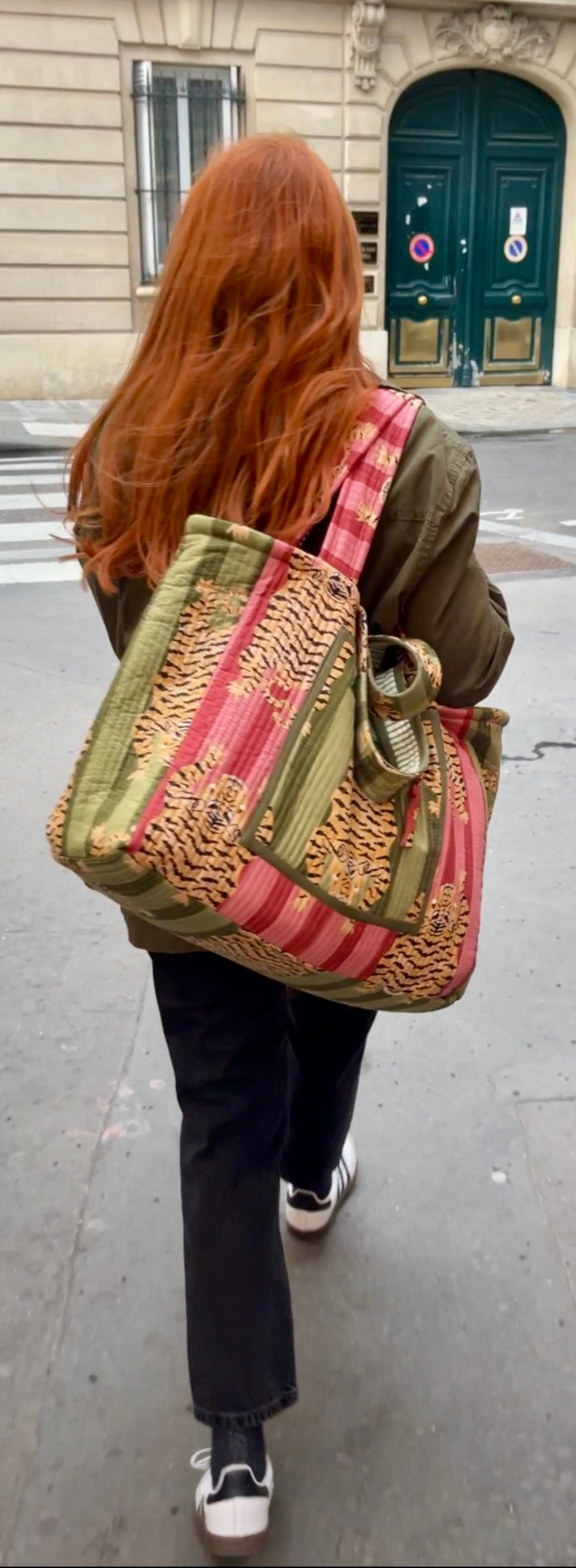 Ravi reversible quilted maxi tote bag. One large zippered pocket on the outside and one on the inside. Three snap buttons to close the bag. Water-repellent fabric lining to protect your belongings. Two handle lengths: one for carrying by hand/by the wrist and the other for carrying over the shoulder. Bias binding throughout. Reversible, striped interior. Made in France to order within one business month. Dimensions: 45cm x 15cm x 35cm - Large handles: 38cm - Small handles: 20cm - Interior/exterior pockets: 23cm