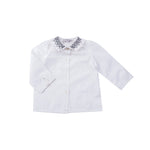 Jolie chemise à manches longues, en popeline blanche, à col claudine festonné et brodé de fil bleu. Avec son col volant minutieusement smocké, et des boutons recouverts elle s'accorde parfaitement avec notre short Salomé.
