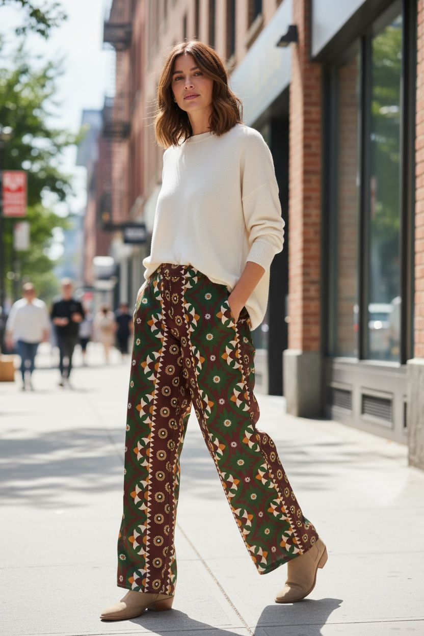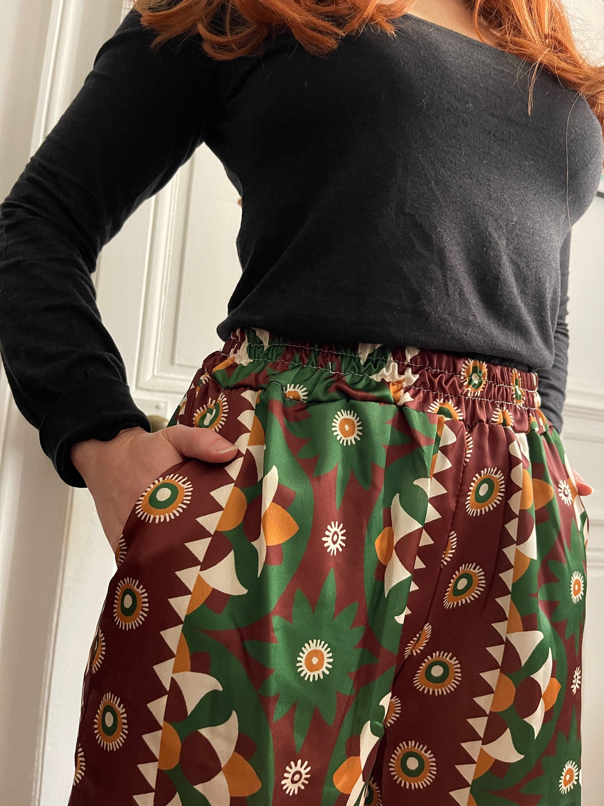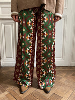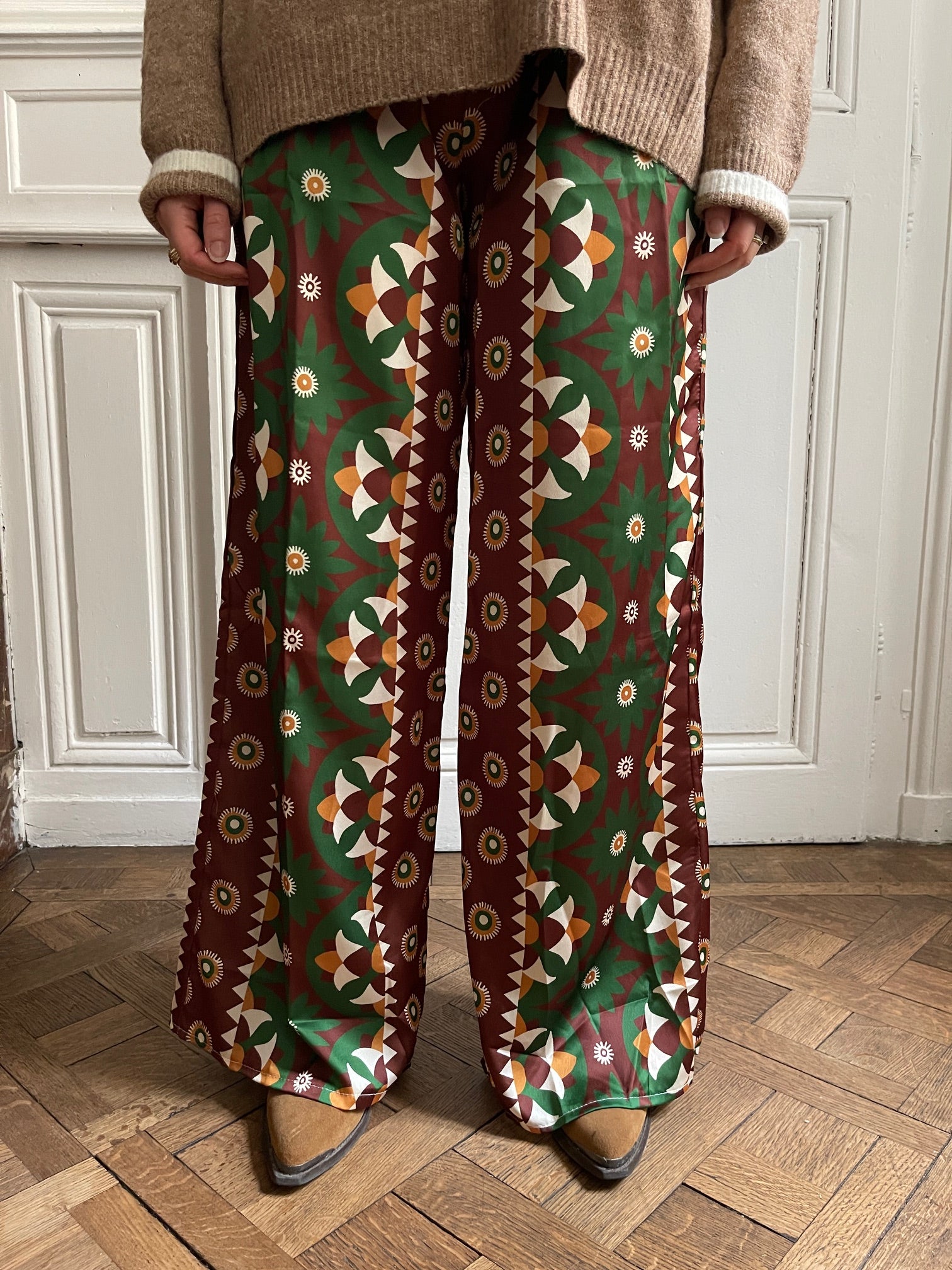 Embrace comfort without compromising on style with these flowing trousers that drape elegantly. Their geometric print in shades of green, brown, mustard, and white catches the eye and adds a touch of originality to your outfits. Designed with an elasticated waistband for optimal comfort and two practical patch pockets, they can be worn casually with sneakers or dressed up with ankle boots or sandals. These trousers are designed for those who love to combine freedom of movement with a confident style. Their loose, flowing cut makes them comfortable to wear all day long, while subtly enhancing your figure. Size: M/L = 38-40. Made in Italy. Material: 100% polyester. Care: Machine wash at 30 degrees and 800 rpm.
