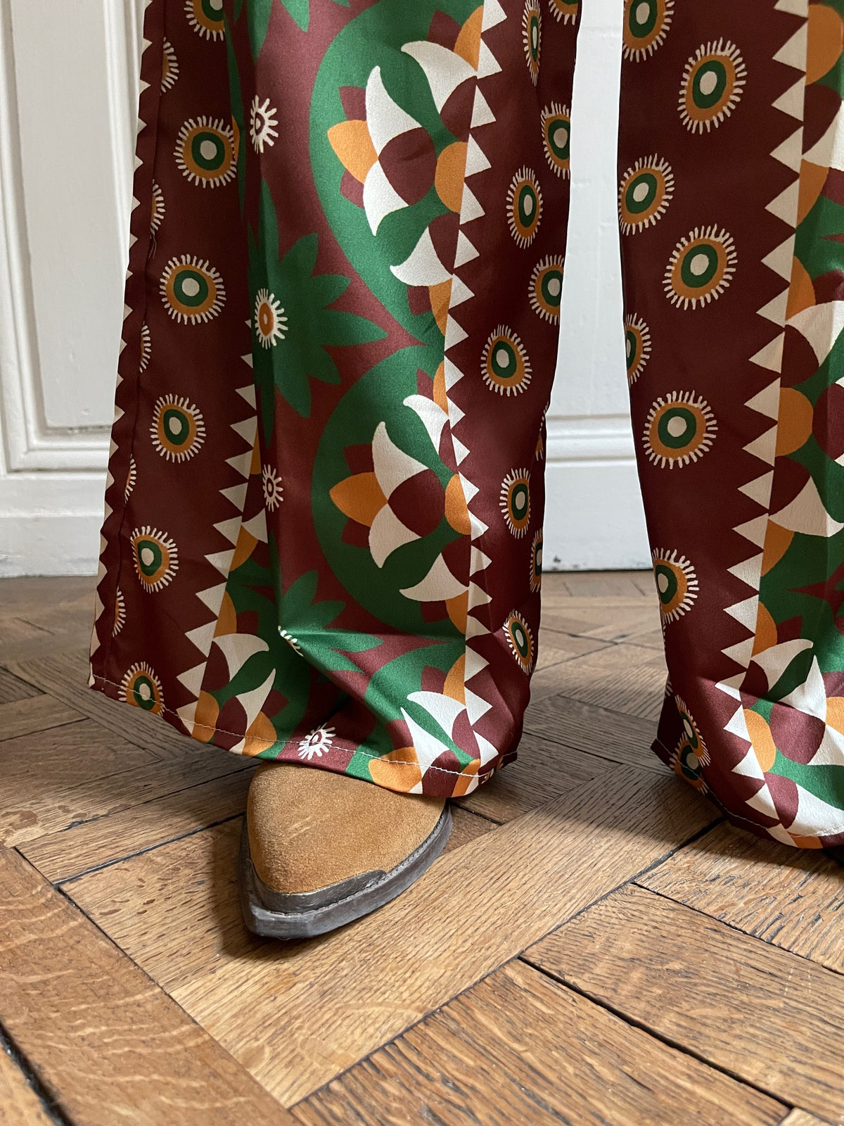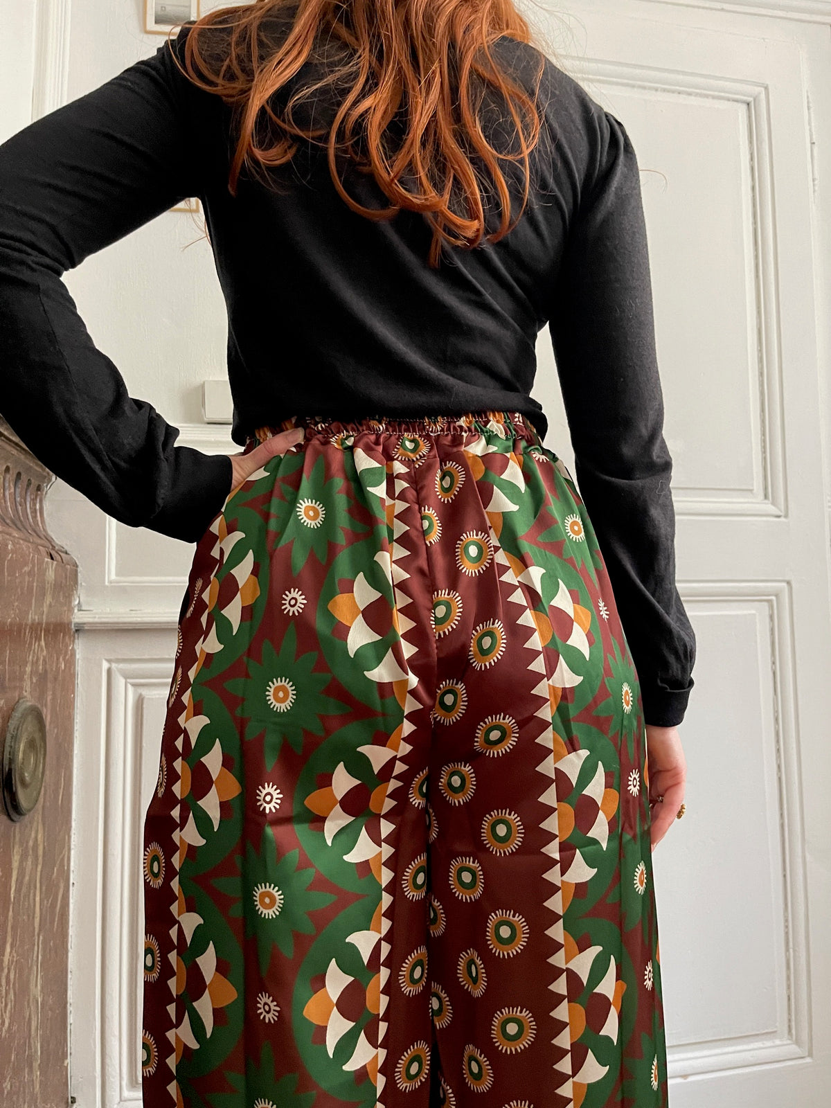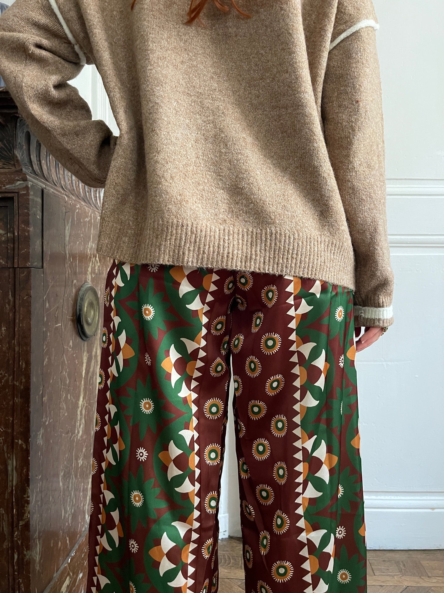 Embrace comfort without compromising on style with these flowing trousers that drape elegantly. Their geometric print in shades of green, brown, mustard, and white catches the eye and adds a touch of originality to your outfits. Designed with an elasticated waistband for optimal comfort and two practical patch pockets, they can be worn casually with sneakers or dressed up with ankle boots or sandals. These trousers are designed for those who love to combine freedom of movement with a confident style. Their loose, flowing cut makes them comfortable to wear all day long, while subtly enhancing your figure. Size: M/L = 38-40. Made in Italy. Material: 100% polyester. Care: Machine wash at 30 degrees and 800 rpm.