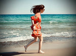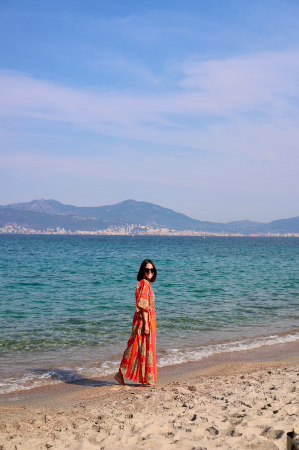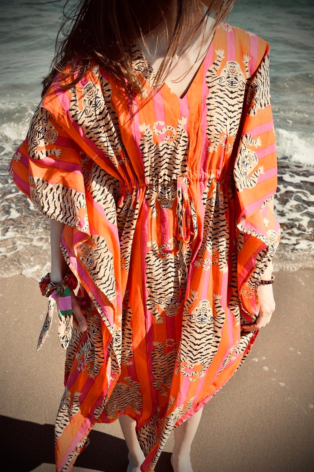 Rokeya cotton kaftan dress with a shallow V-neck. A drawstring under the bust allows for a cinched waist. Made in India to order within one business month.
