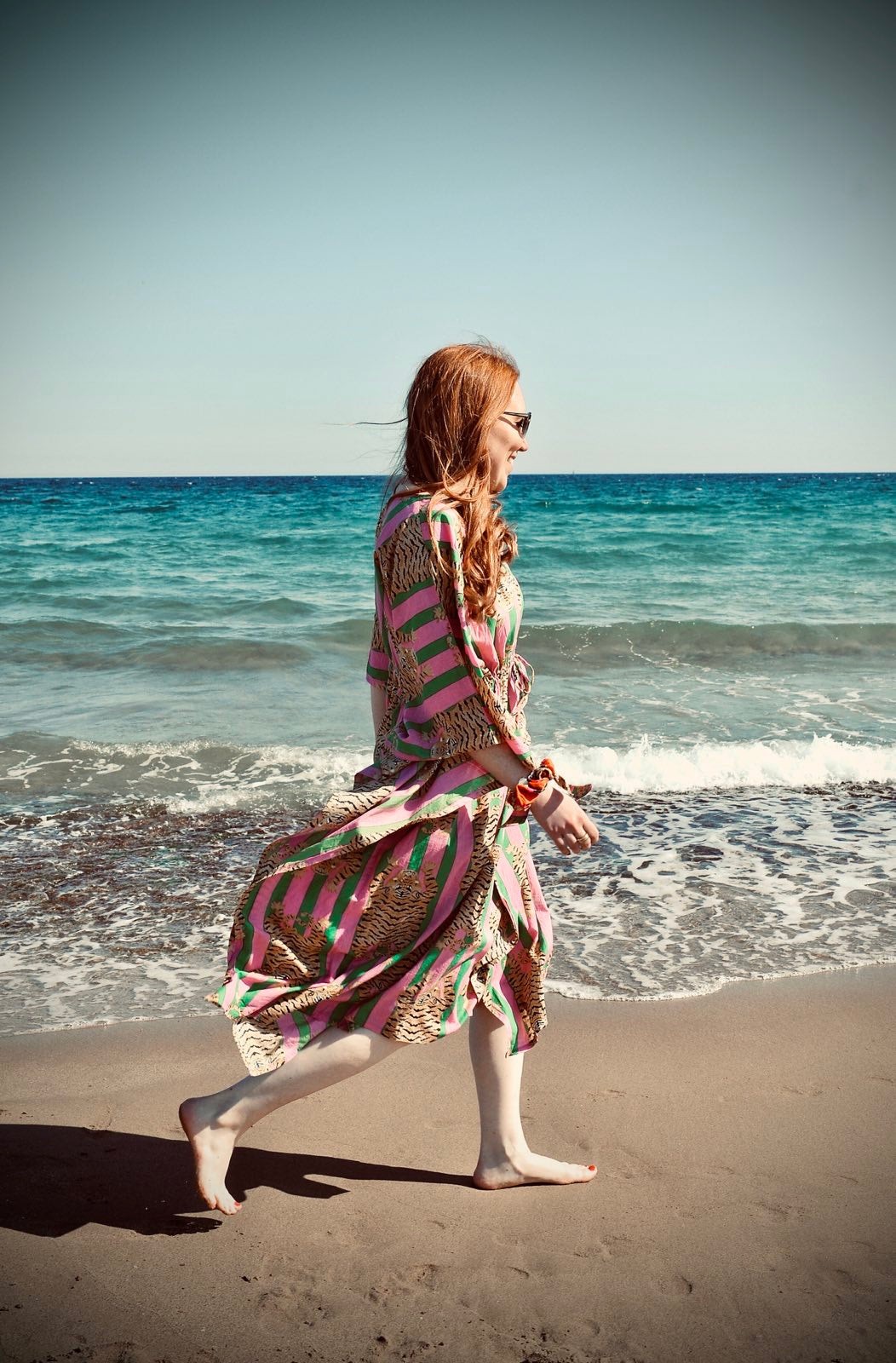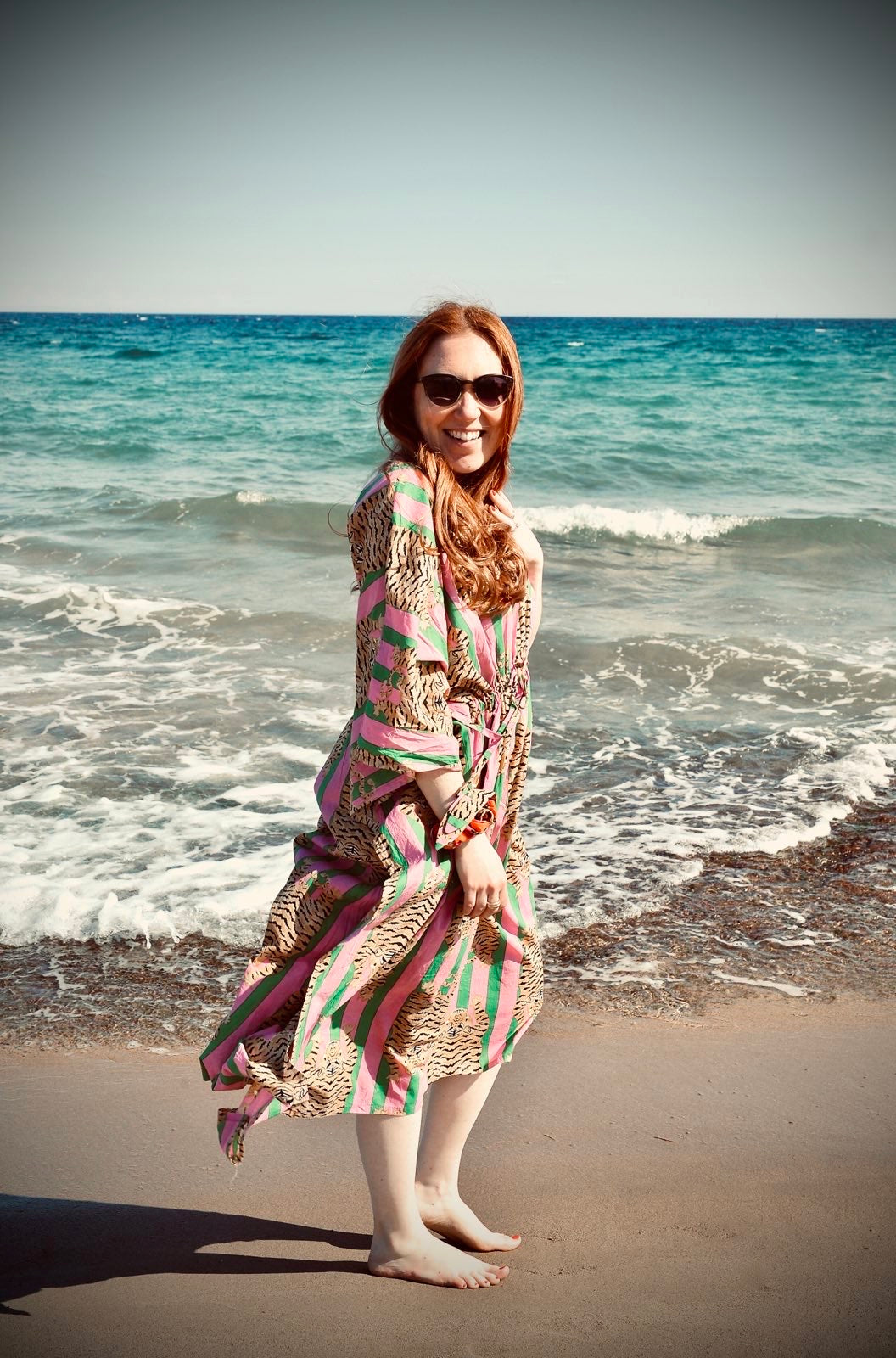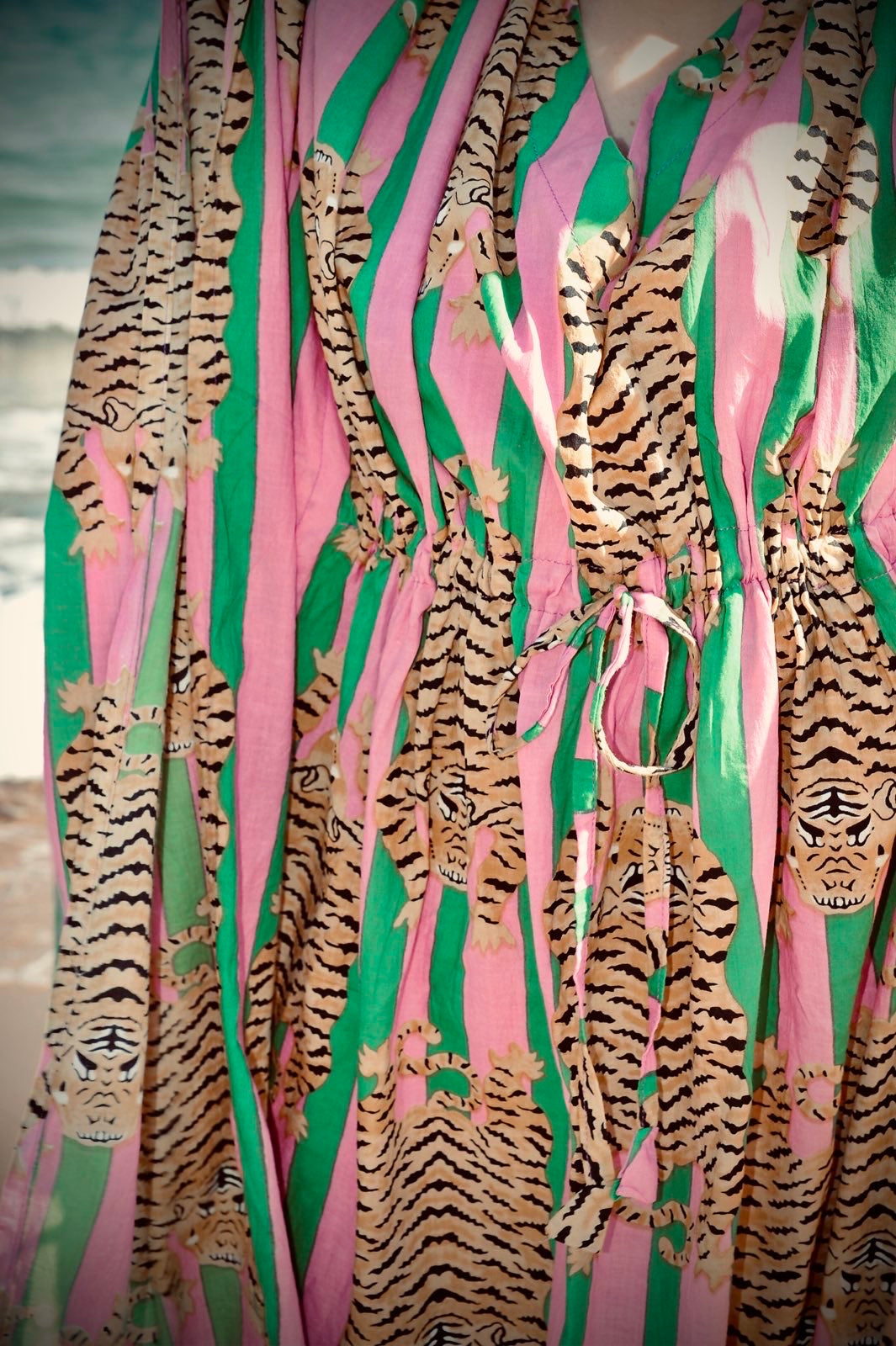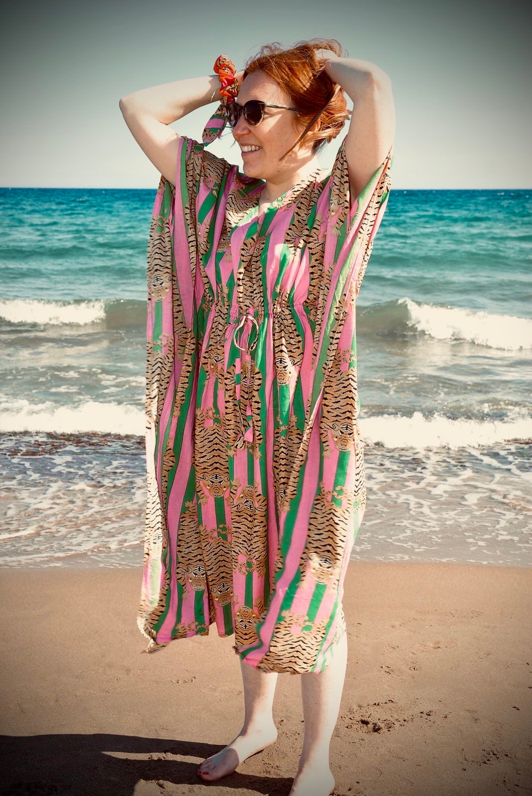 Rokeya kaftan dress in cotton, with a shallow V-neck. Drawstring below the bust to cinch the dress. Made in India to order within one working month.