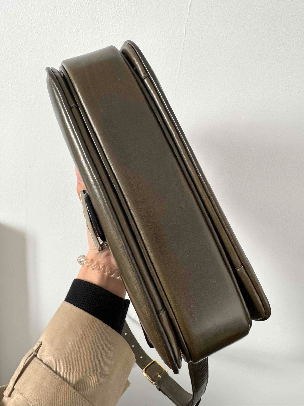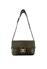 Made of smooth lambskin leather in olive green.
