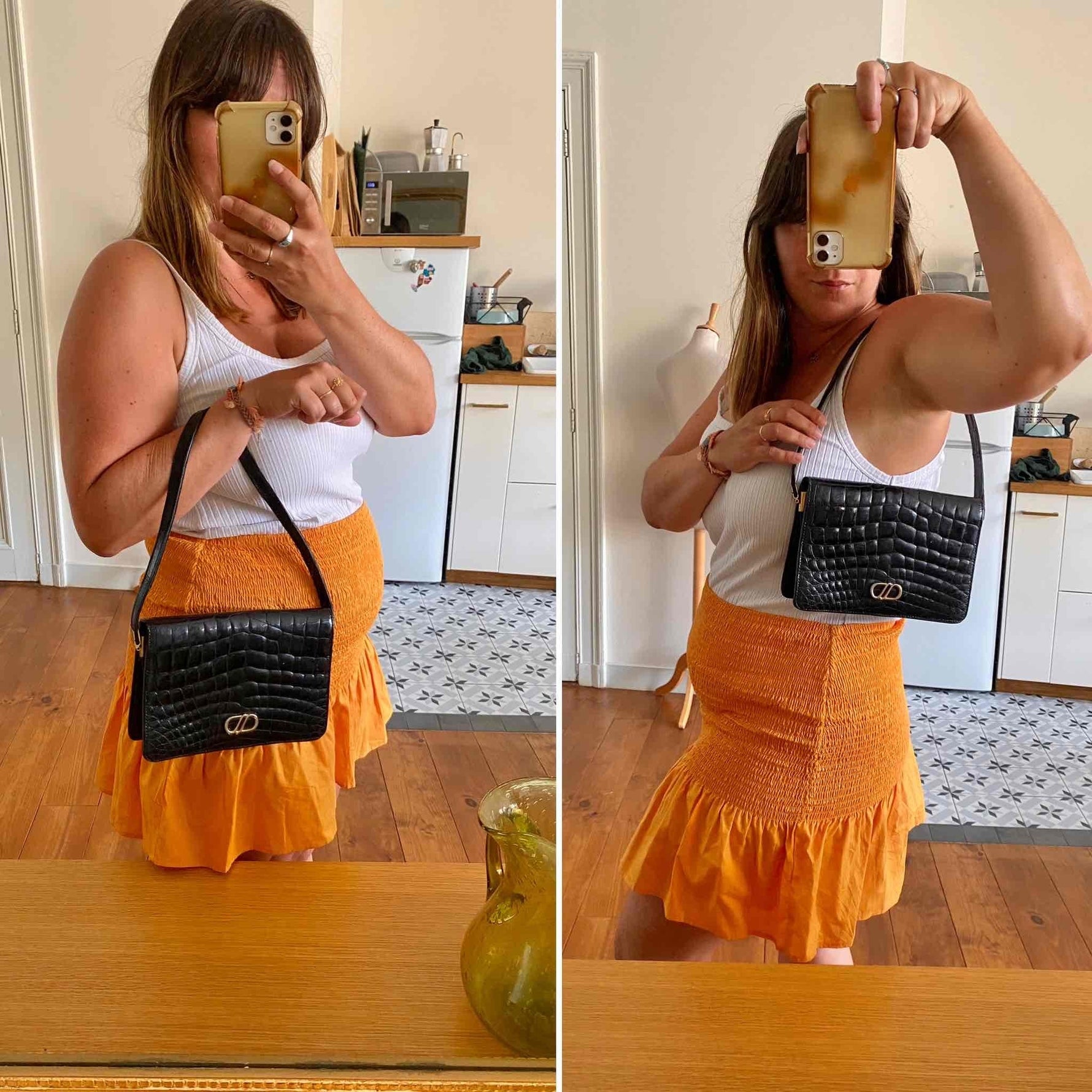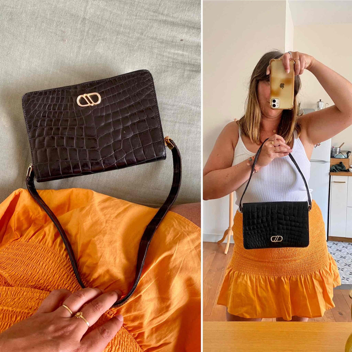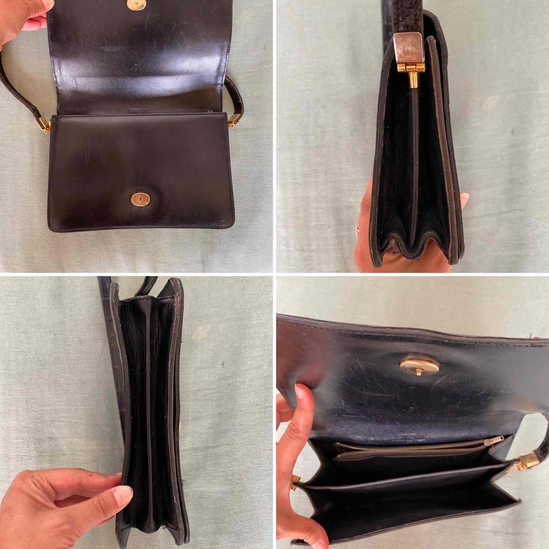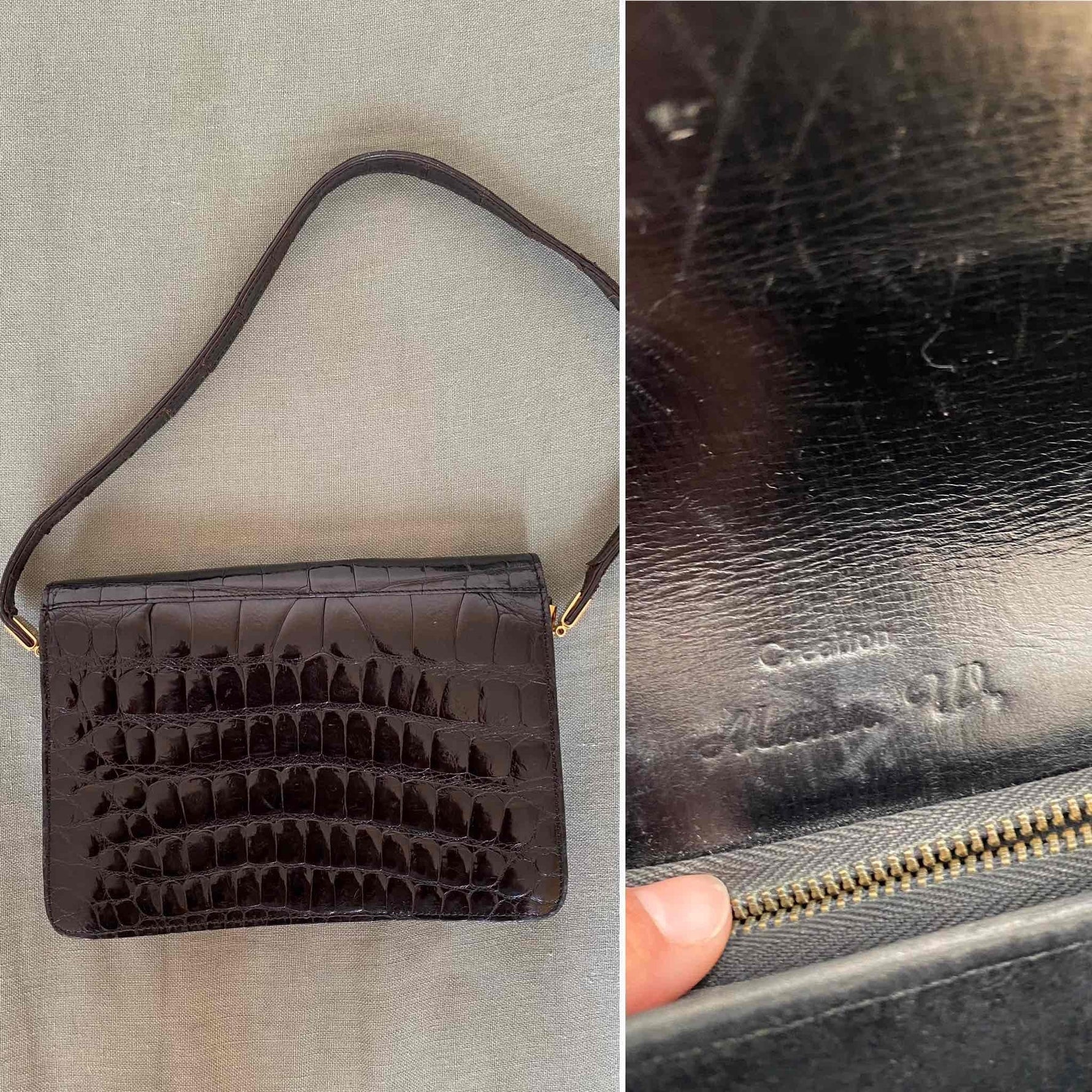 Unit price perBrown-black crocodile leather bag, with gold buckle clasp, for shoulder and hand carrying, several interior compartments and zippered pocket, made in France, L 25 cm x H 16 cm x D 5 cm, handle height 24 cm.