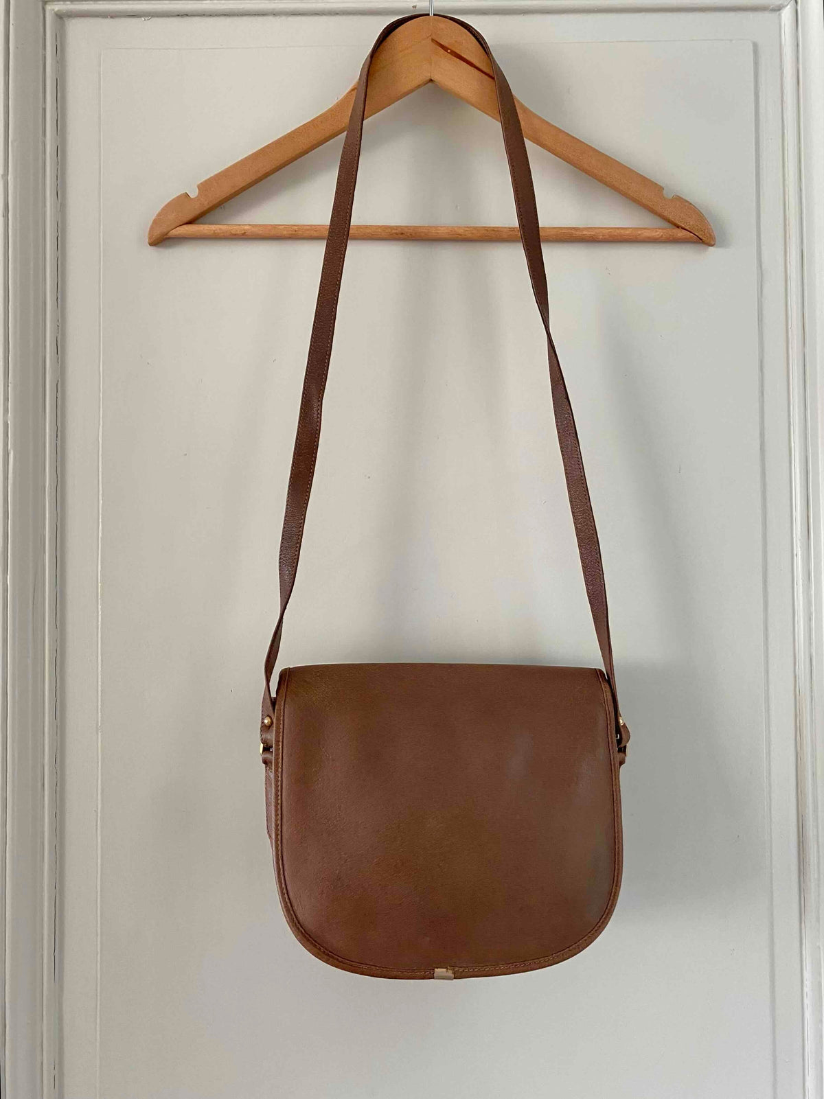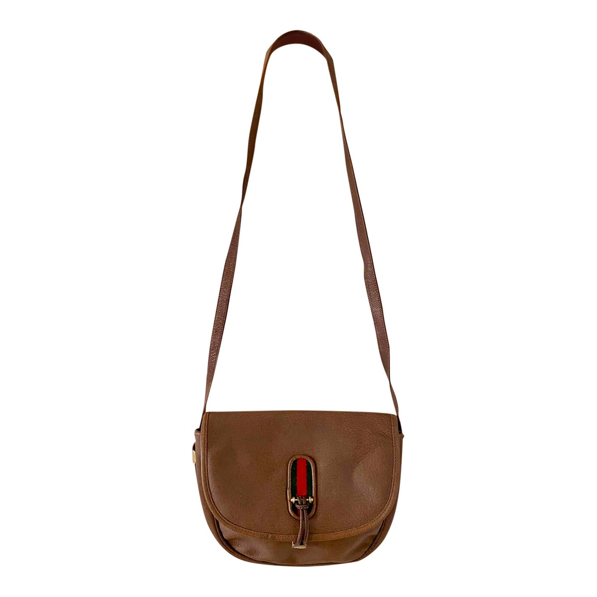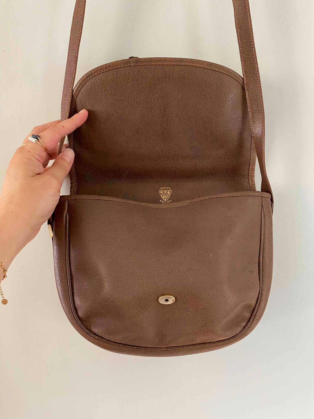 Unit price perGucci 70's leather bag, brown leather, gold-toned engraved clasp, signature red and green ribbon stripe, velvet interior, shoulder bag, made in Italy, 70's model, H 21cm x W 24cm x D 6cm, shoulder strap height 50cm.