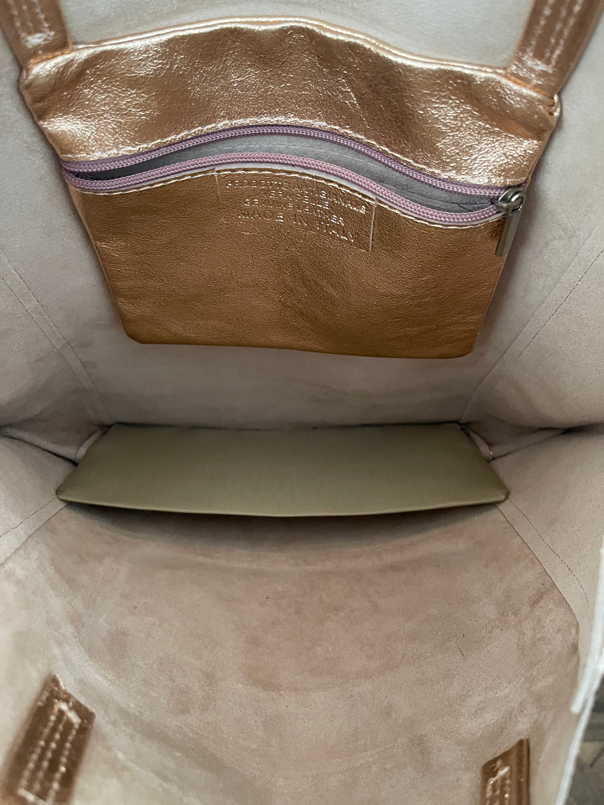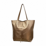 Combine practicality and elegance with this supple cowhide leather tote bag, handcrafted in Italy. Its subtle and refined golden hue makes it a must-have that easily complements all your outfits. Featuring comfortable handles, it can be carried over the shoulder. The spacious interior includes a zippered pocket to keep your essentials secure and a reinforced base for added stability. This minimalist yet sophisticated design is perfect for both busy days and getaways. Dimensions: 59 x 28 x 14 cm. Made in Italy. Material: 100% supple cowhide leather. Care: Dry clean