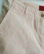 Unit price perHigh-waisted checked shorts with 2 Italian pockets and 2 flap pockets at the back. Pure salmon pink cotton.