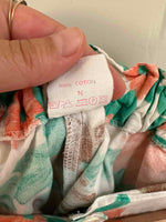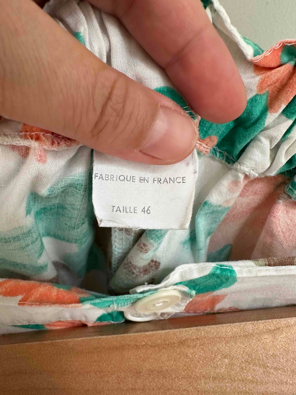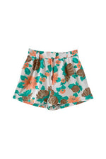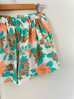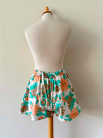 Unit price perFloral shorts, made of 100% white cotton printed with orange and green flowers, button fly, elastic back waistband, flared legs, made in France, size 36 shown here on a size 36 mannequin.